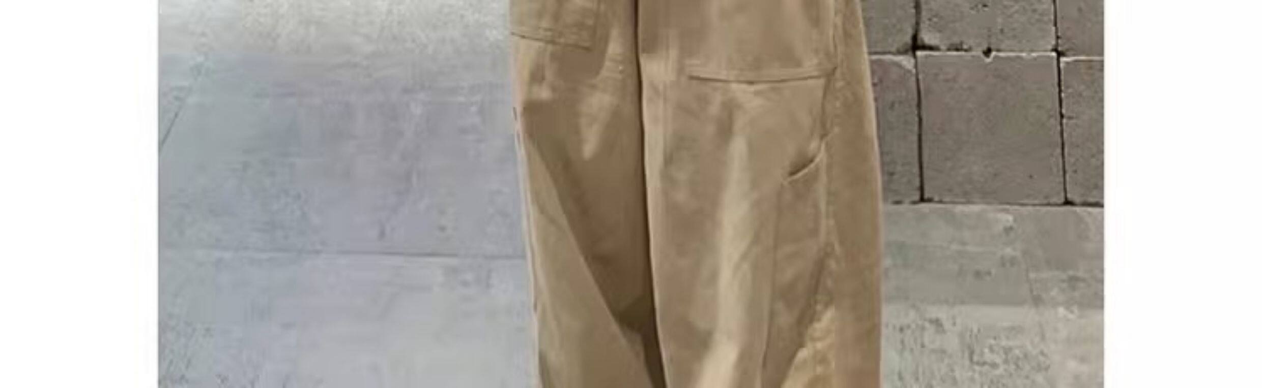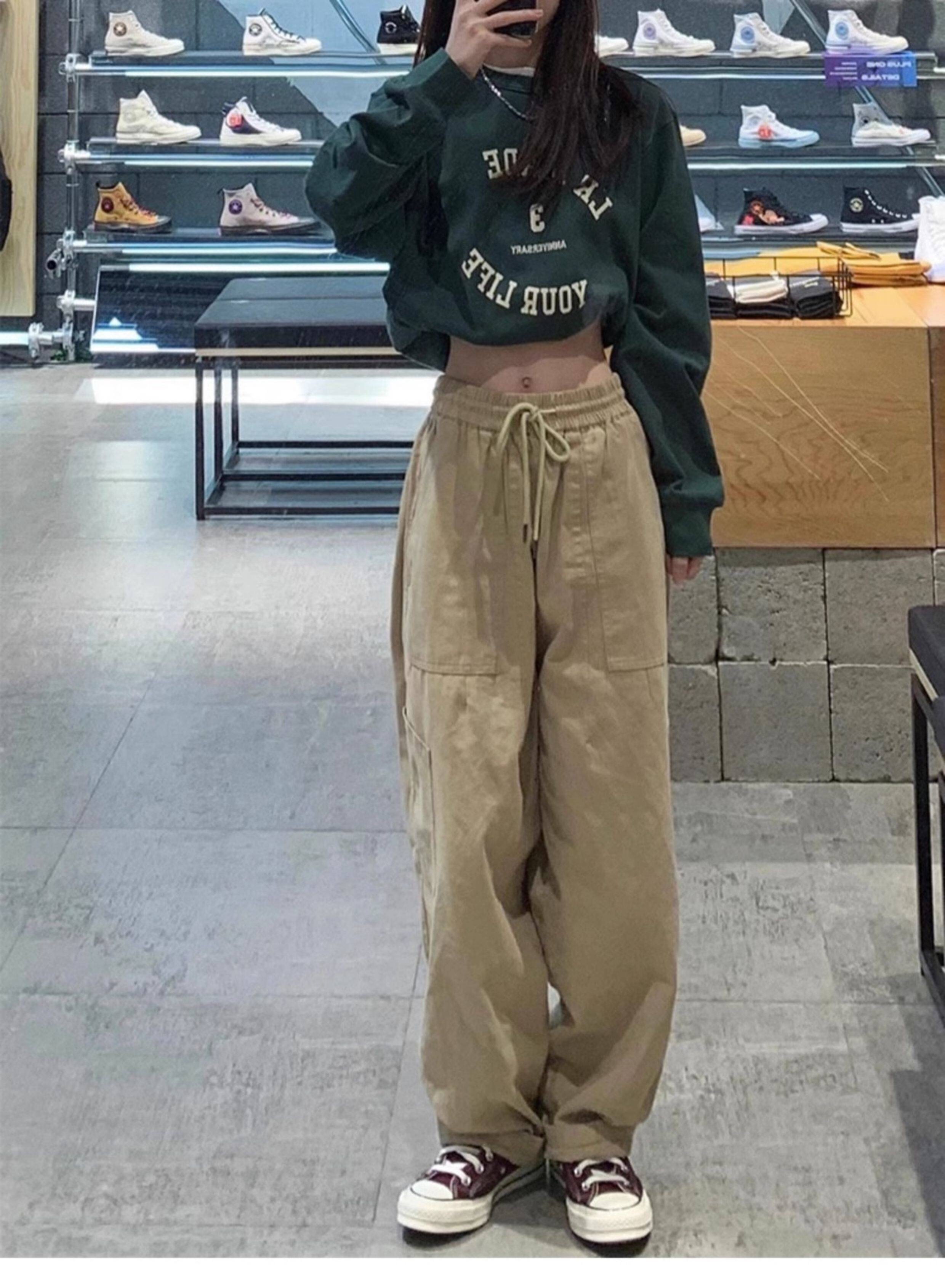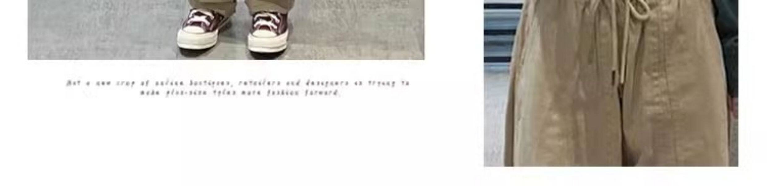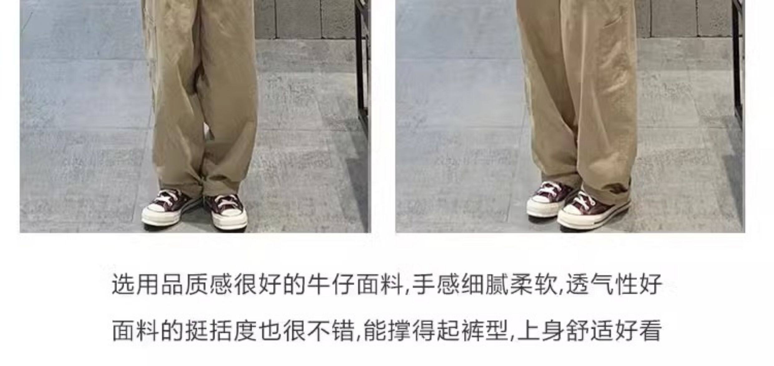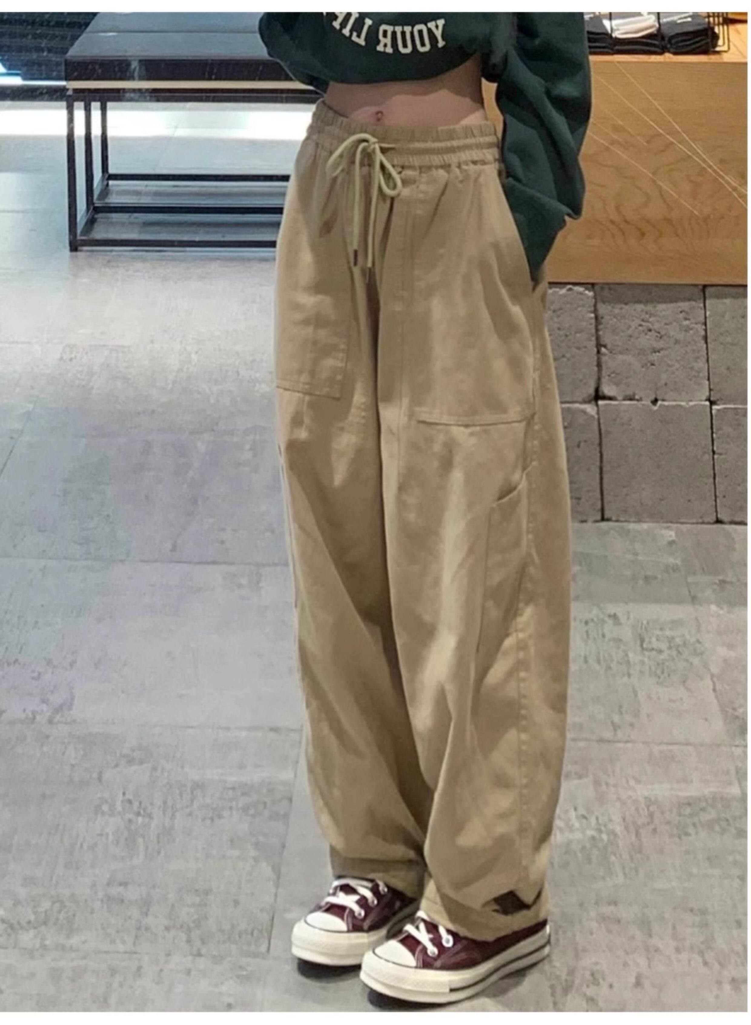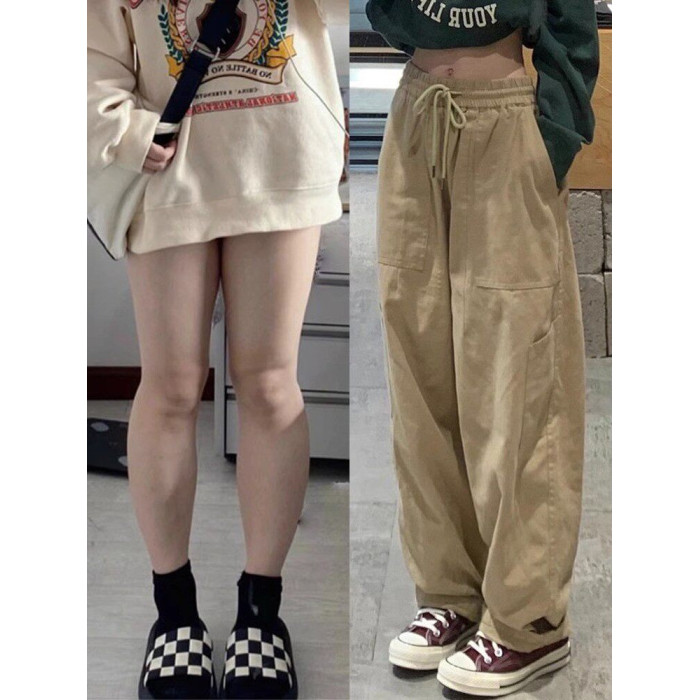卡其色褲子女日系工裝休閒褲高腰直筒大碼胖mm梨形身材寬鬆濶腿褲