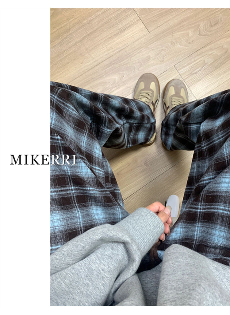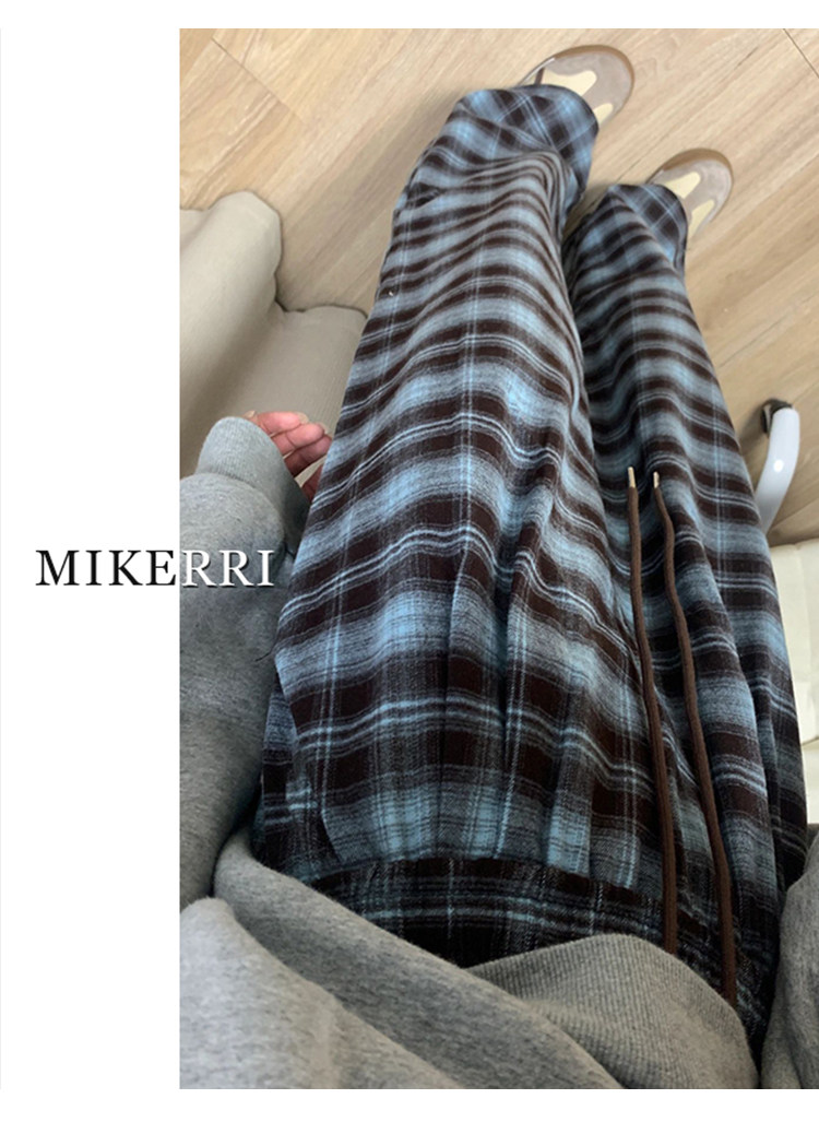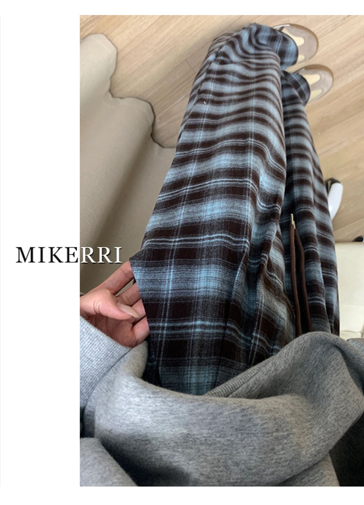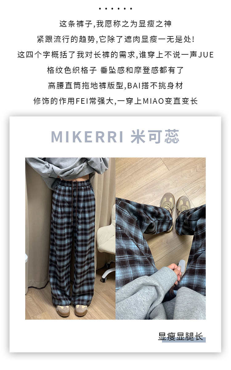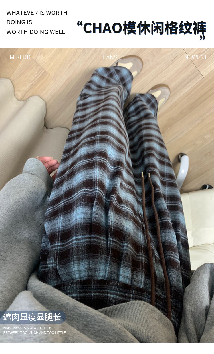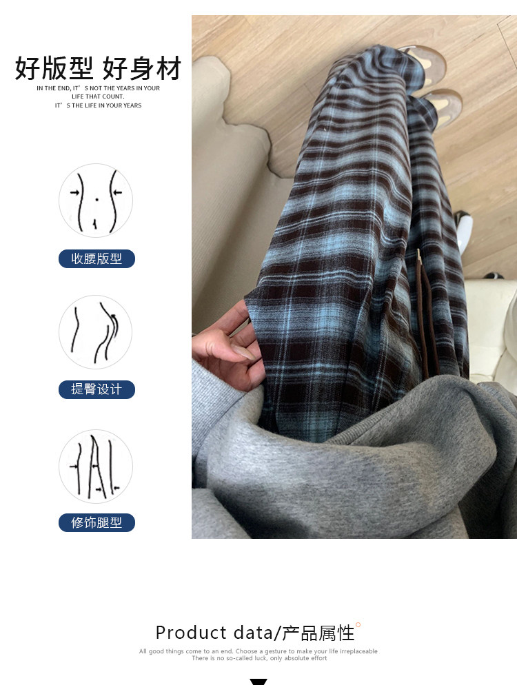 格子休閒褲女直筒秋冬加絨大碼胖mm寬鬆顯瘦梨型身材垂感濶腿褲子