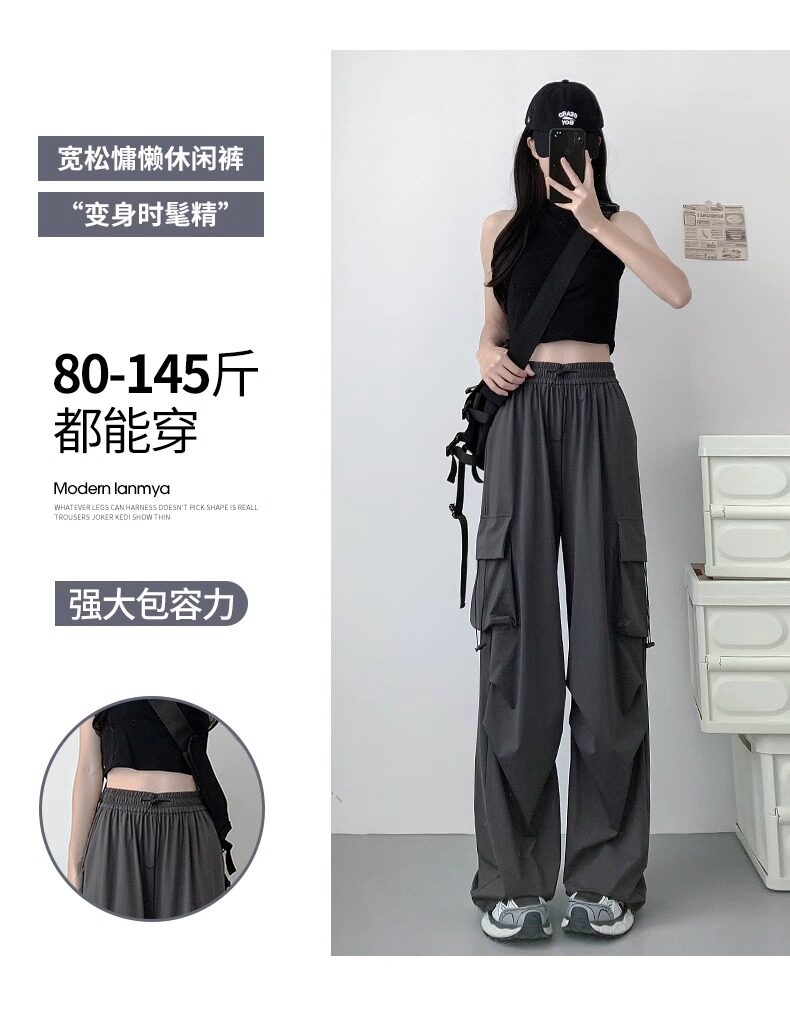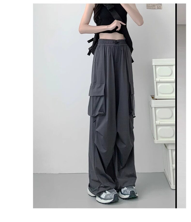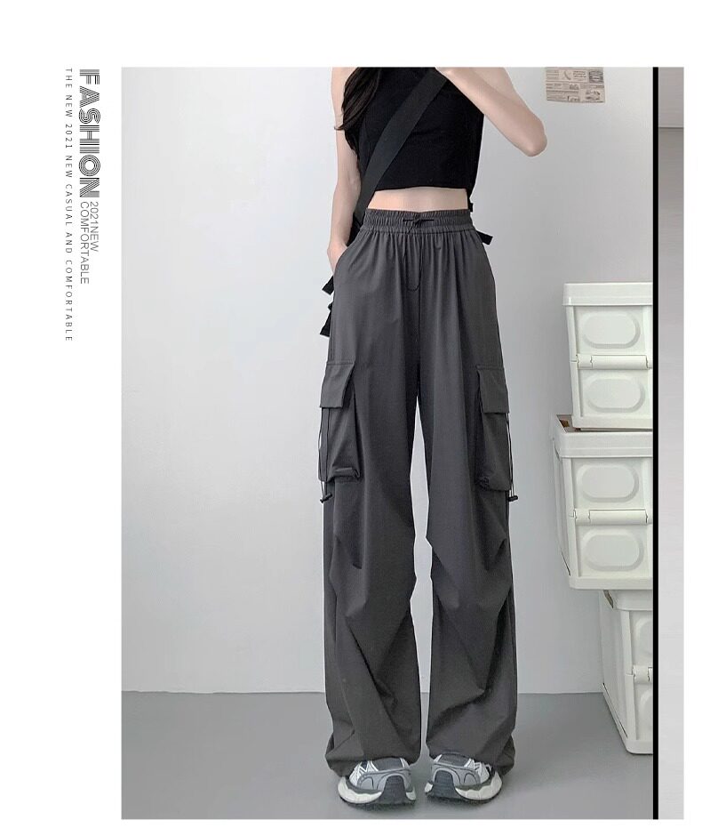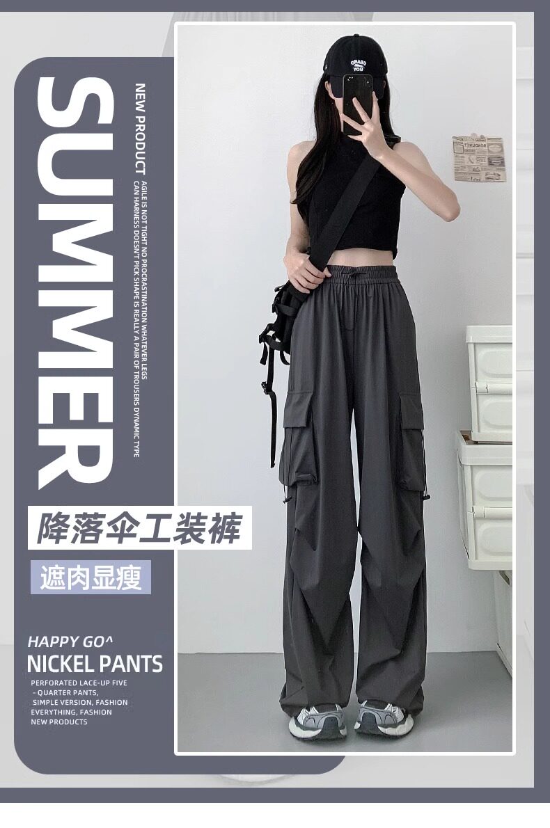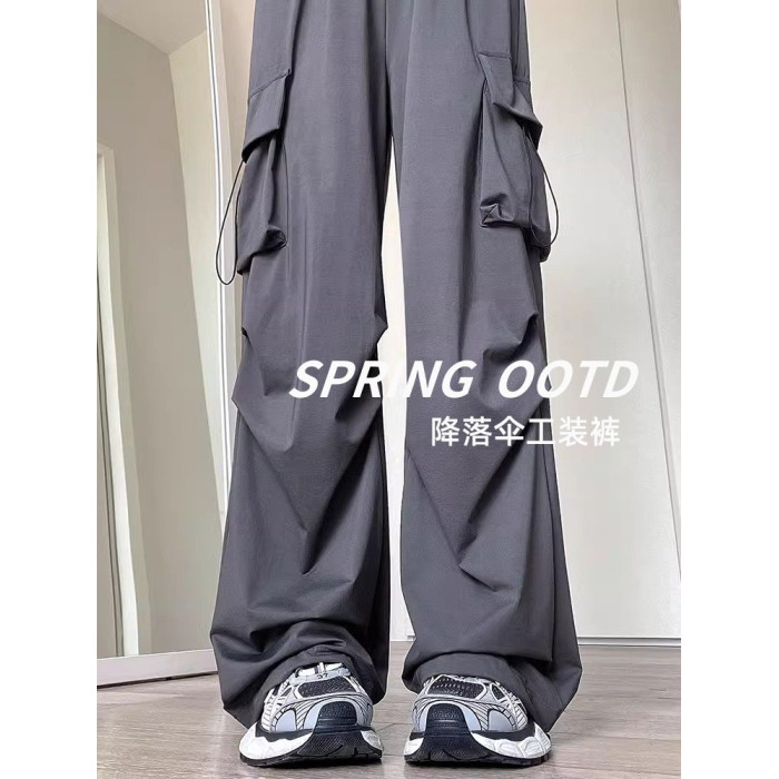 灰色工裝褲子女春秋夏季2025新款小個子寬鬆降落傘垂感美式運動褲