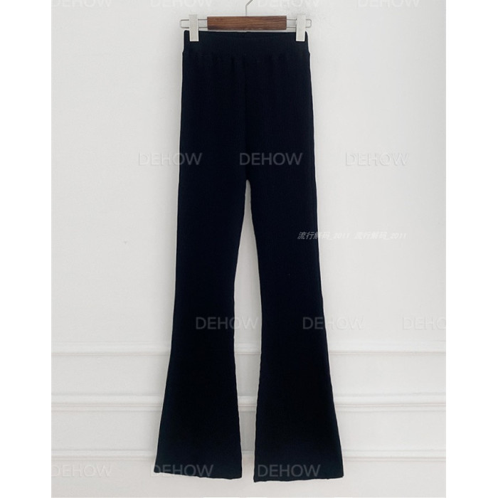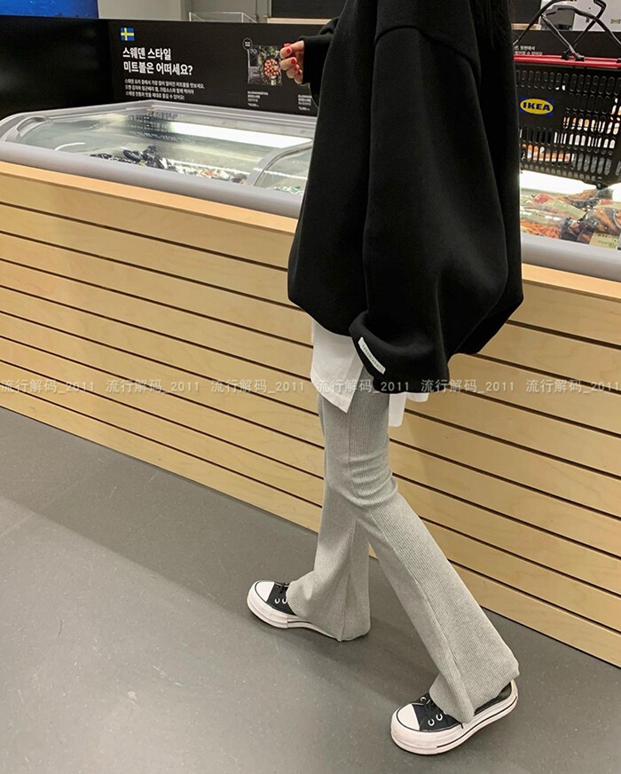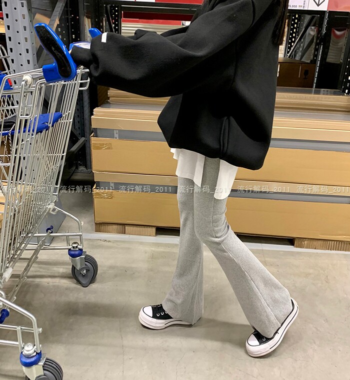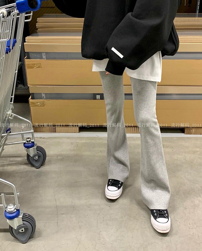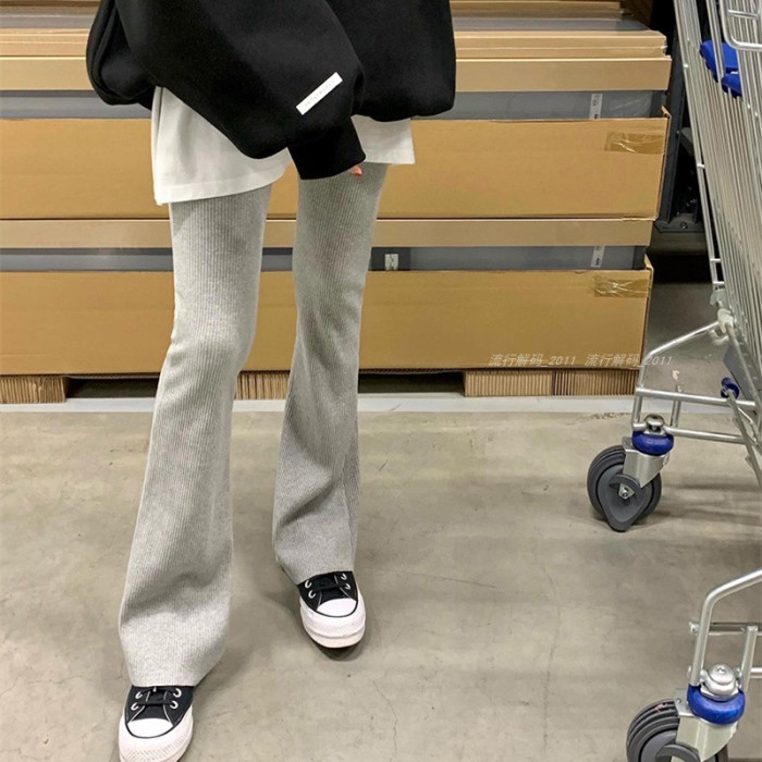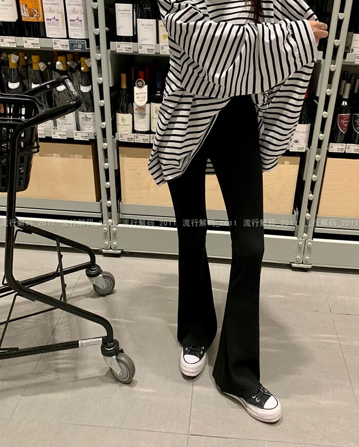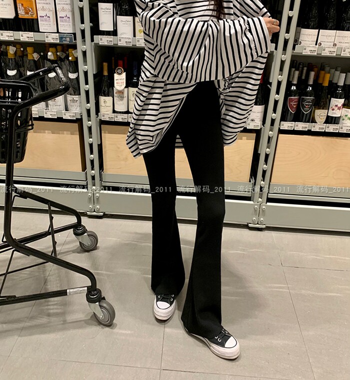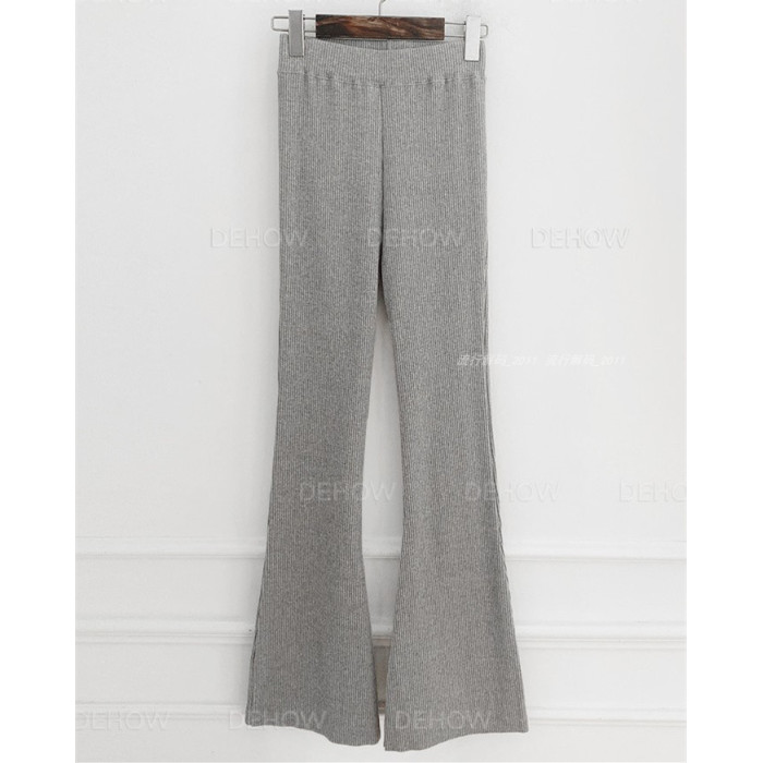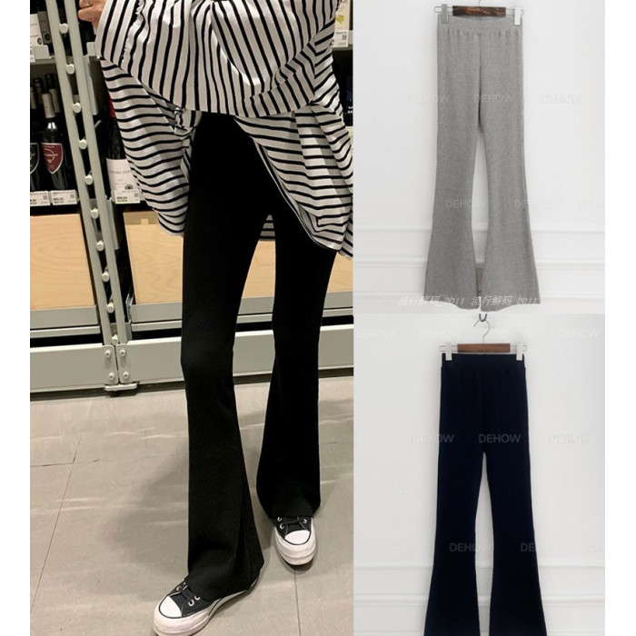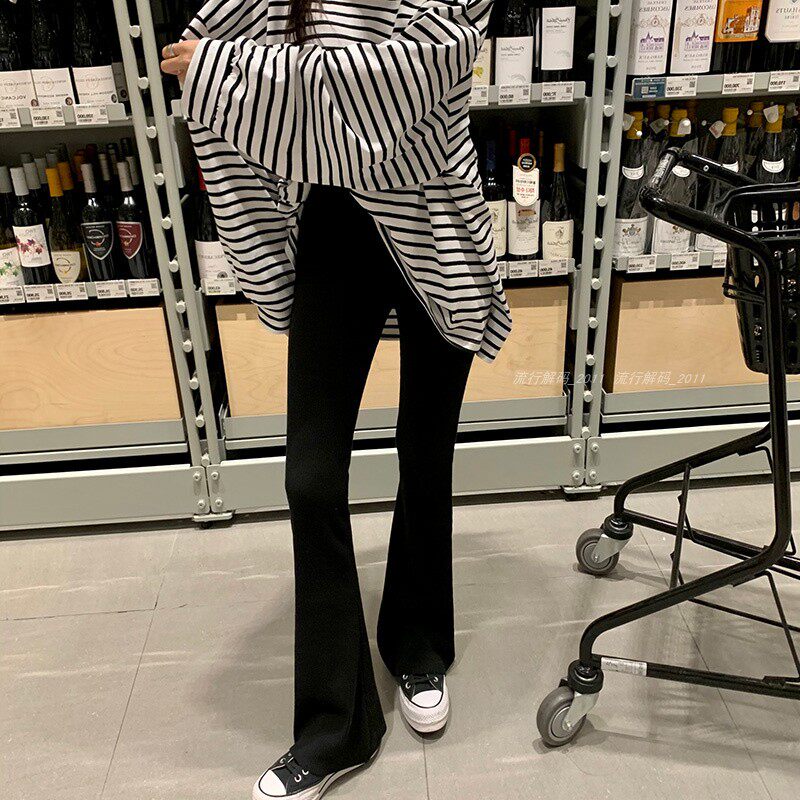 韓國直筒螺紋高腰休閒褲女2024秋季寬鬆微喇叭長褲彈力神奇瘦瘦褲