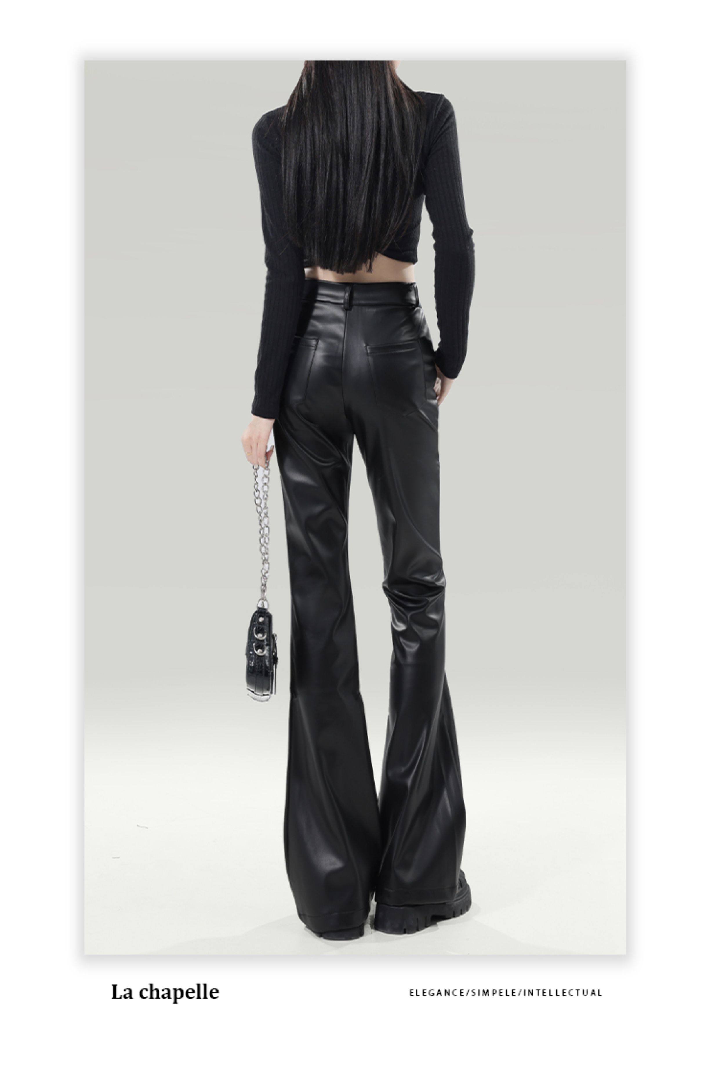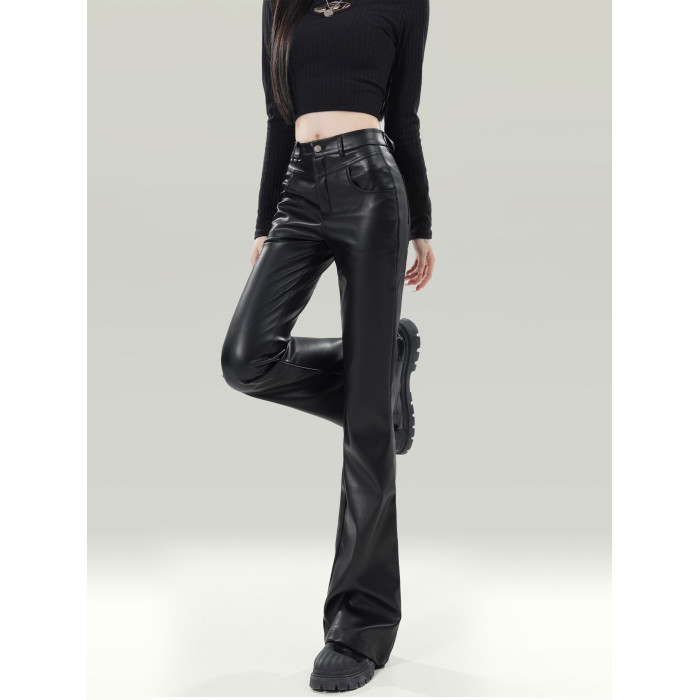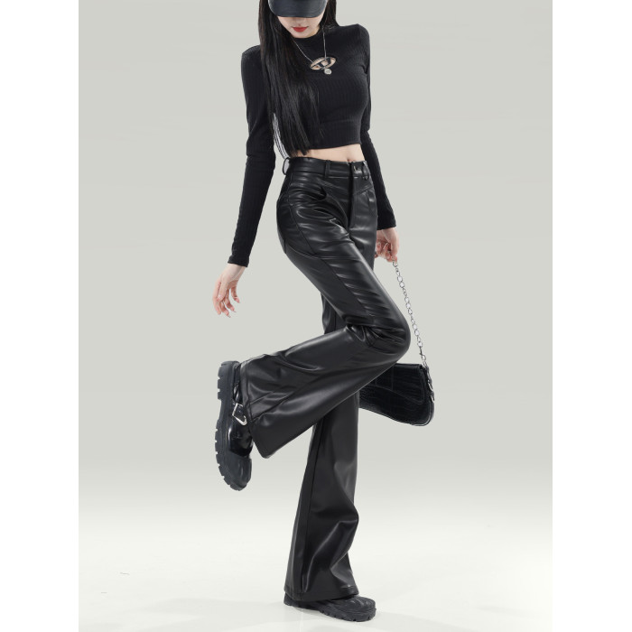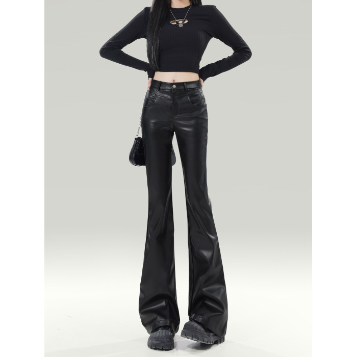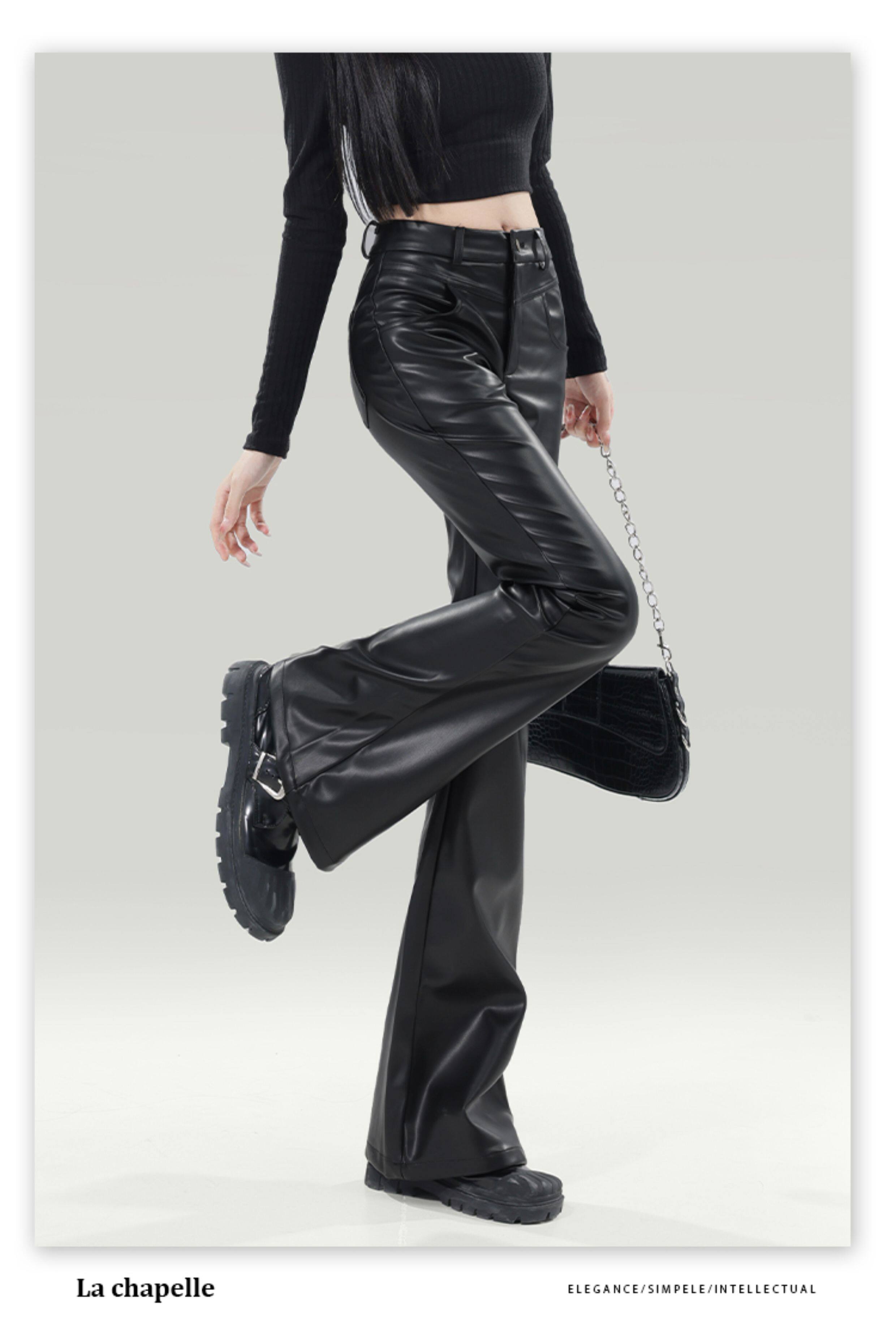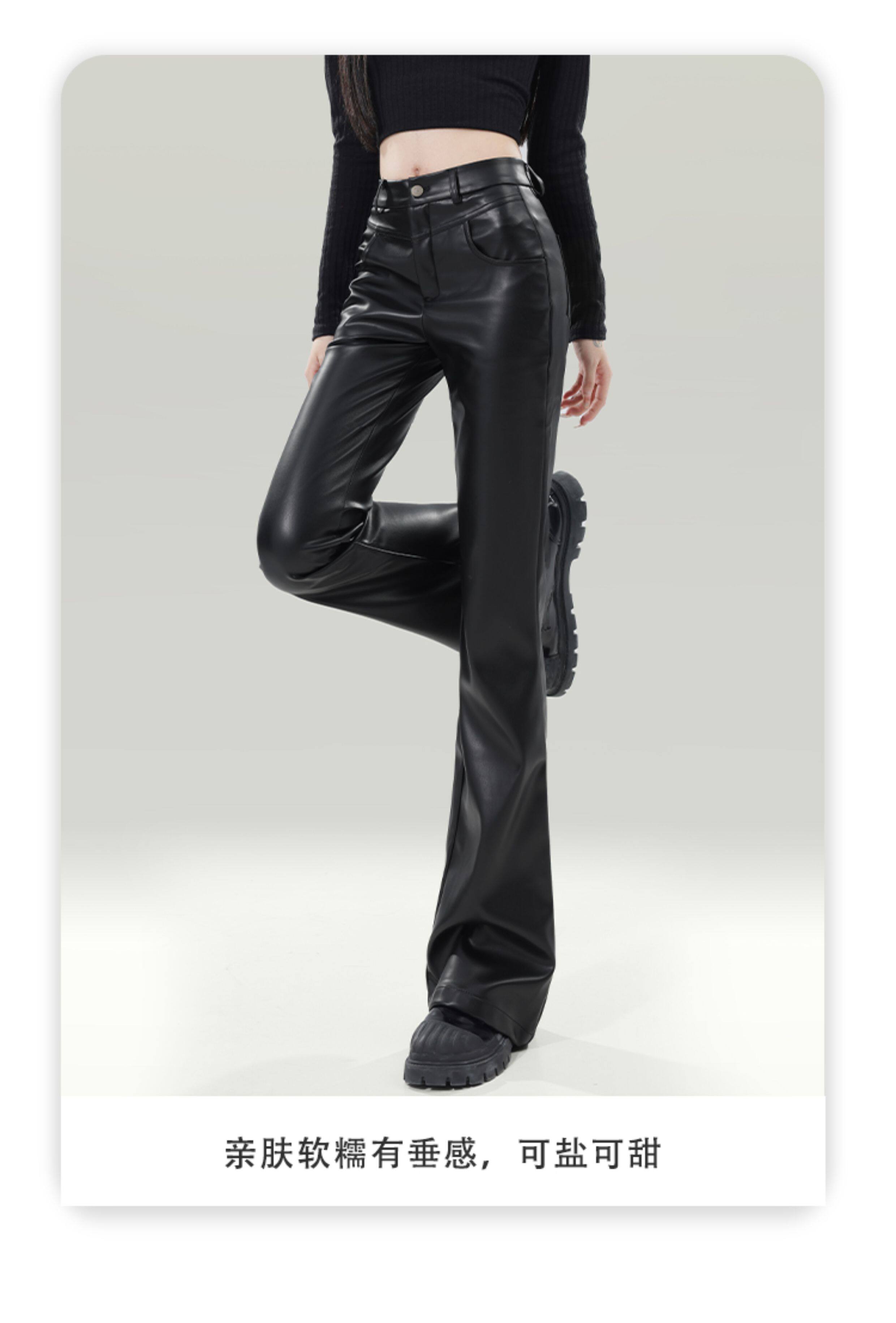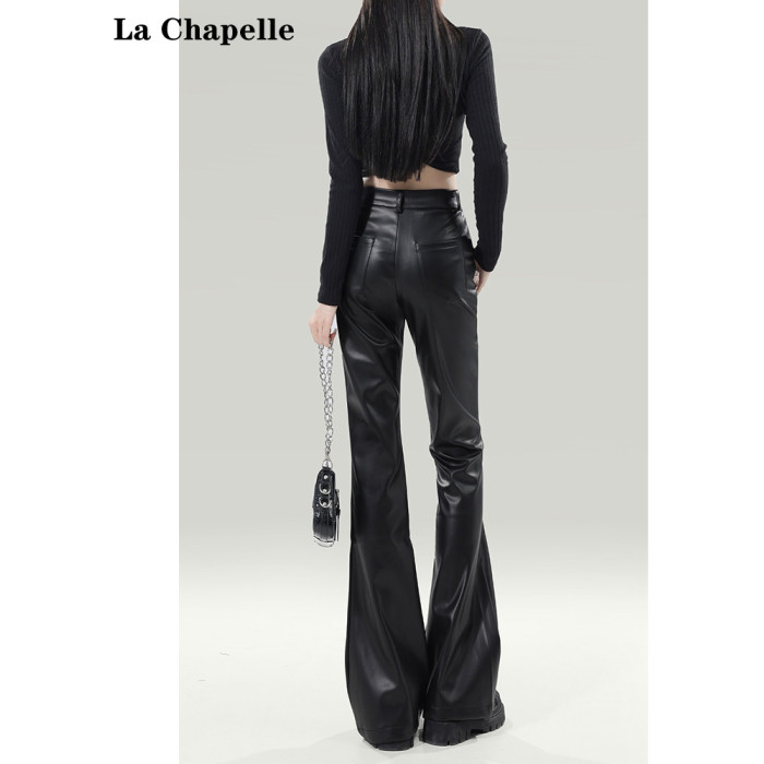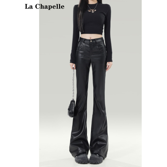 拉夏貝爾黑色皮褲女2025新爆款秋冬加厚小個子高腰休閒微喇叭褲子
