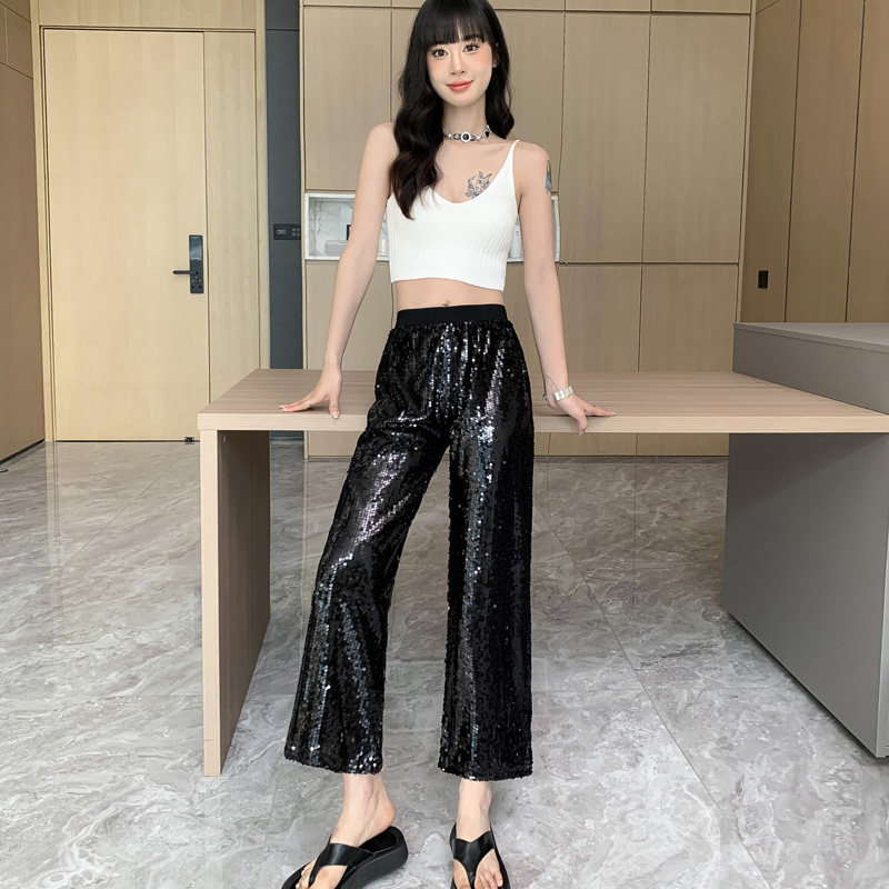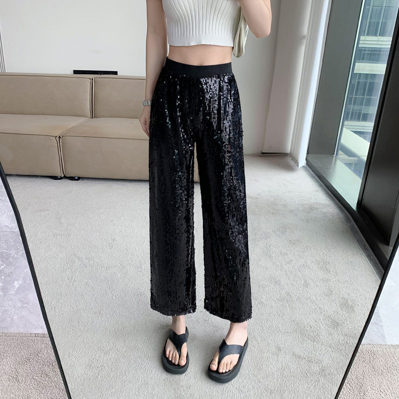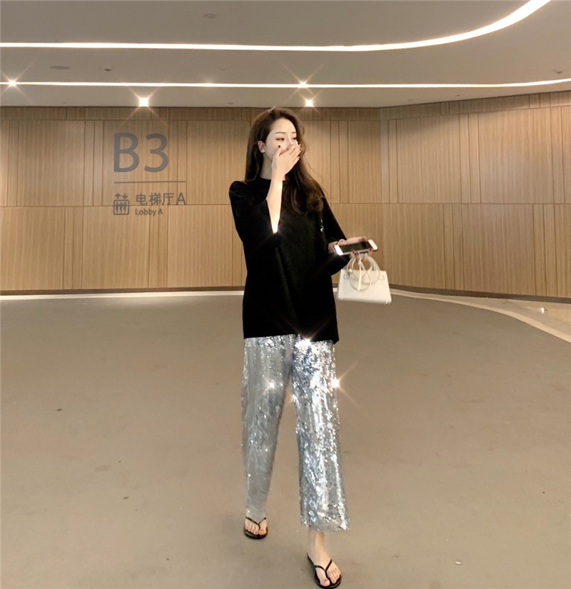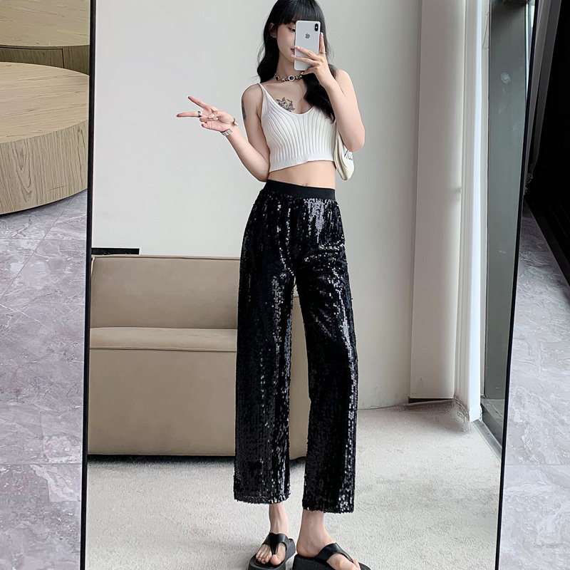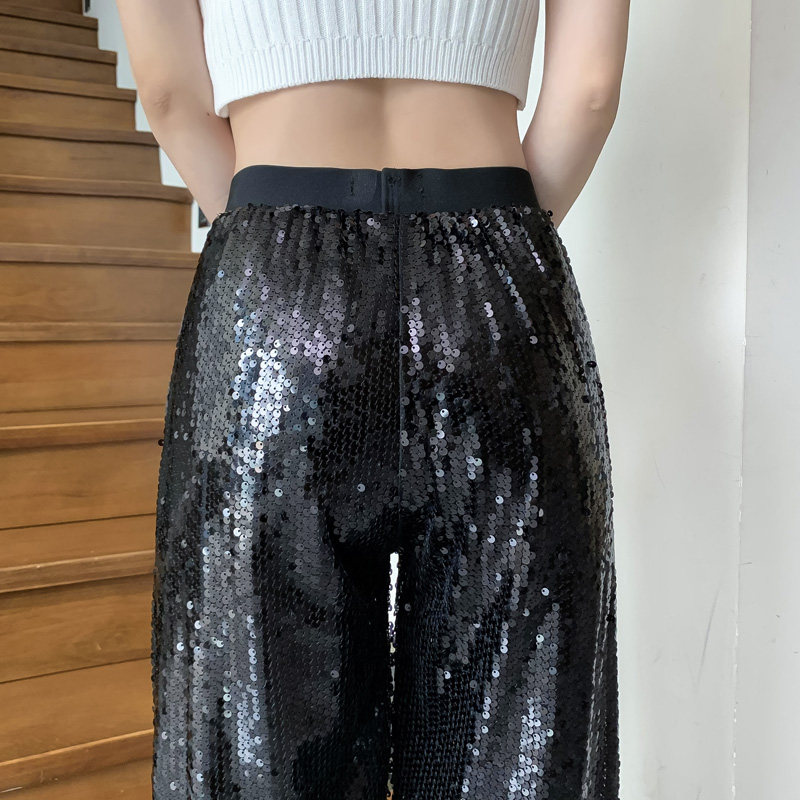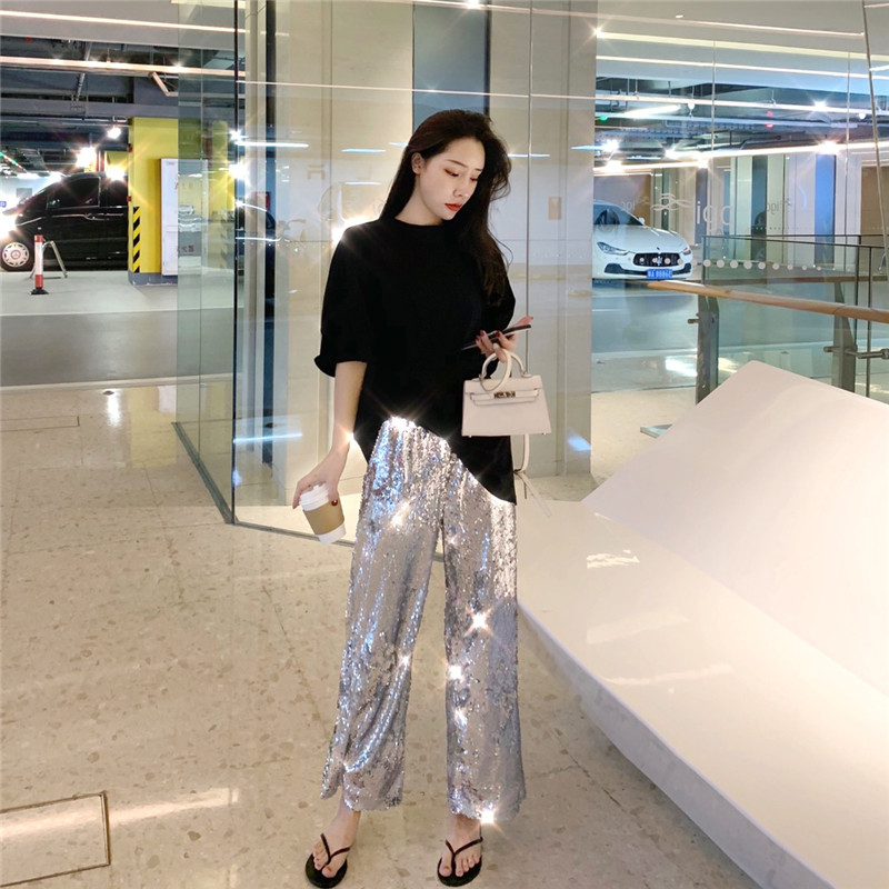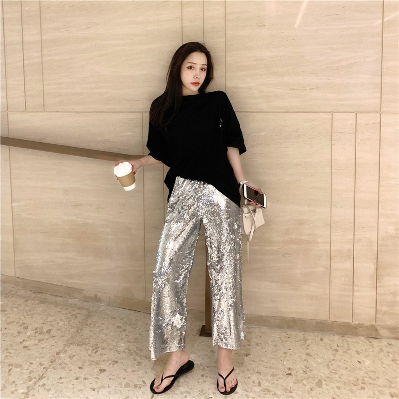 BlingBling銀色亮閃閃亮片下裝松緊腰直筒休閒長褲濶腿九分褲子女