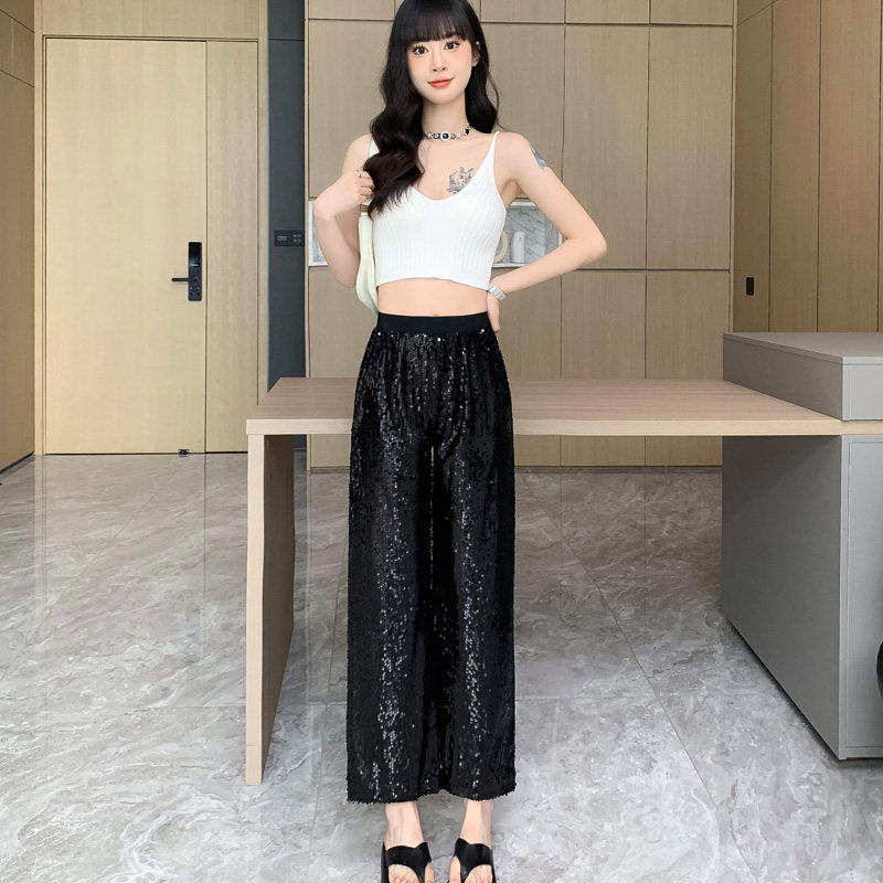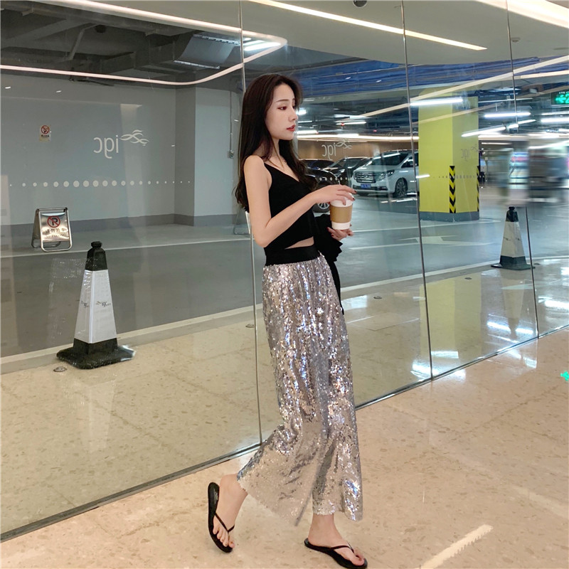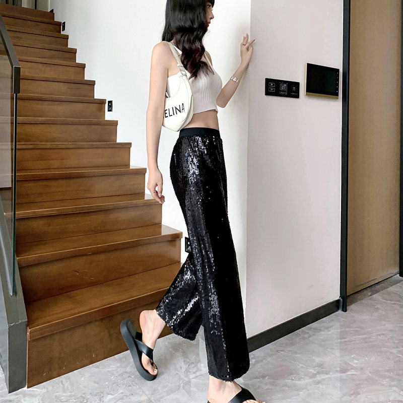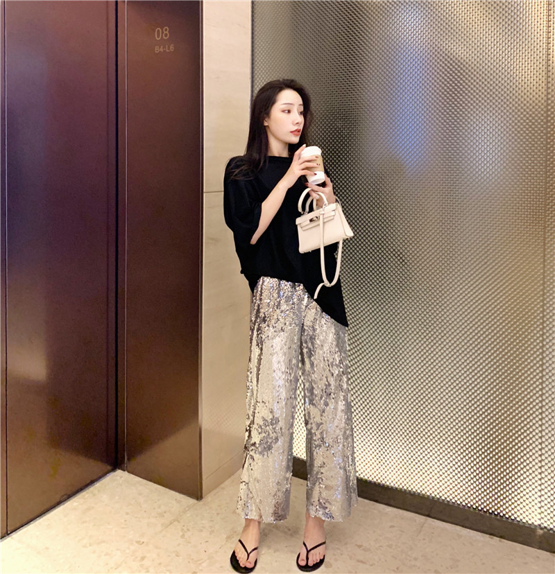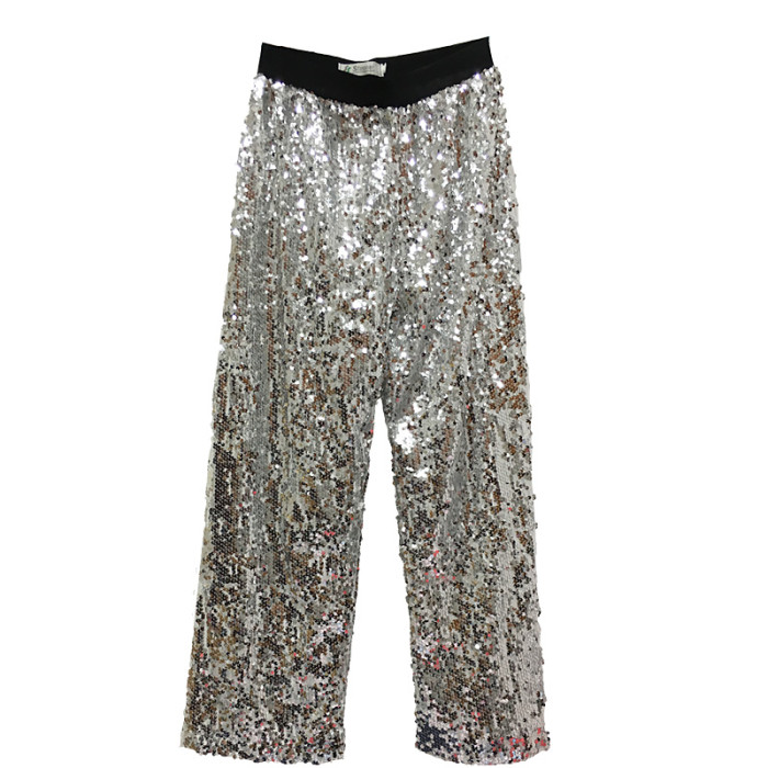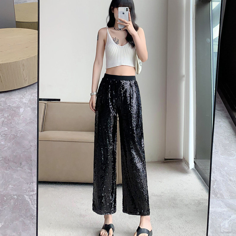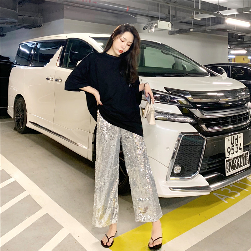 BlingBling銀色亮閃閃亮片下裝松緊腰直筒休閒長褲濶腿九分褲子女