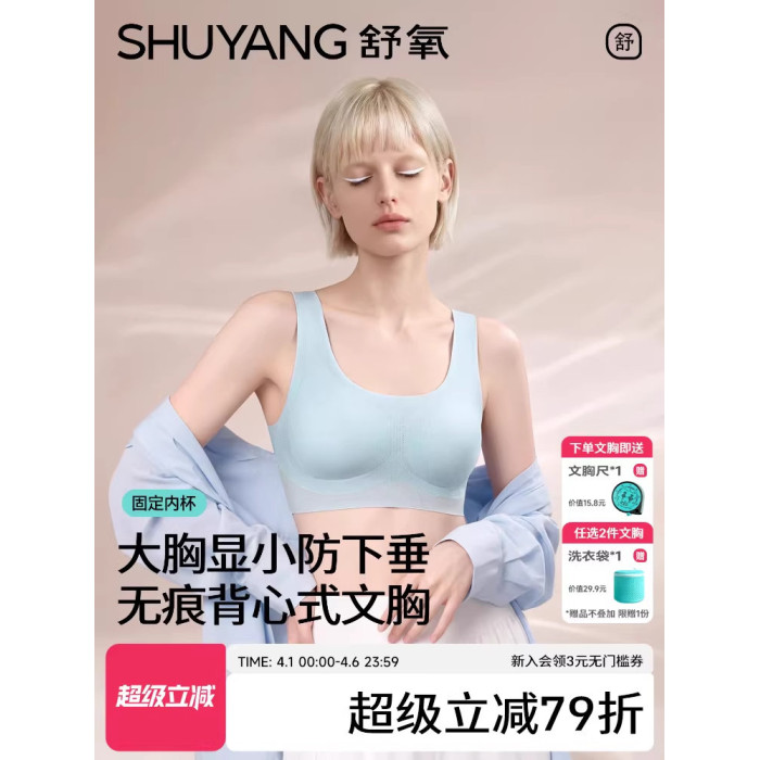 舒氧運動內衣女大胸顯小無痕文胸無鋼圈防下垂薄款背心式一體胸罩