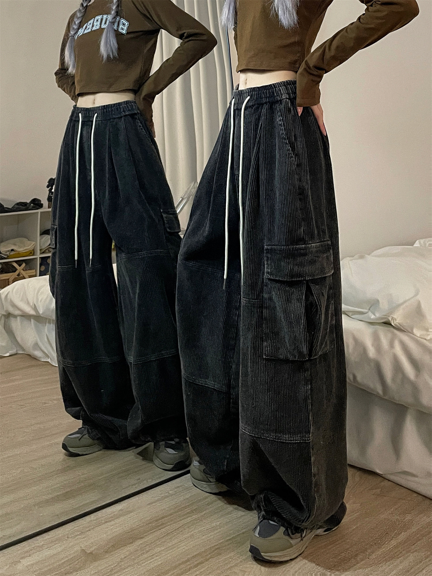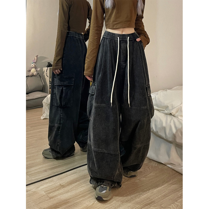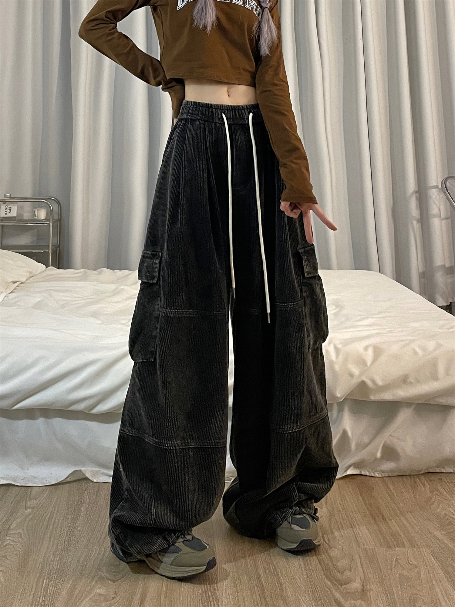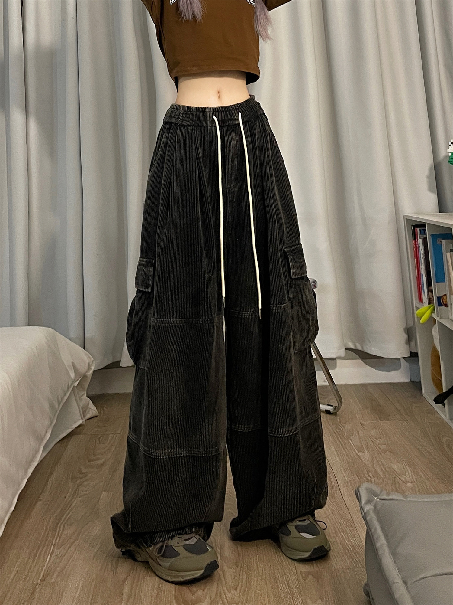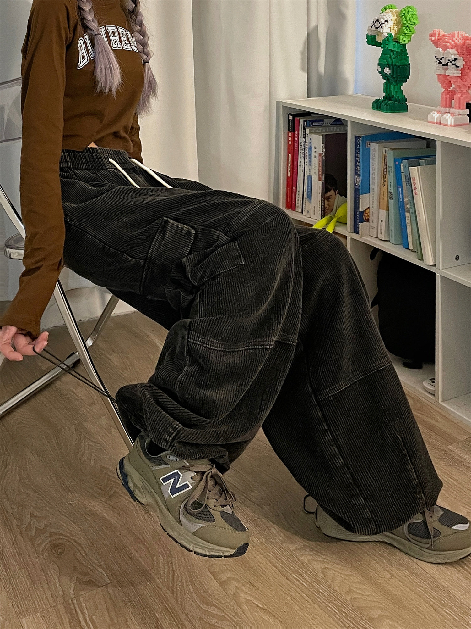 opoism美式復古原創燈芯絨工裝褲女濶腿拖地直筒褲加厚水洗做舊潮