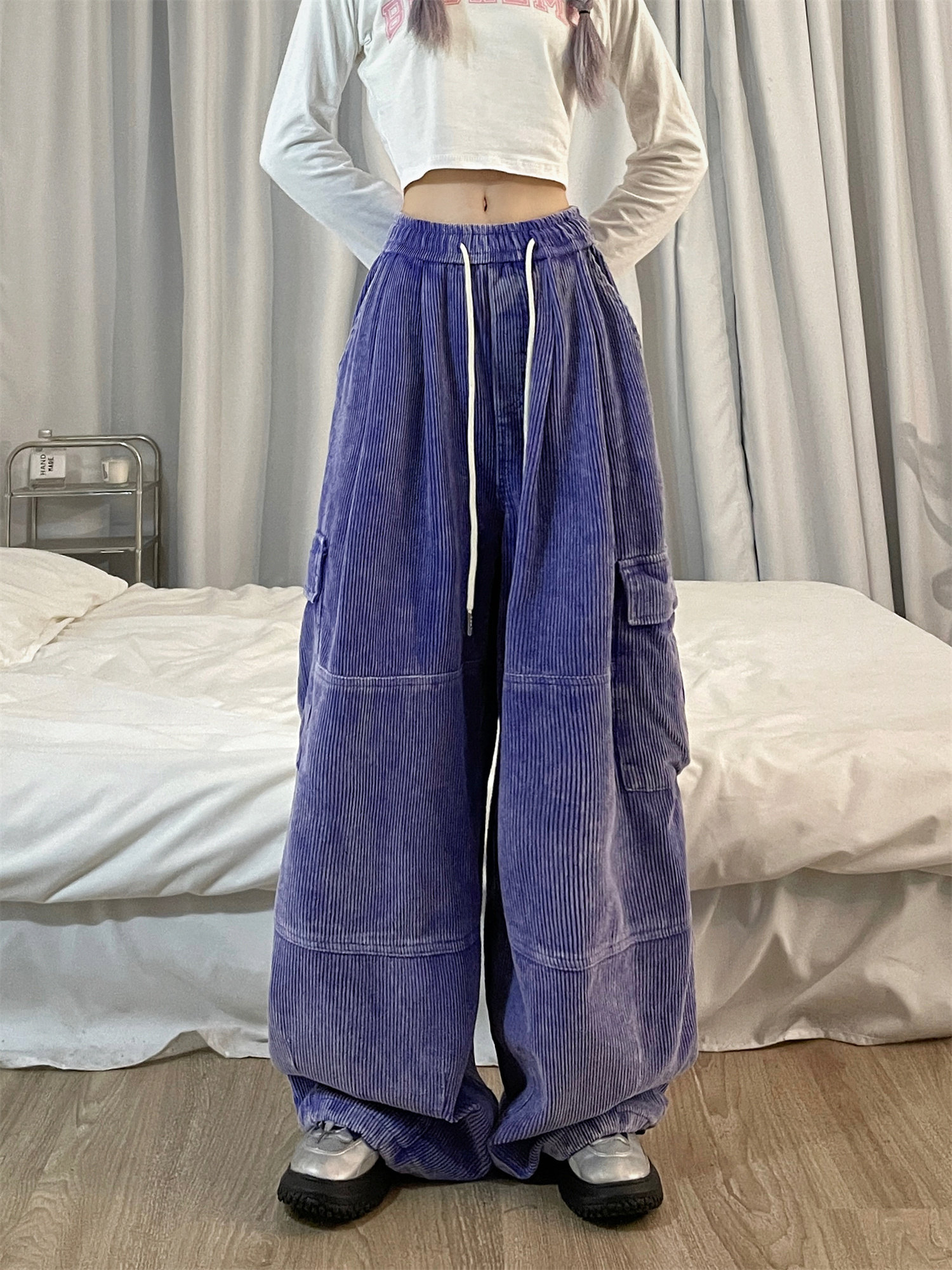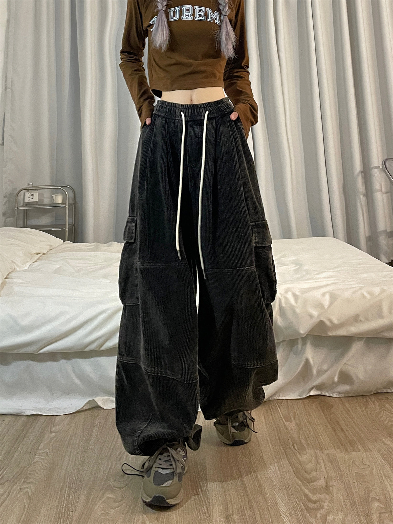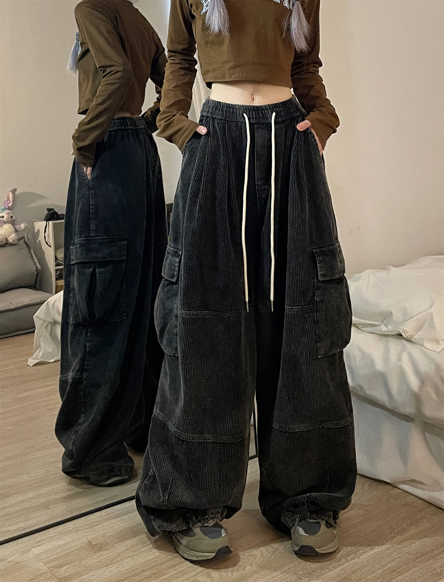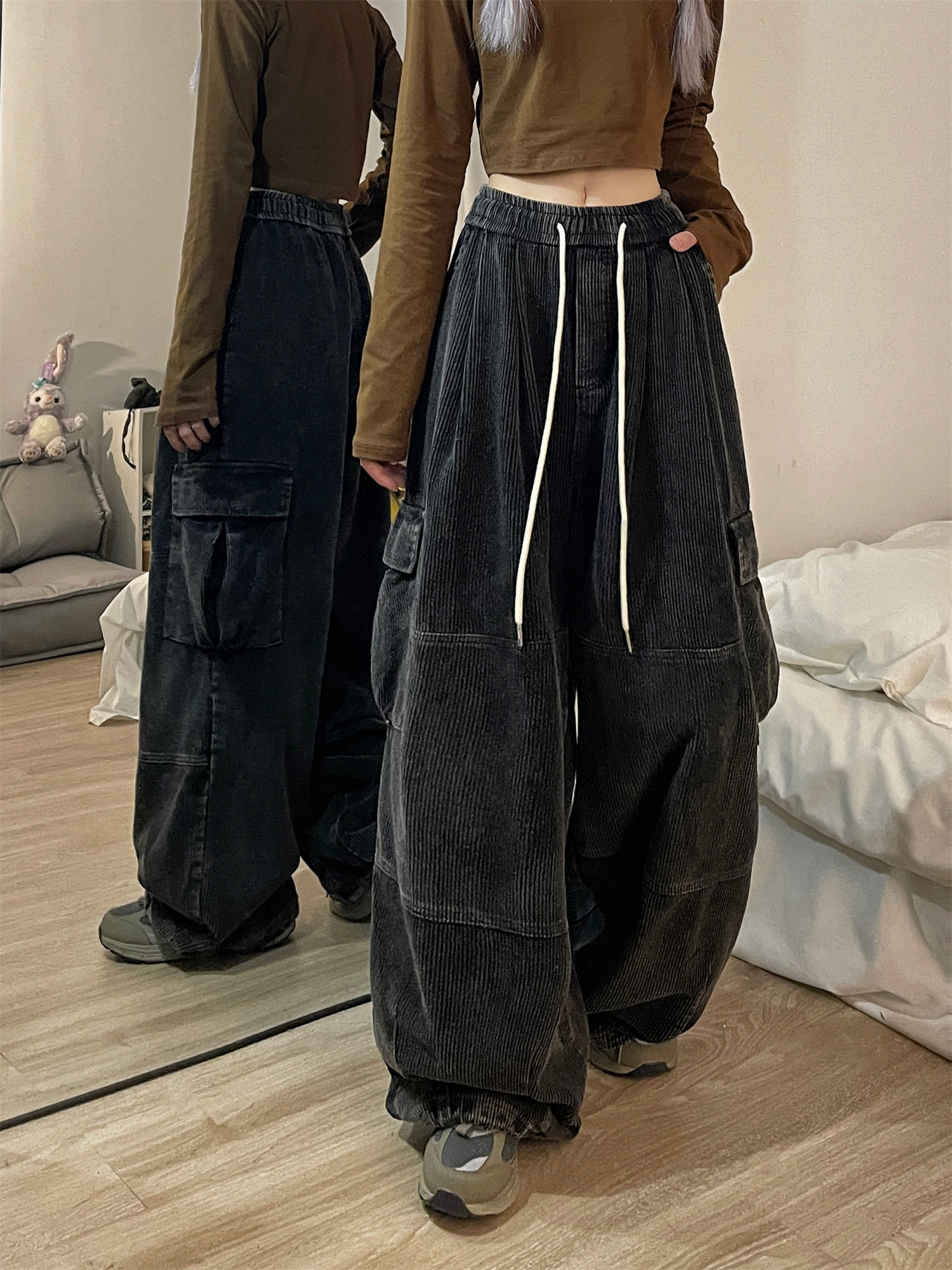 opoism美式復古原創燈芯絨工裝褲女濶腿拖地直筒褲加厚水洗做舊潮