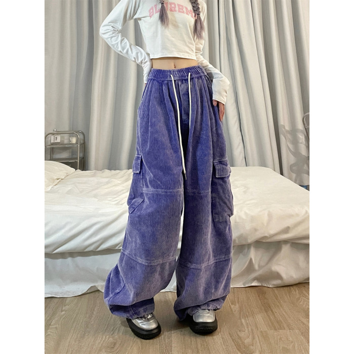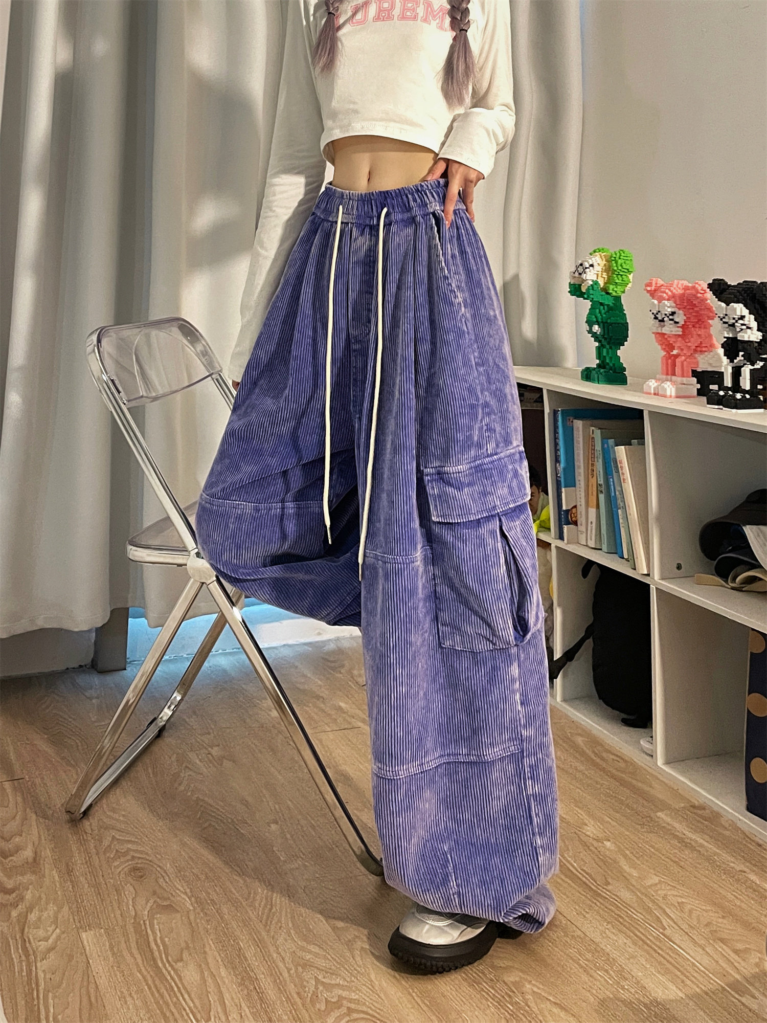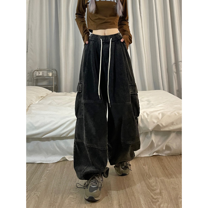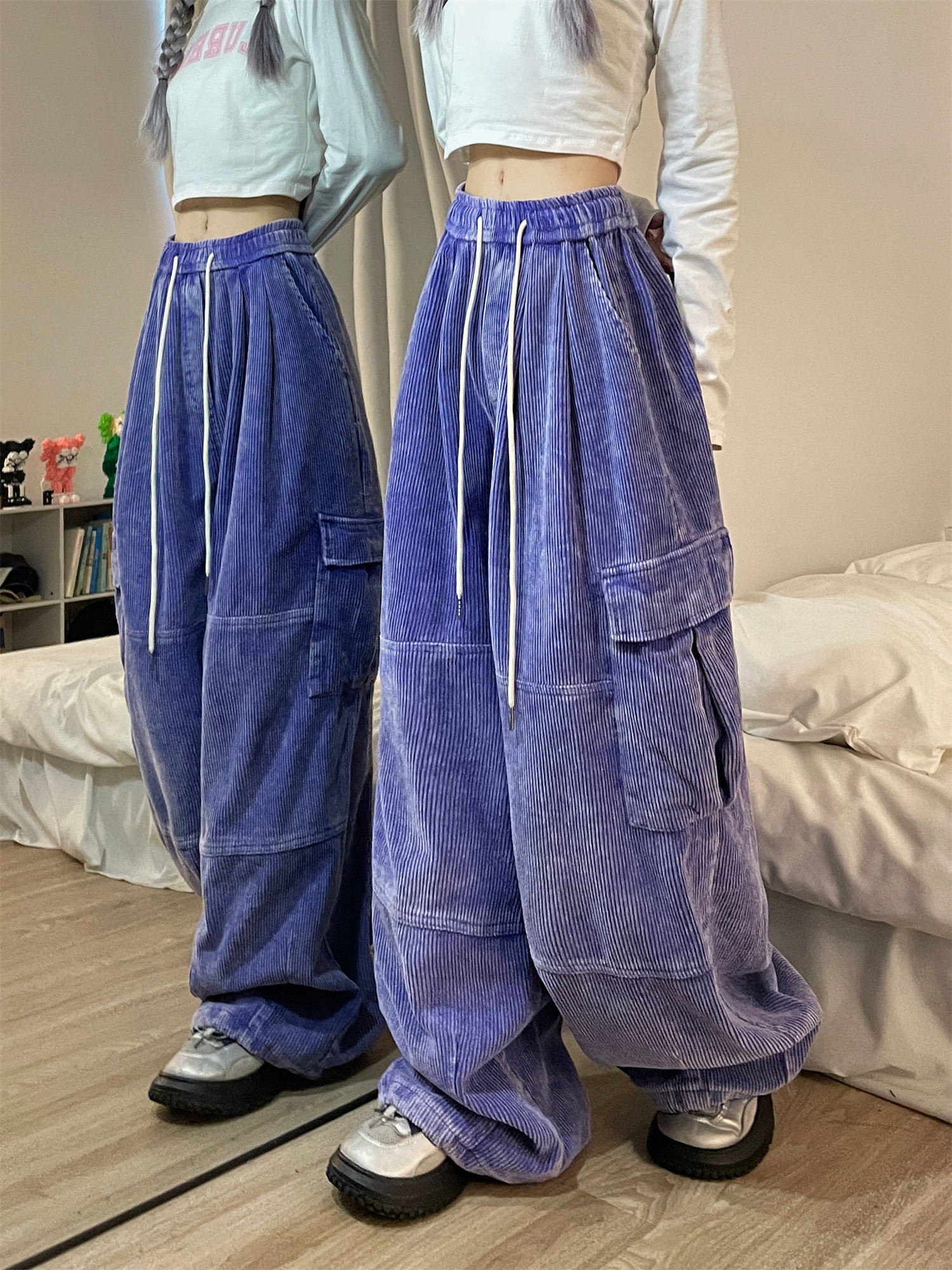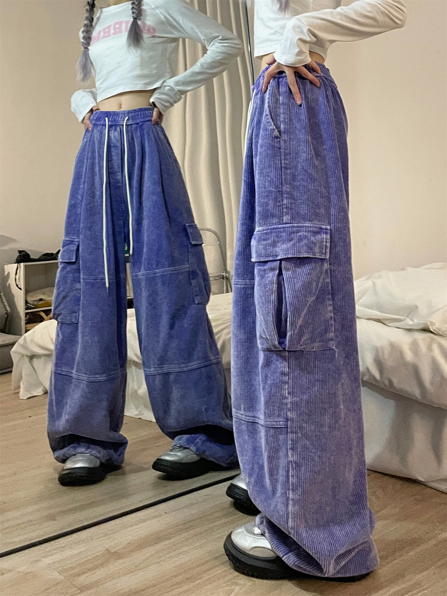 opoism美式復古原創燈芯絨工裝褲女濶腿拖地直筒褲加厚水洗做舊潮