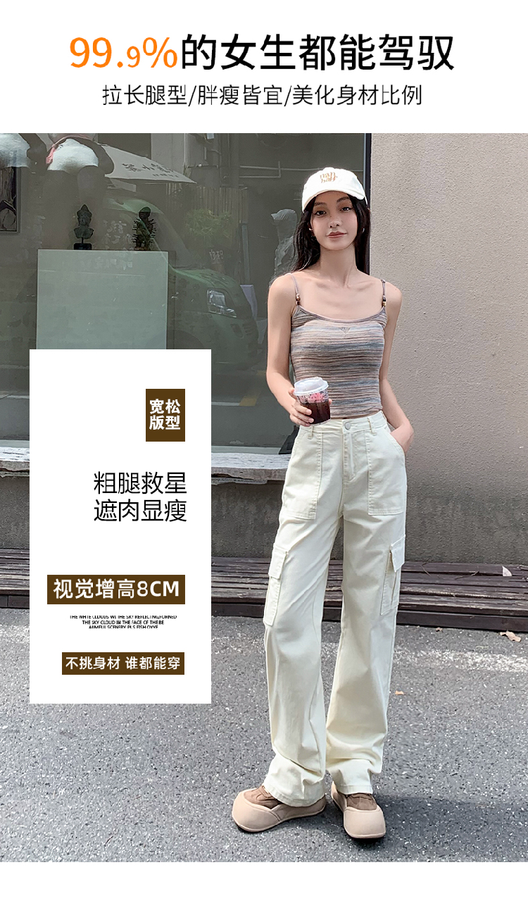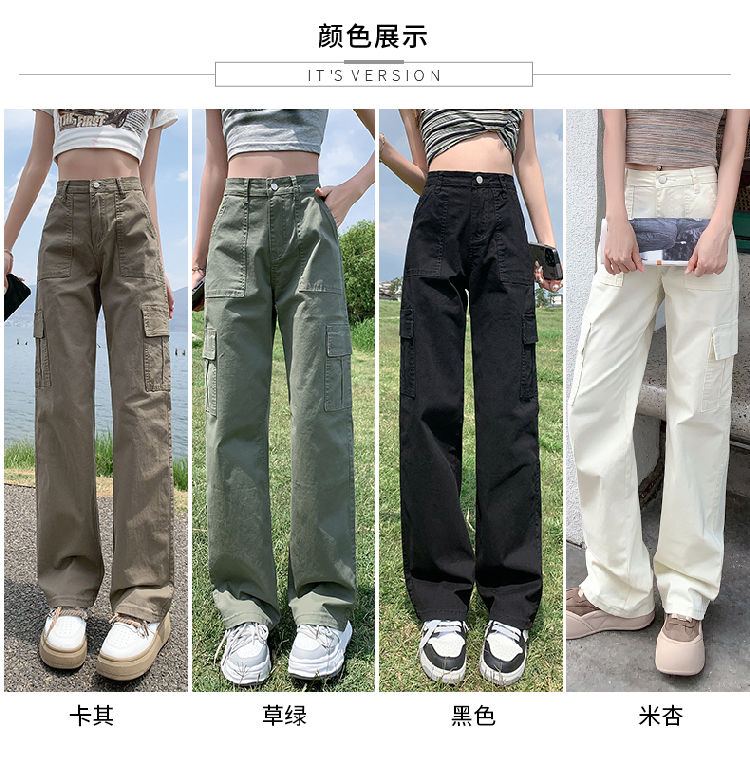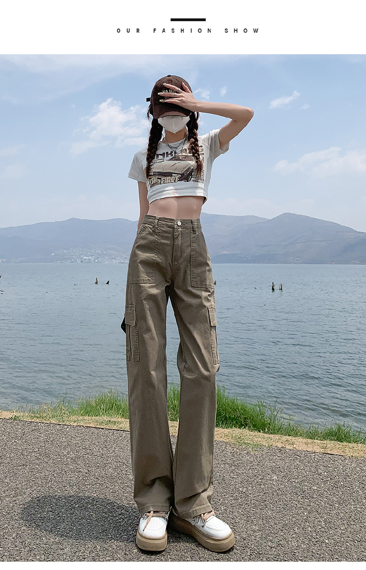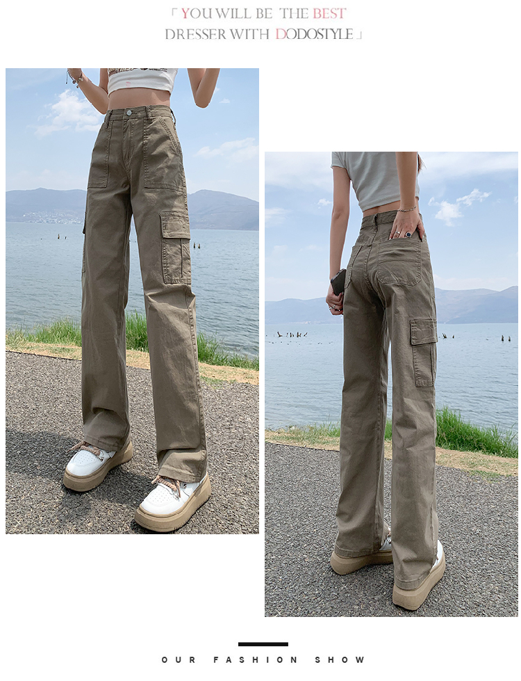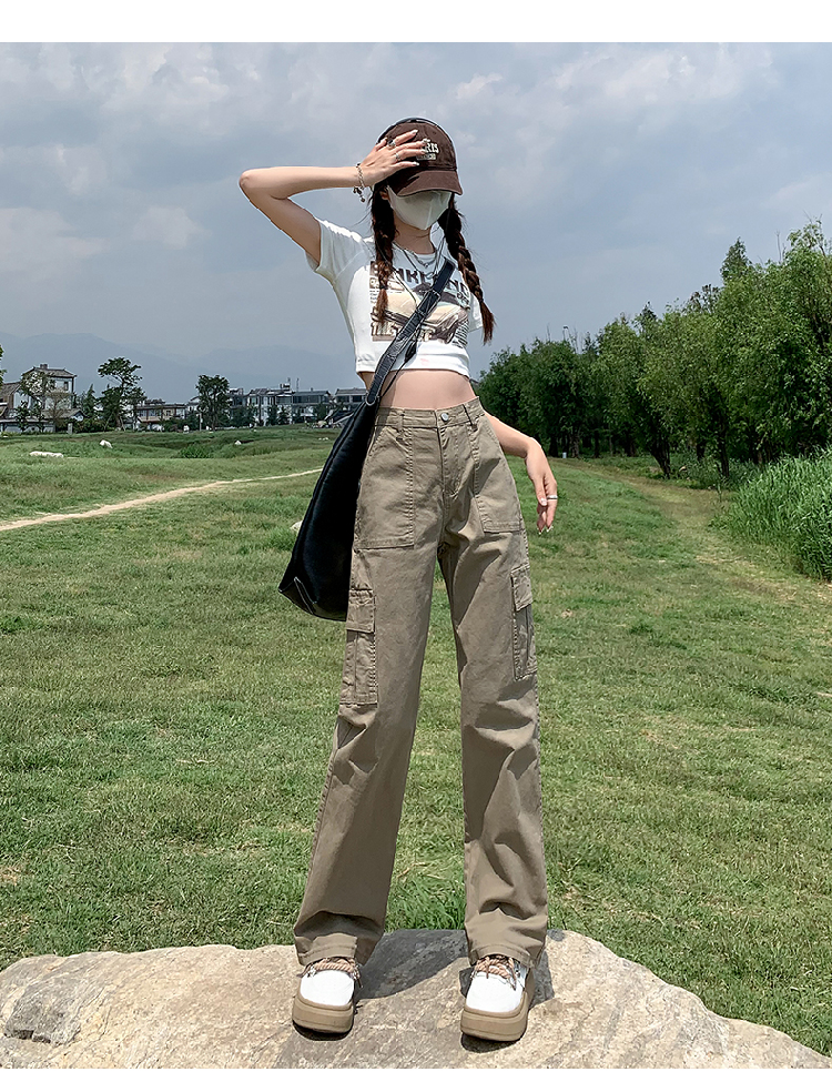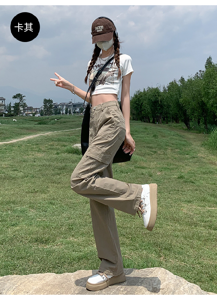 卡其色高腰美式窄版直筒工裝褲女春季新款復古休閒濶腿拖地牛仔褲