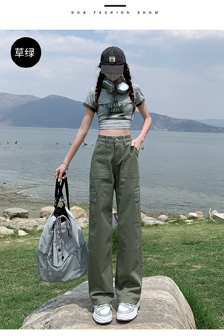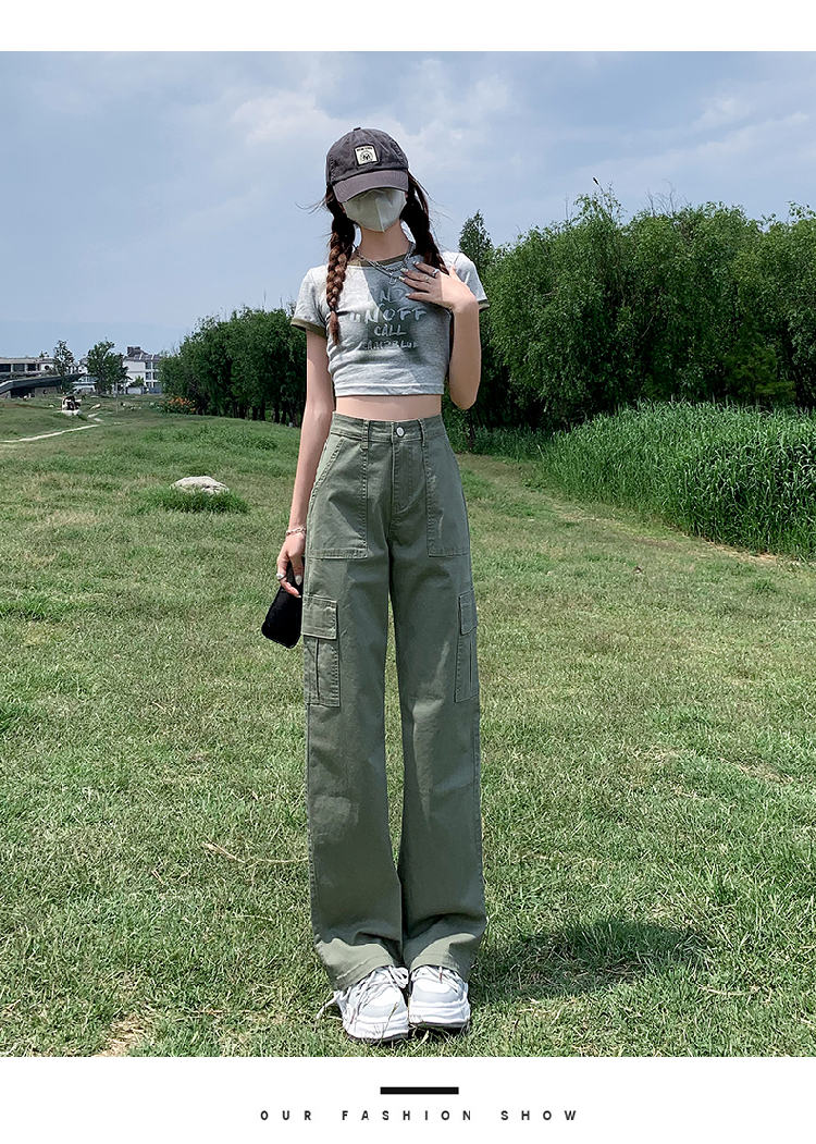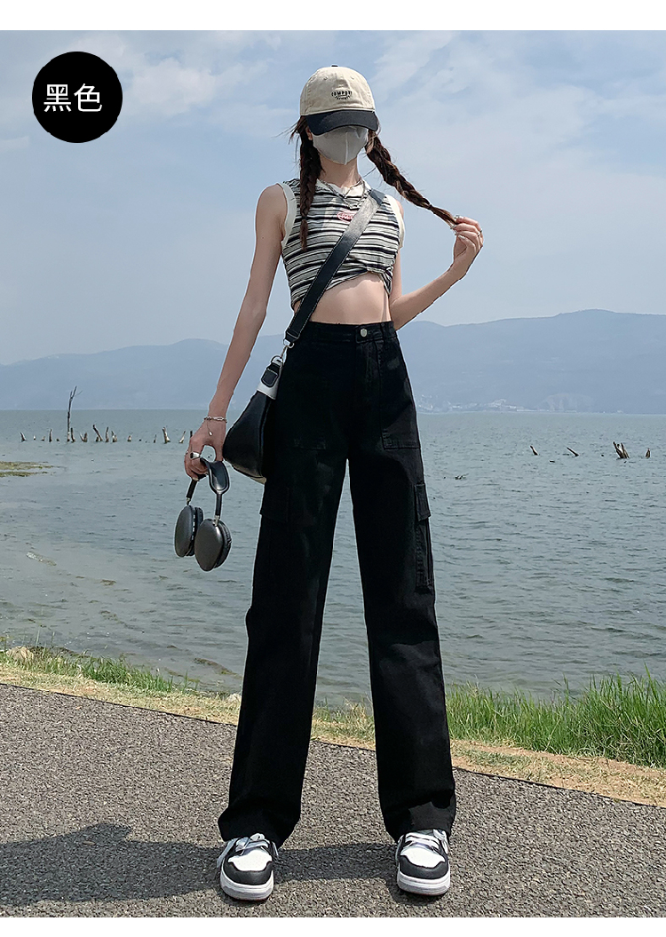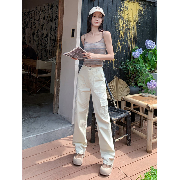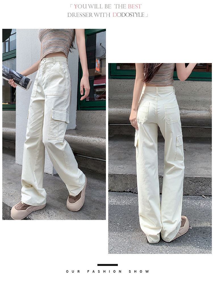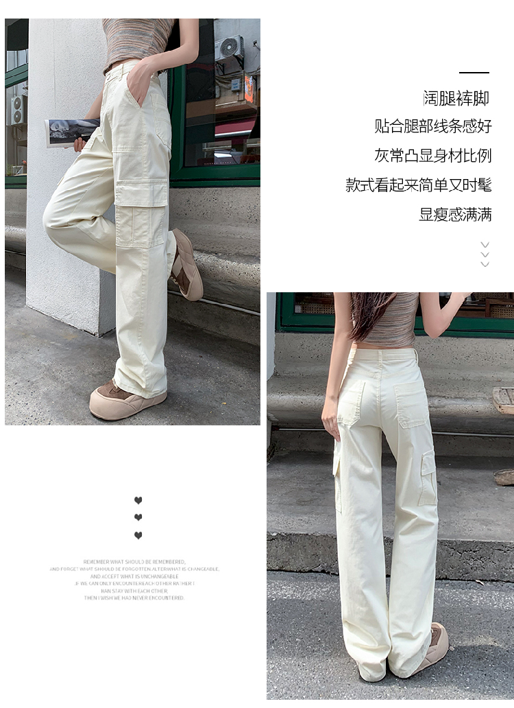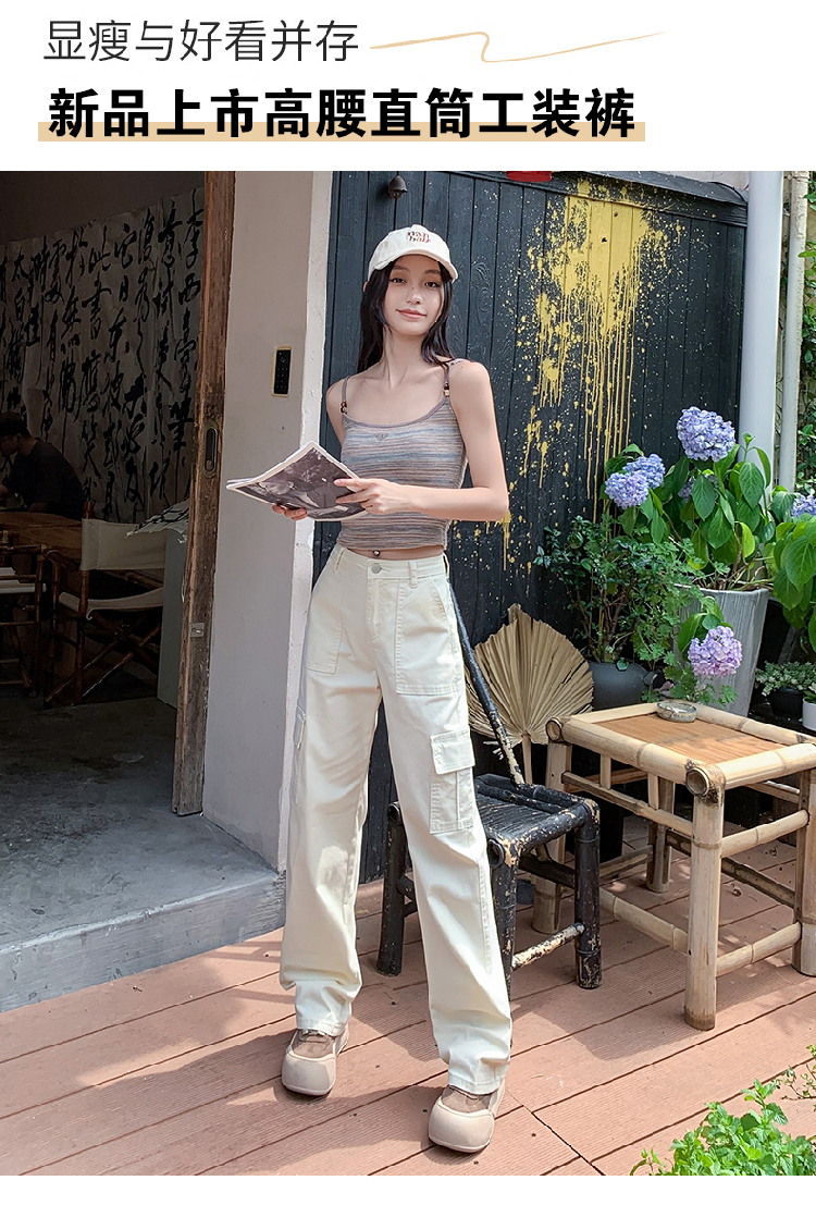 卡其色高腰美式窄版直筒工裝褲女春季新款復古休閒濶腿拖地牛仔褲
