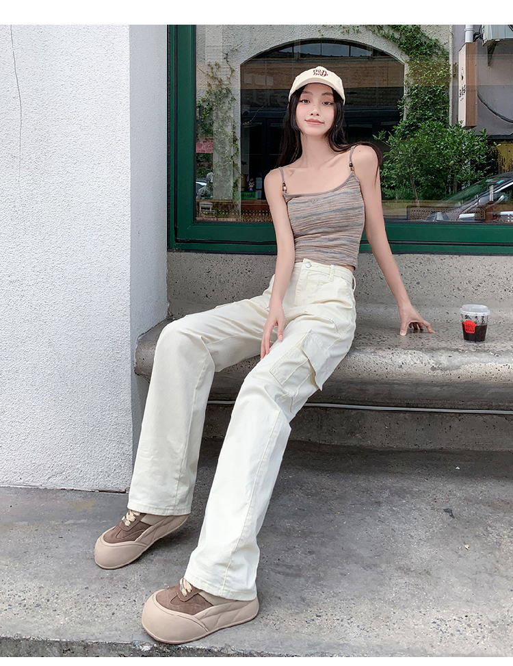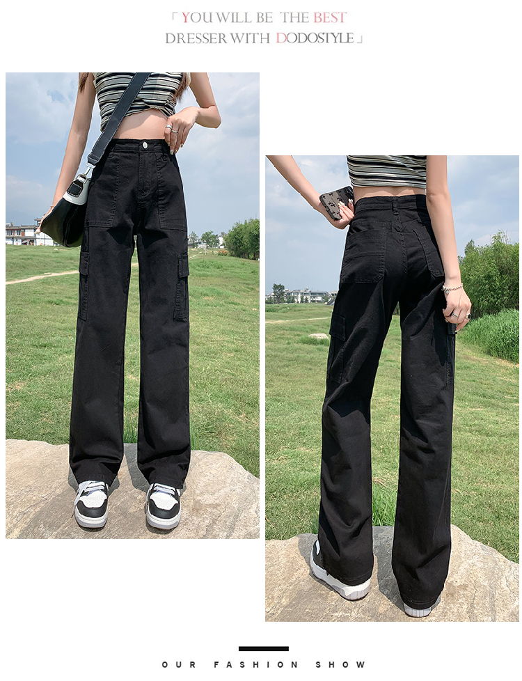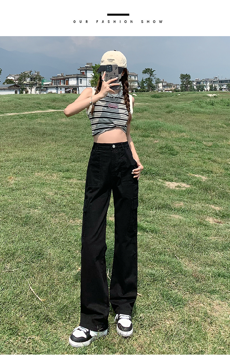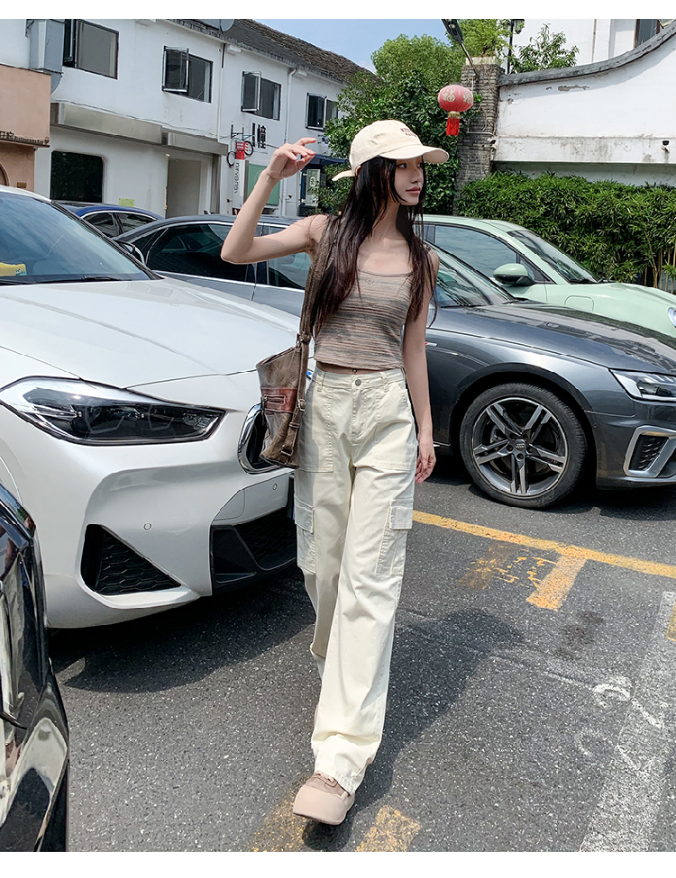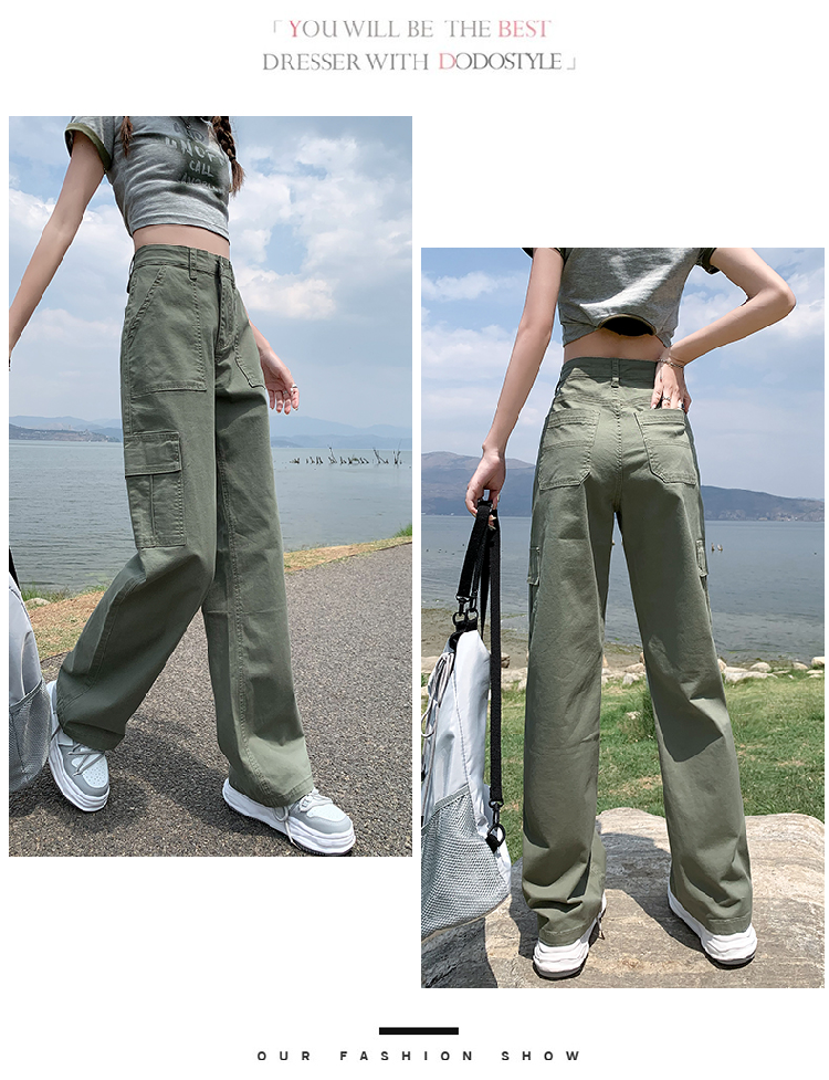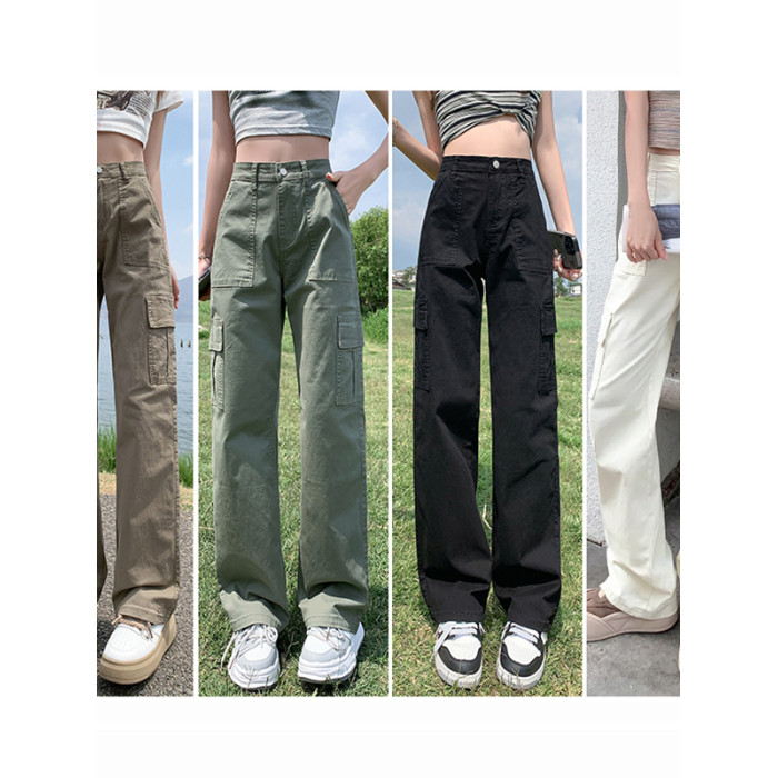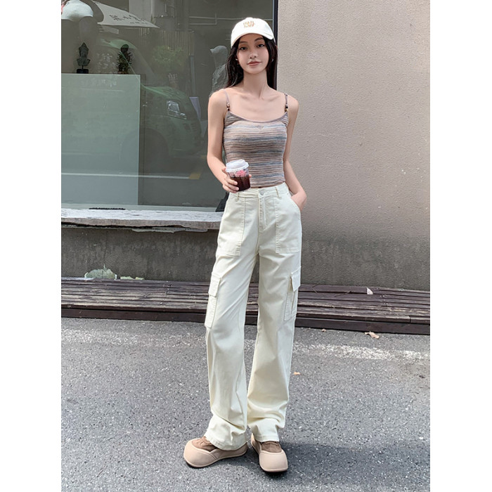 卡其色高腰美式窄版直筒工裝褲女春季新款復古休閒濶腿拖地牛仔褲