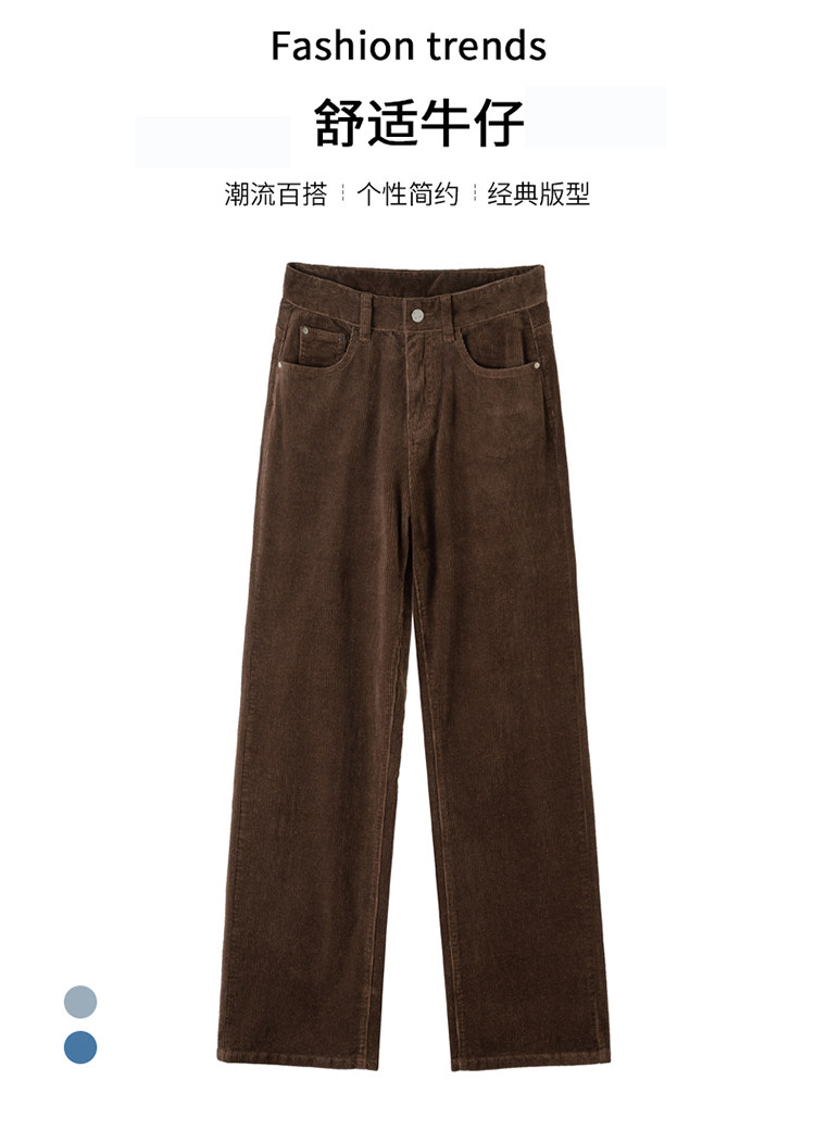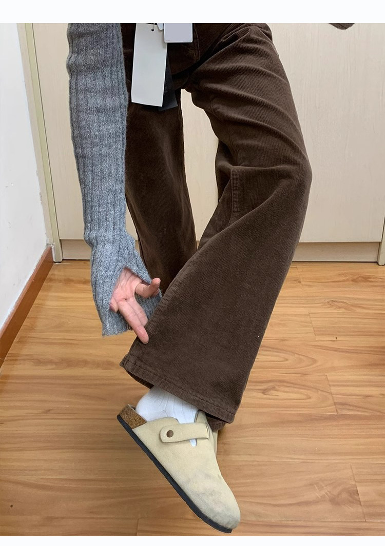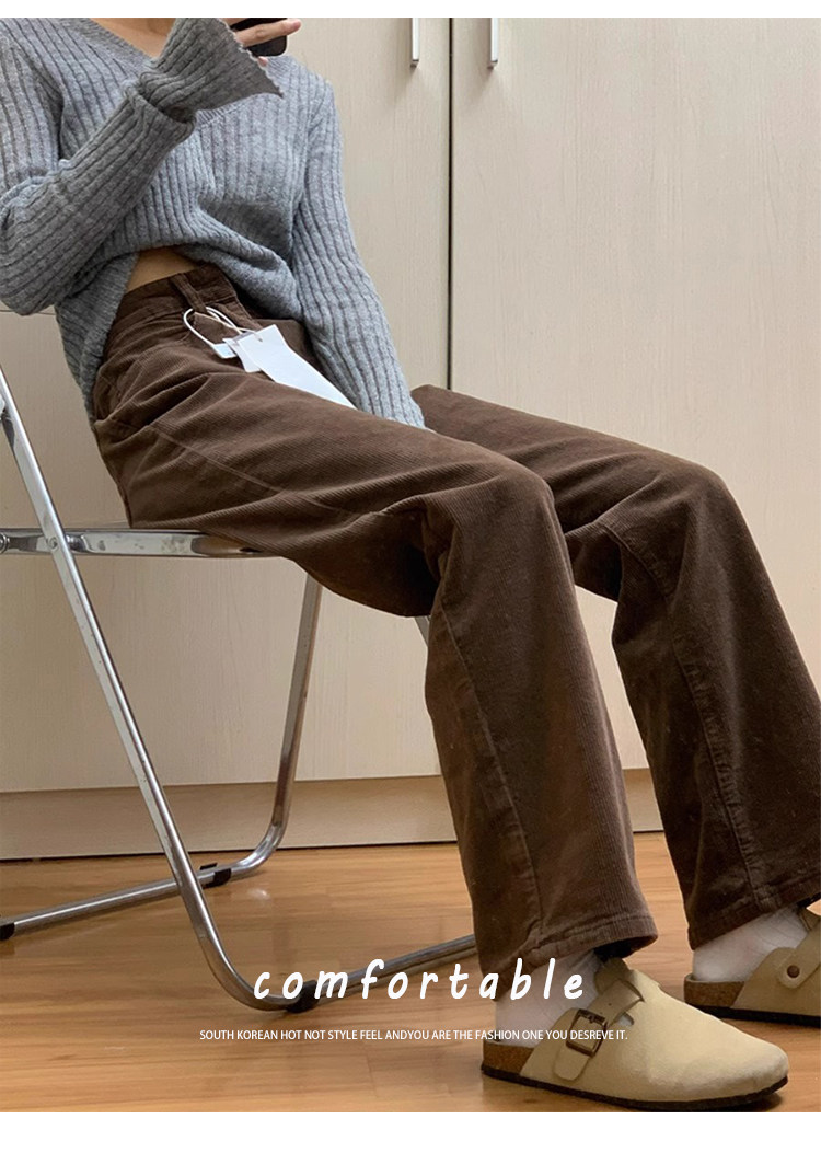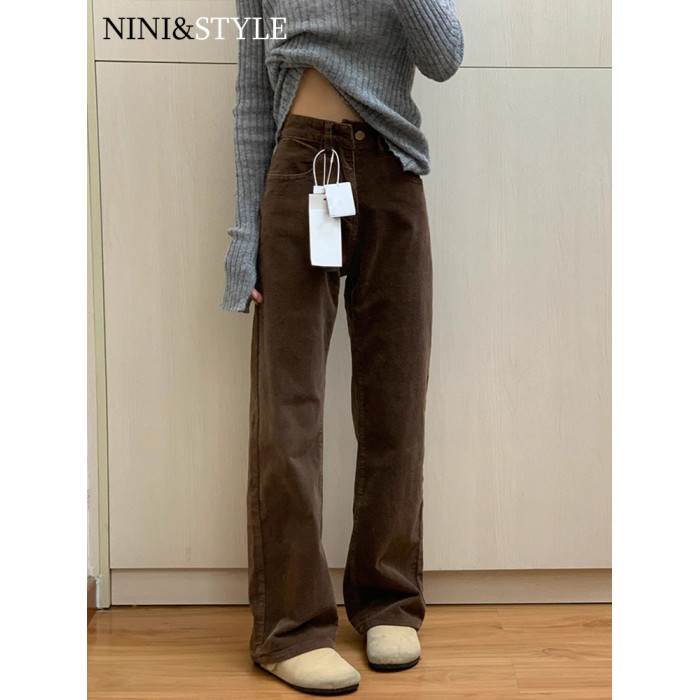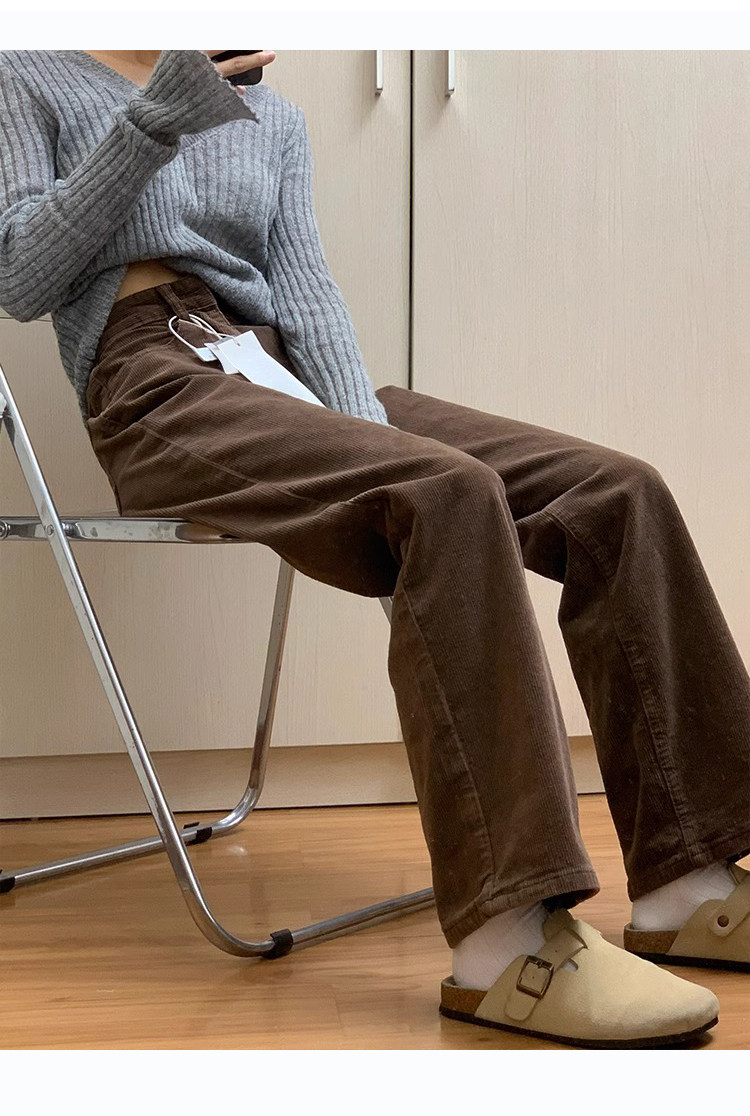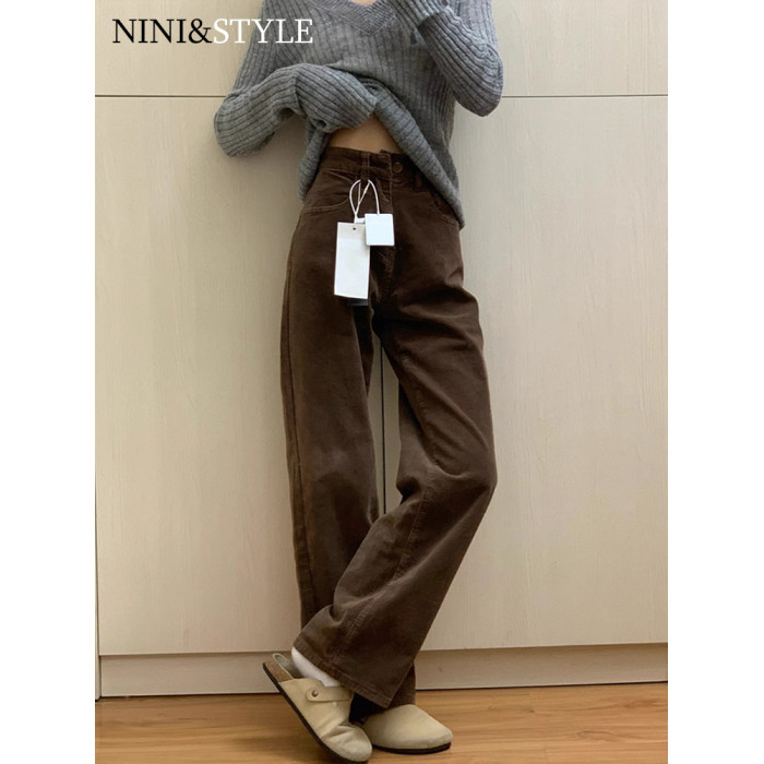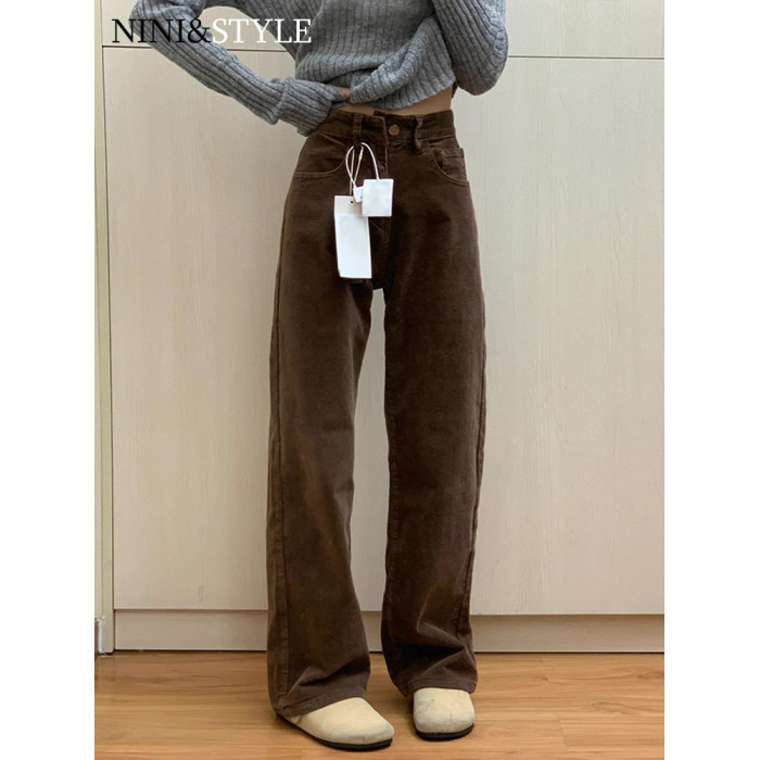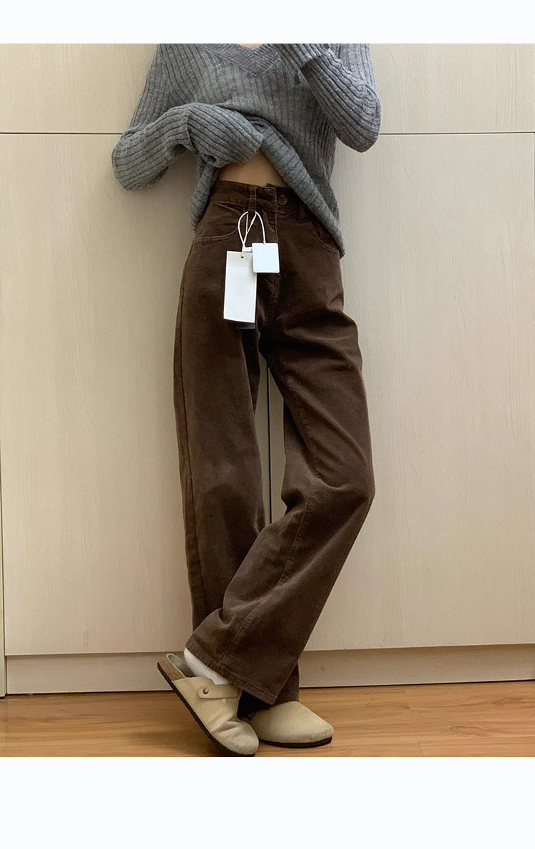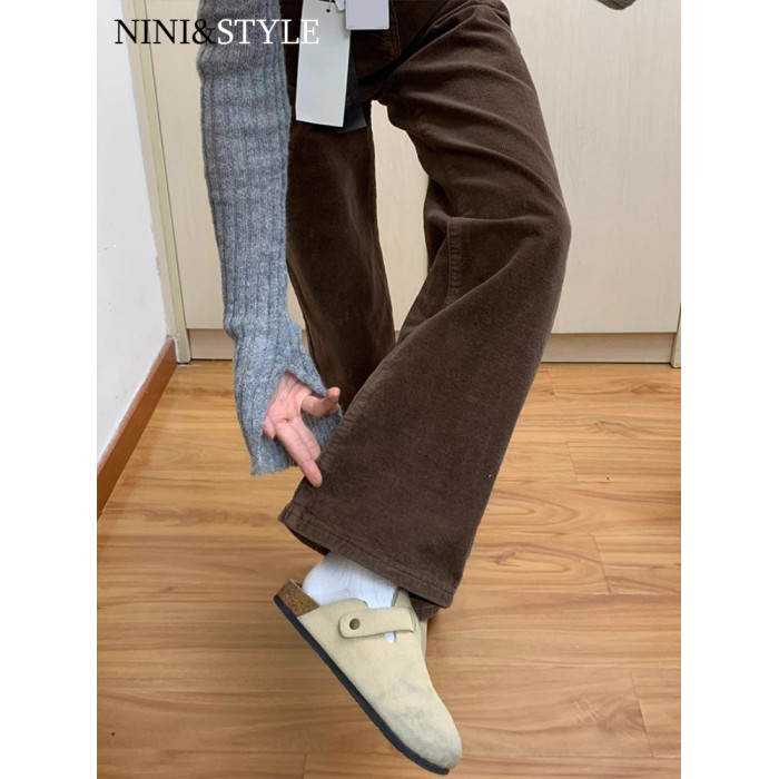 咖色燈芯絨濶腿褲女秋冬季2025新款高腰顯瘦窄版棕色休閒直筒褲子