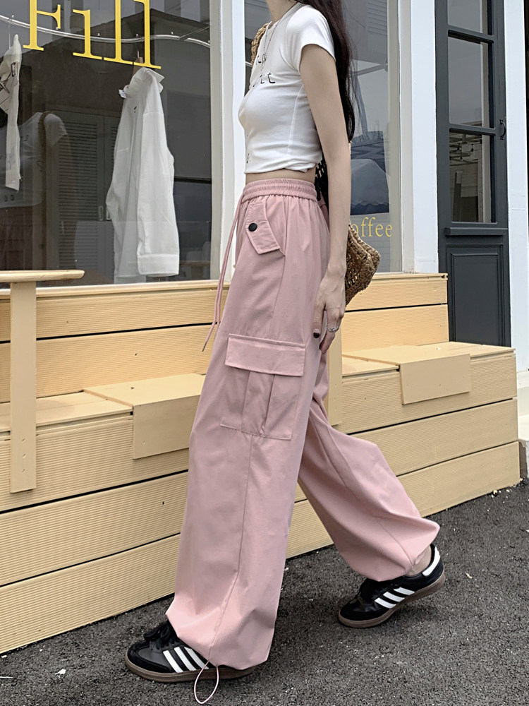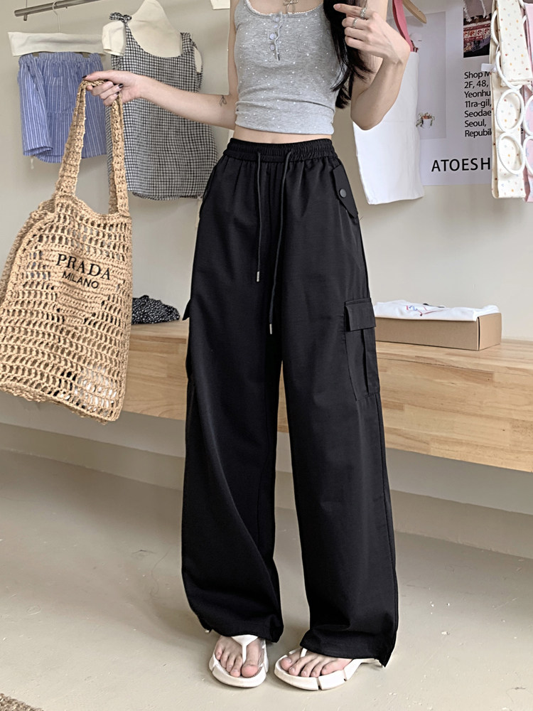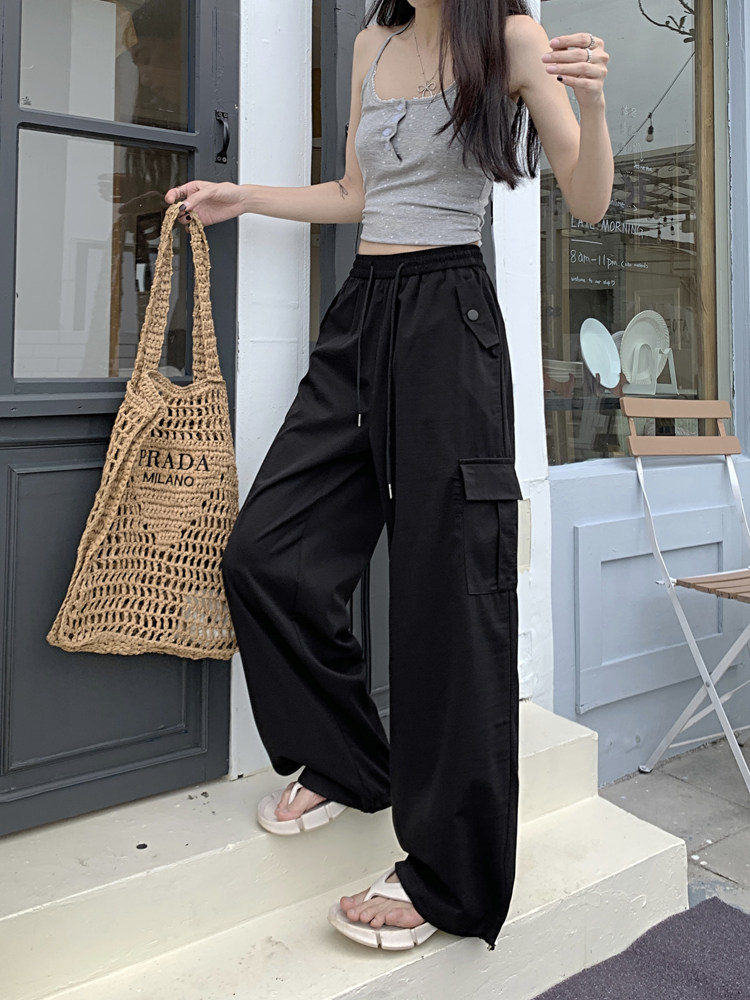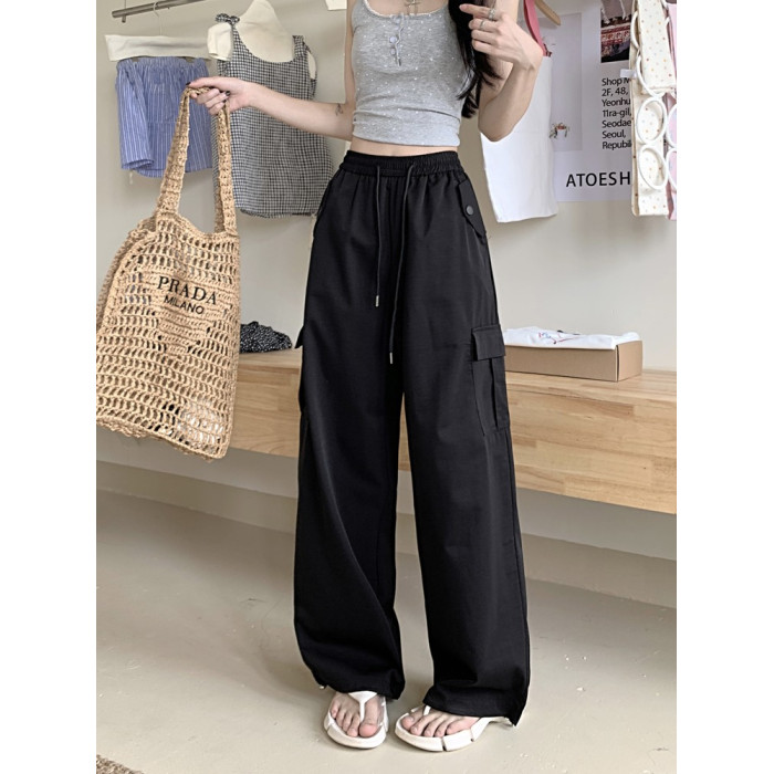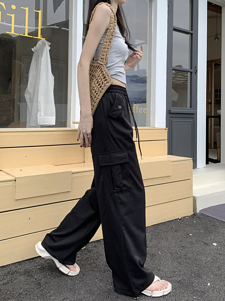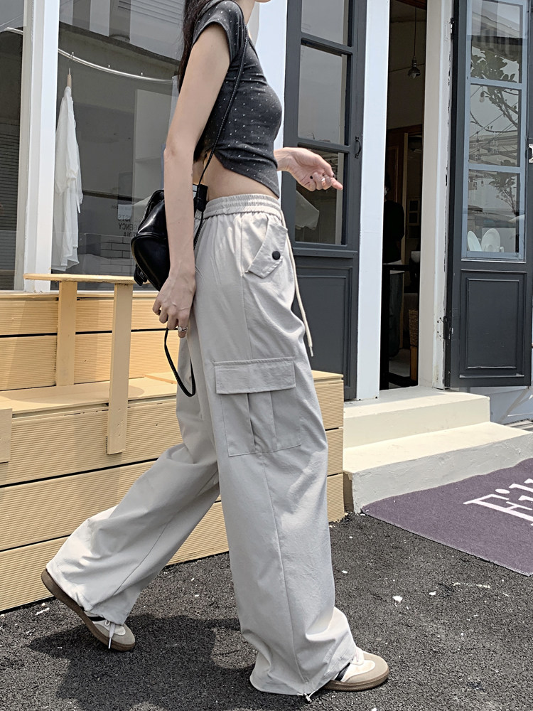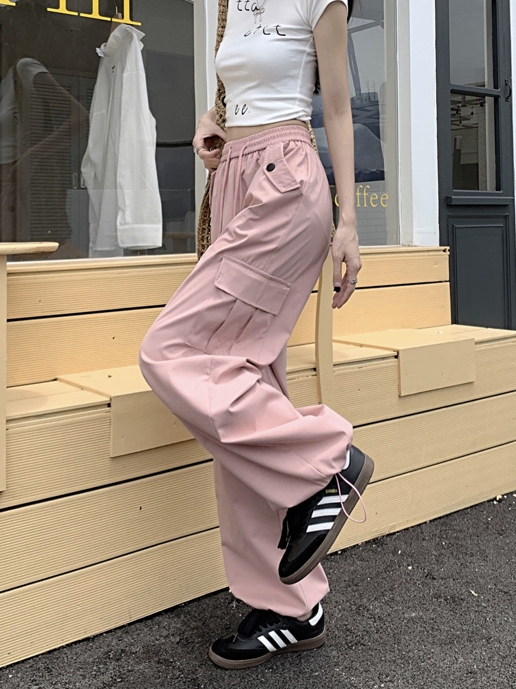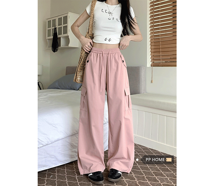 PPHOME拽酷先鋒~美式口袋工裝褲女夏季高腰濶腿休閒褲運動褲長褲