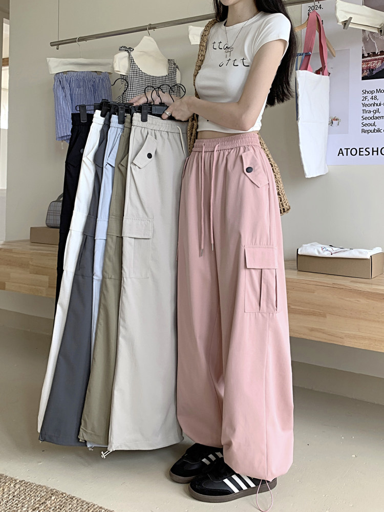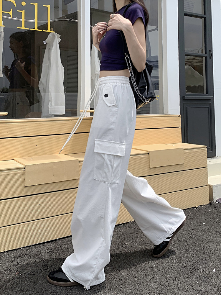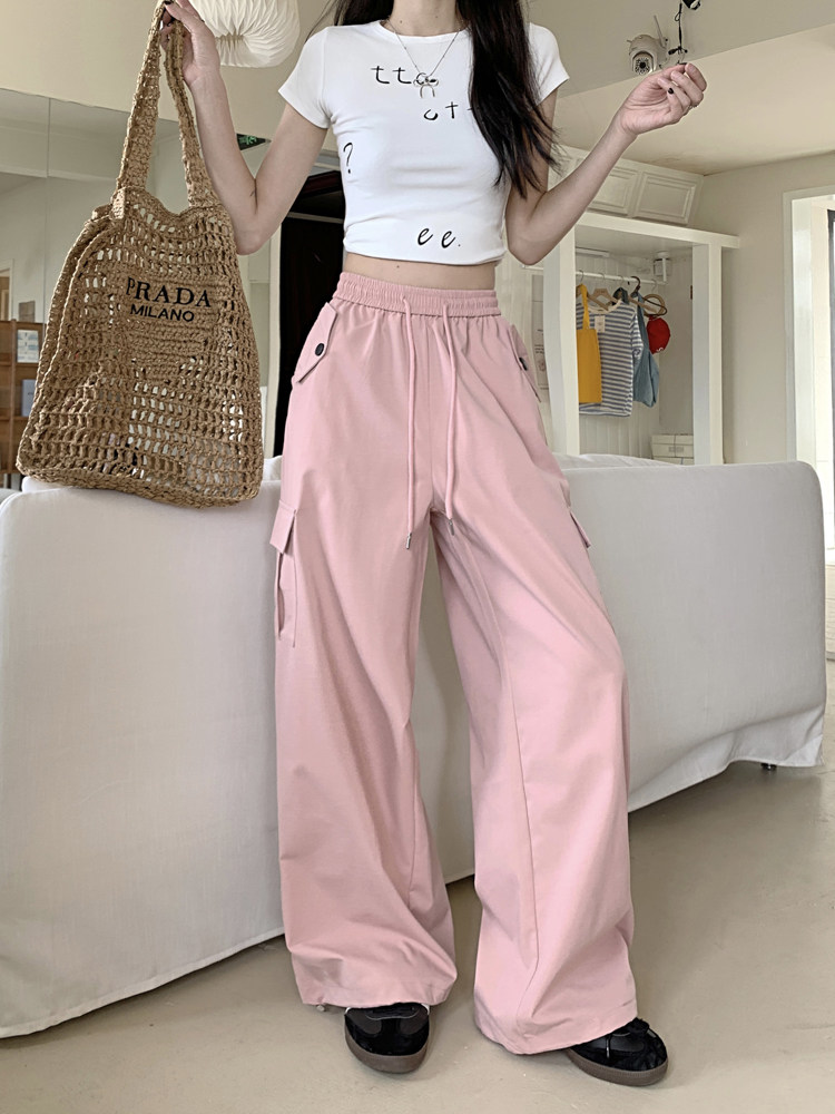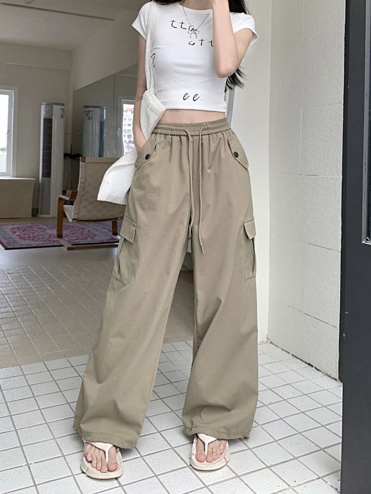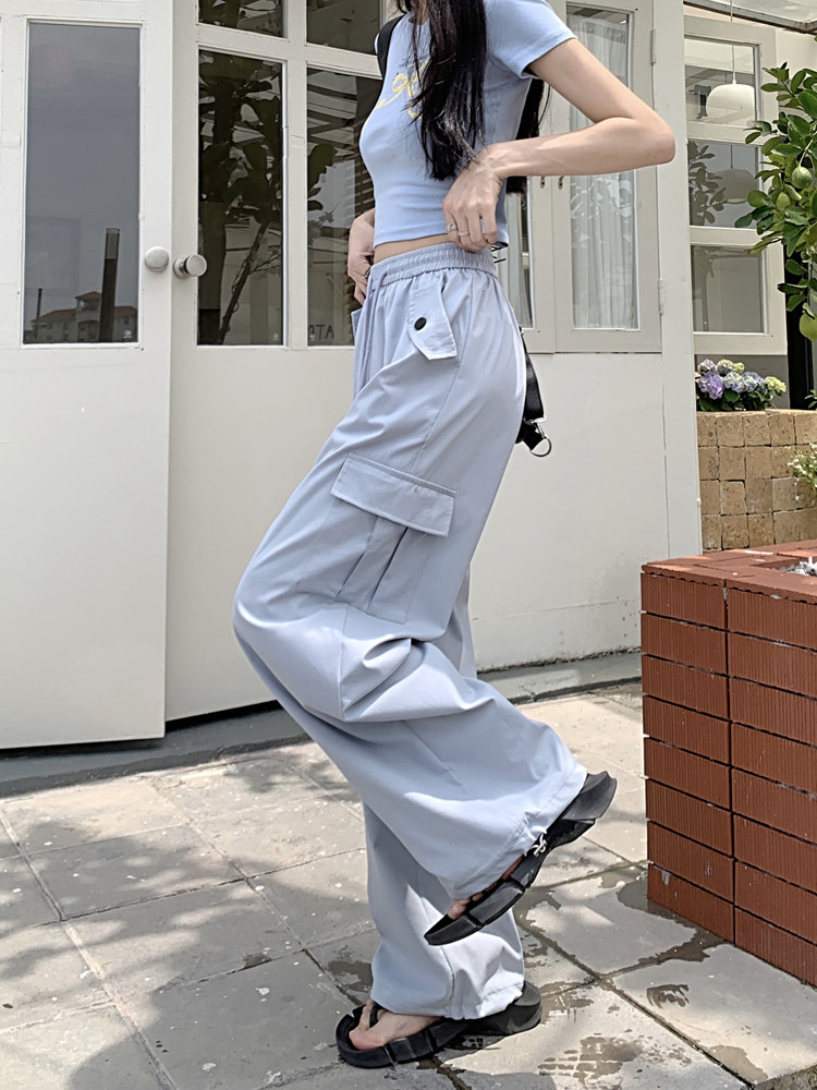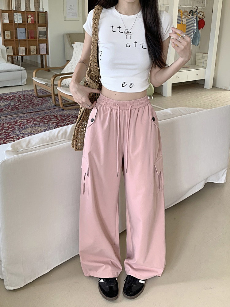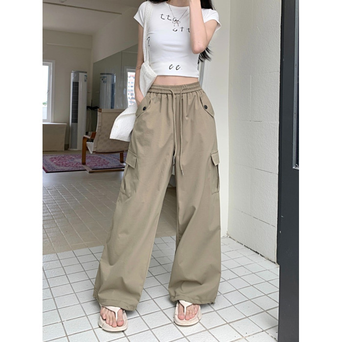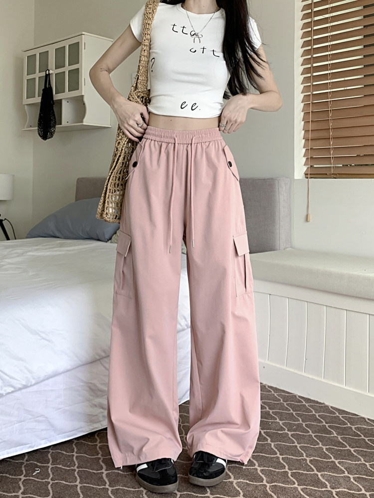 PPHOME拽酷先鋒~美式口袋工裝褲女夏季高腰濶腿休閒褲運動褲長褲