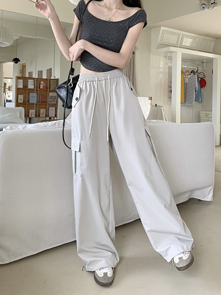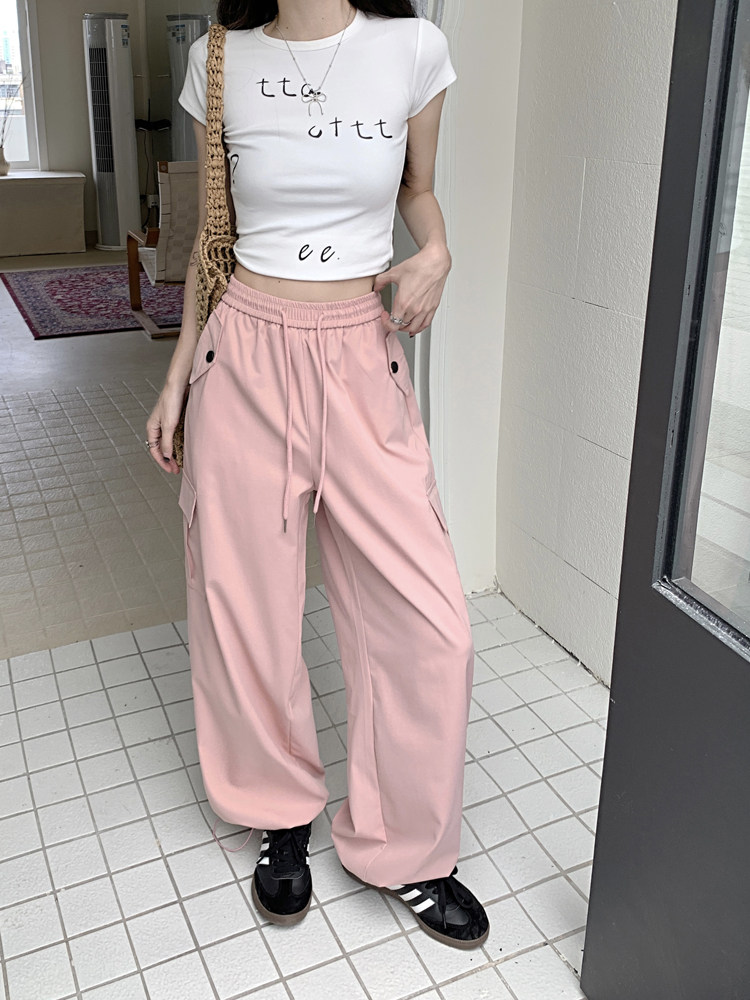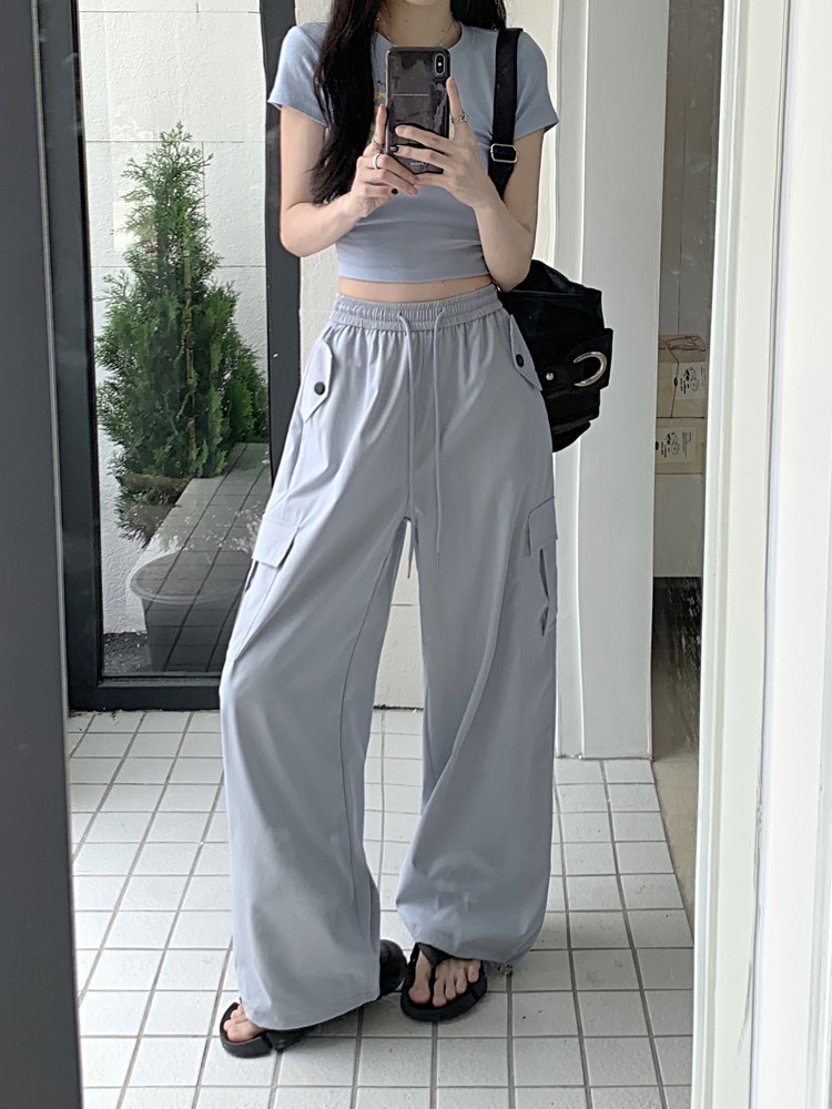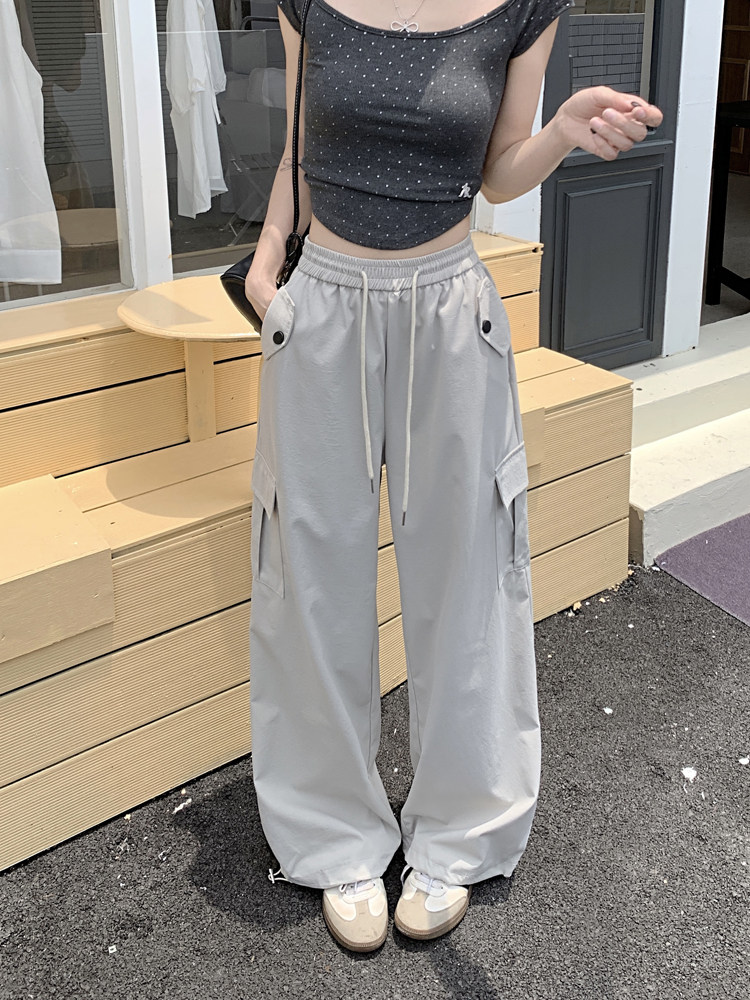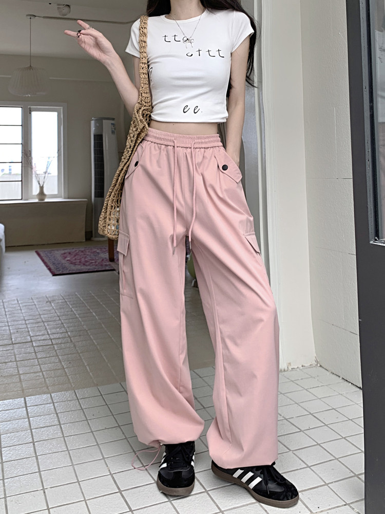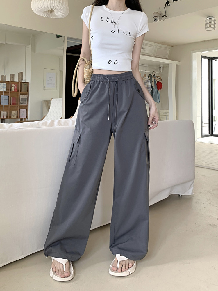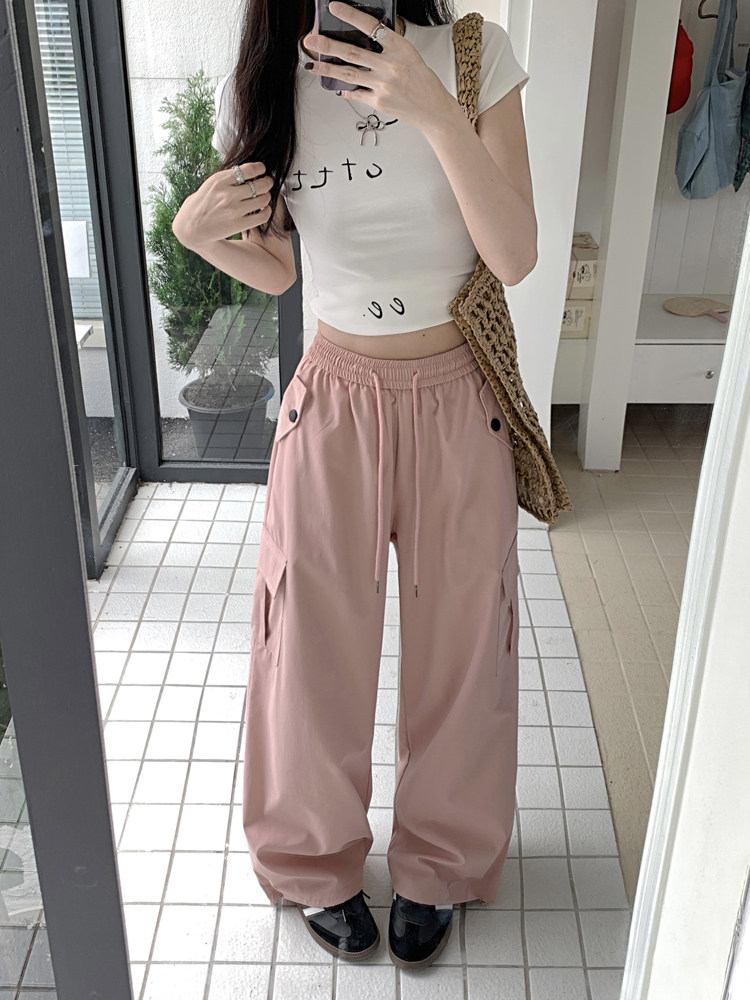 PPHOME拽酷先鋒~美式口袋工裝褲女夏季高腰濶腿休閒褲運動褲長褲