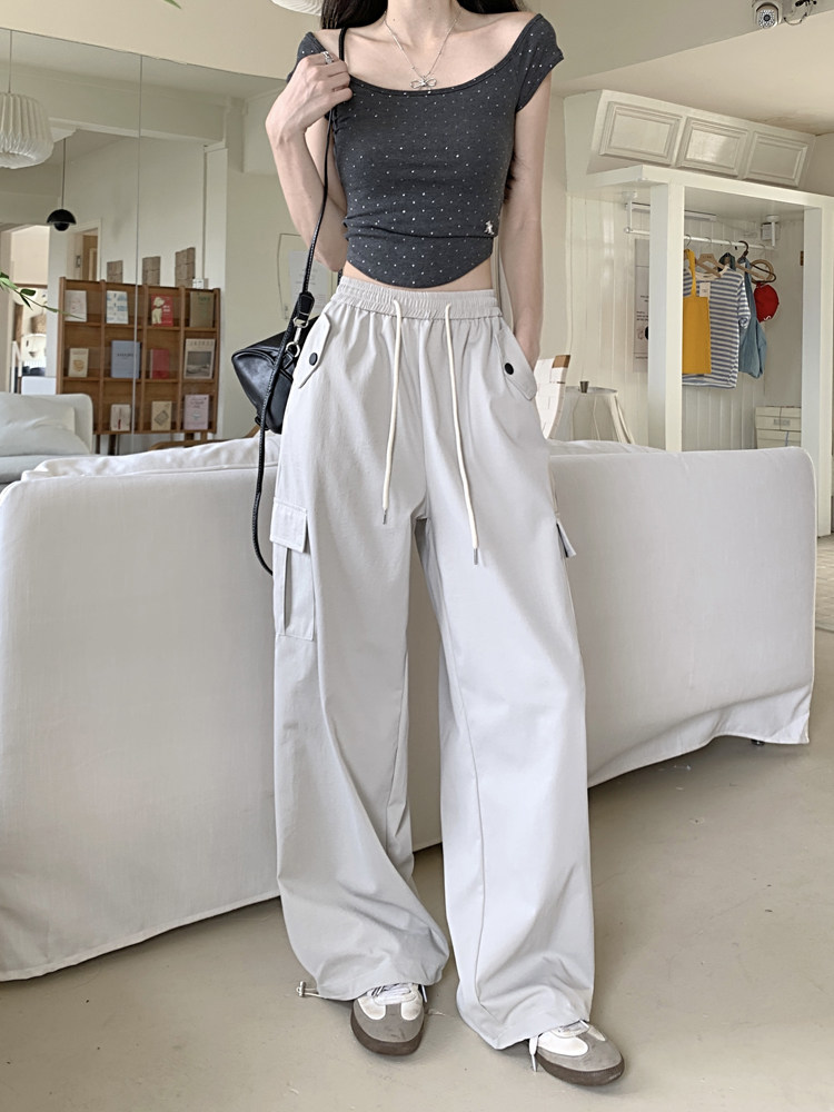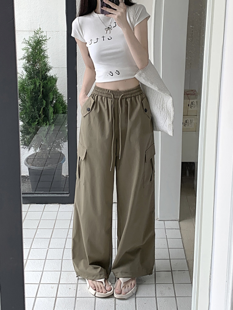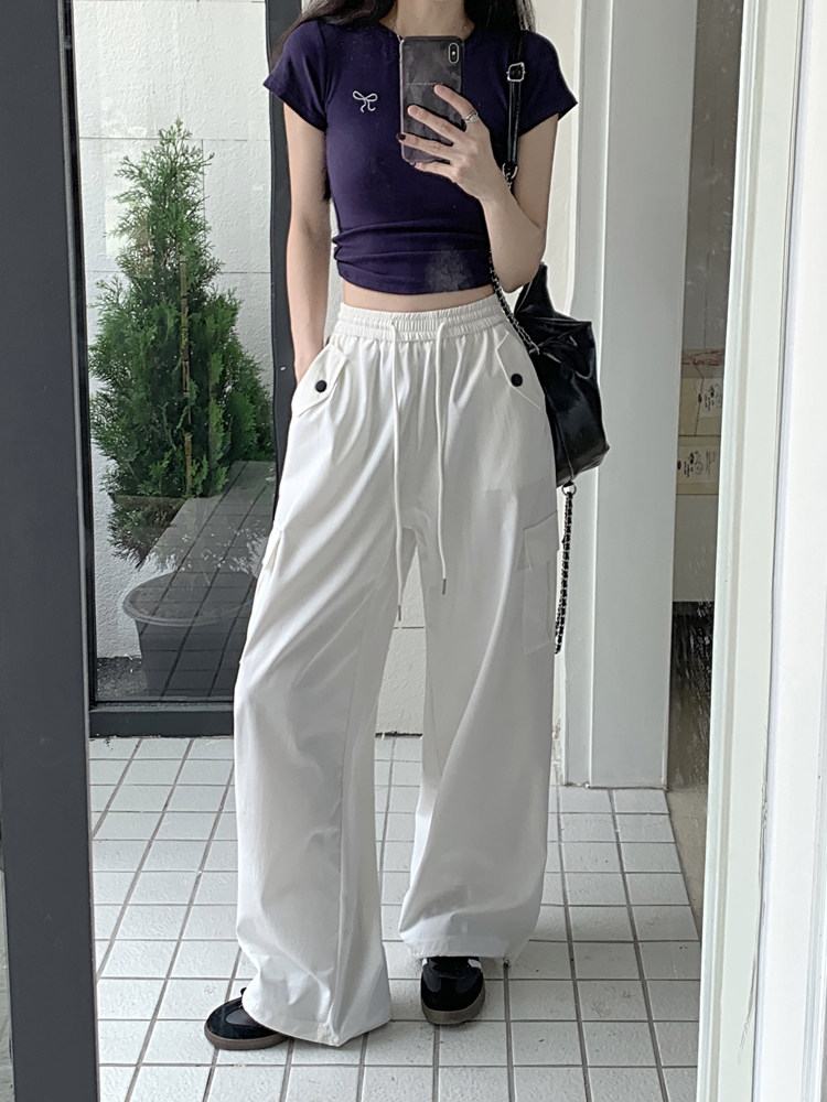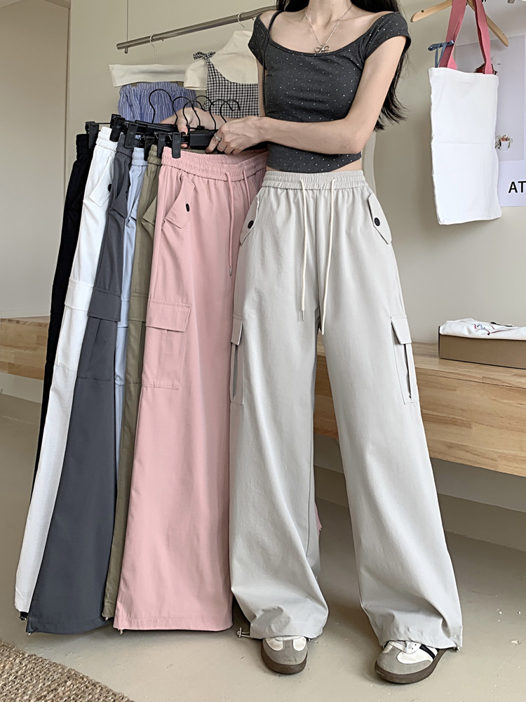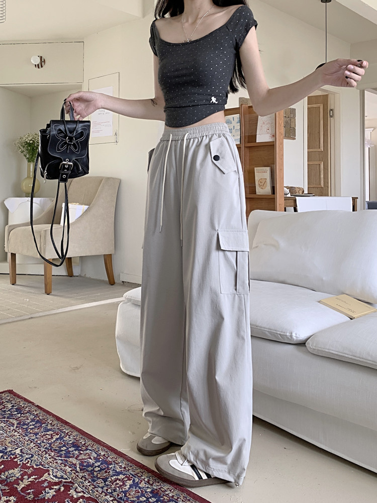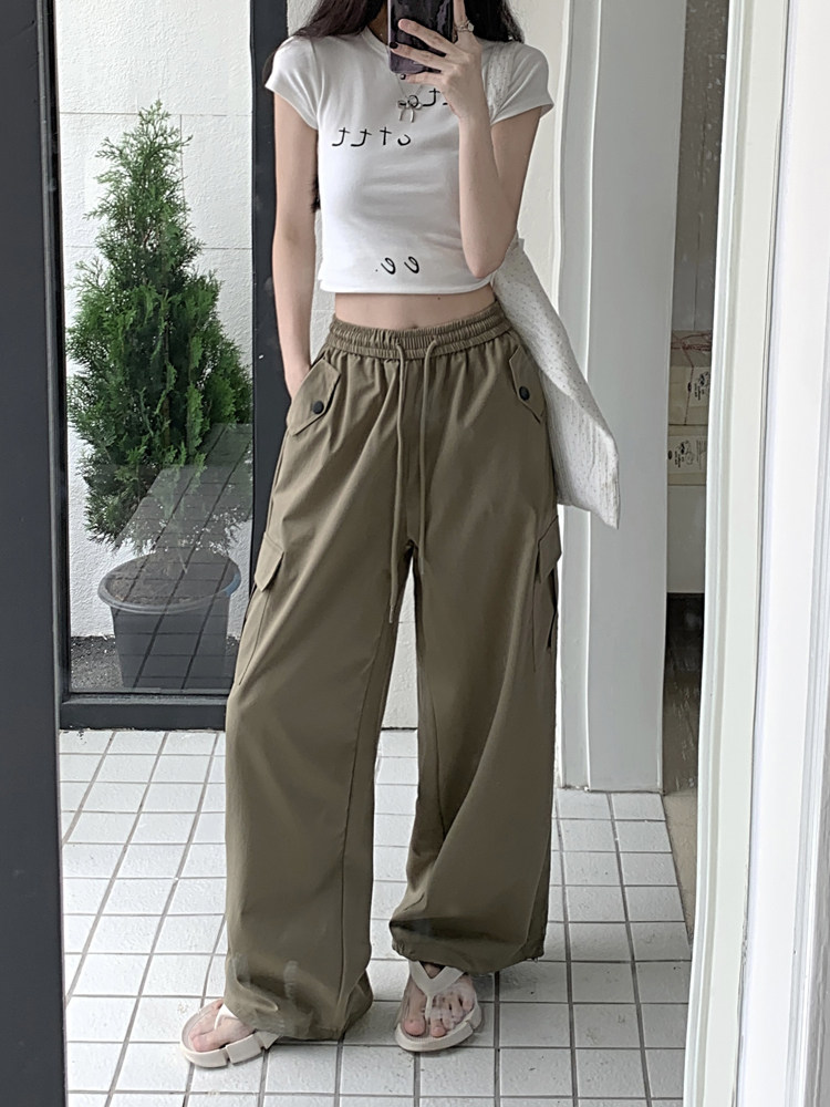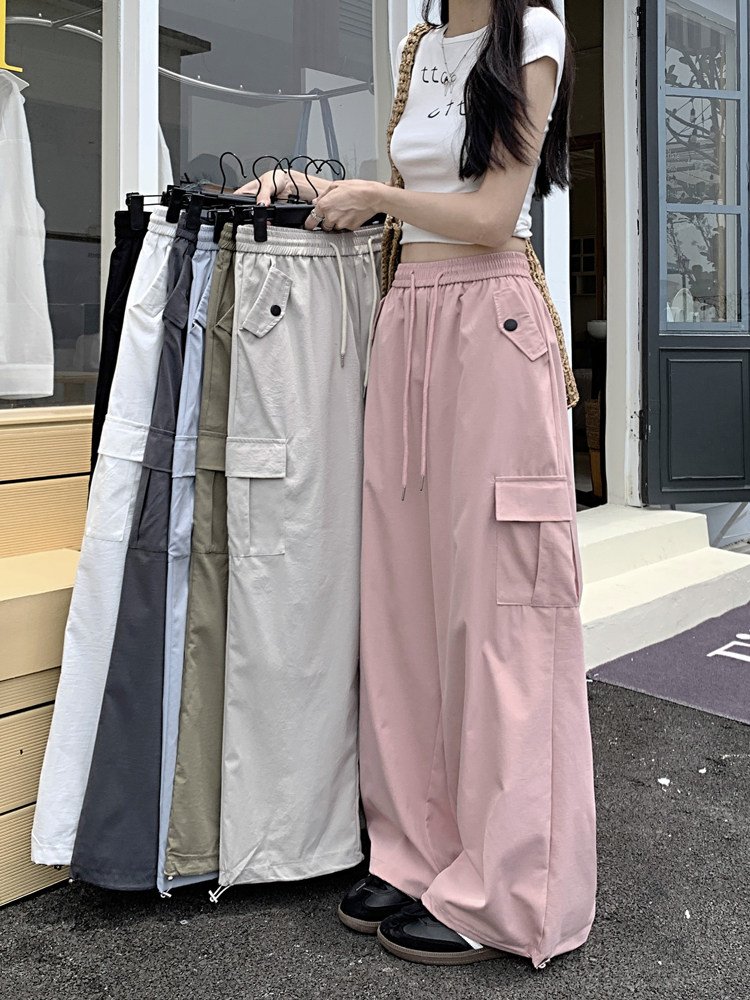 PPHOME拽酷先鋒~美式口袋工裝褲女夏季高腰濶腿休閒褲運動褲長褲