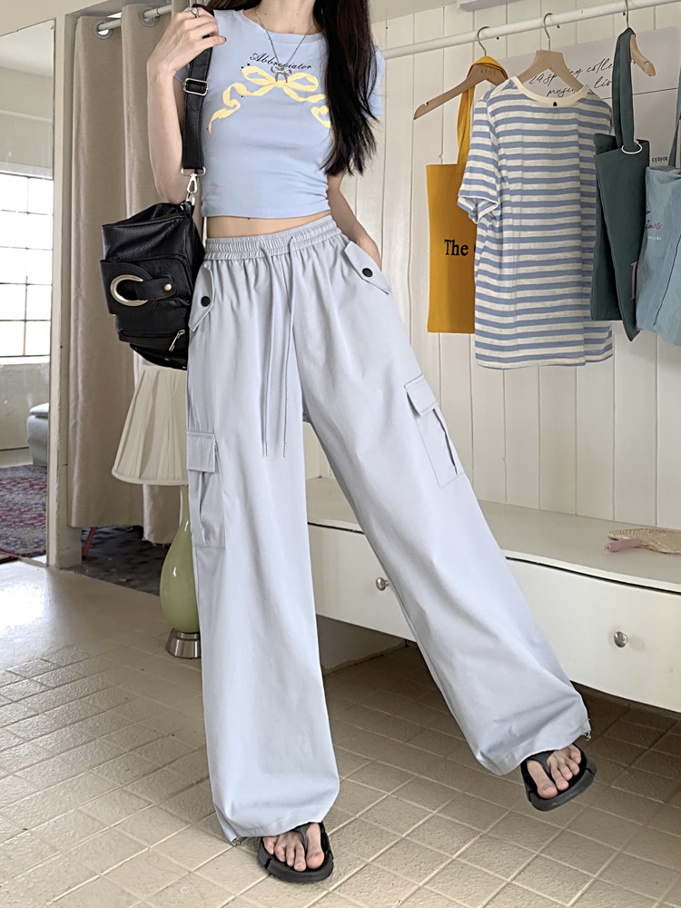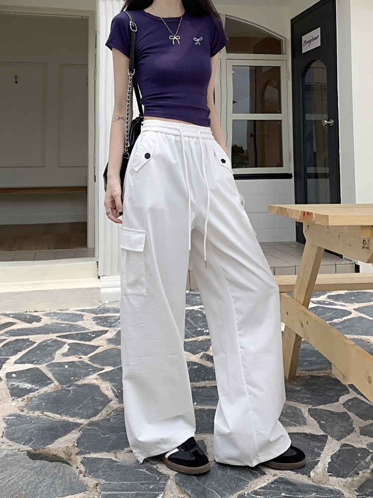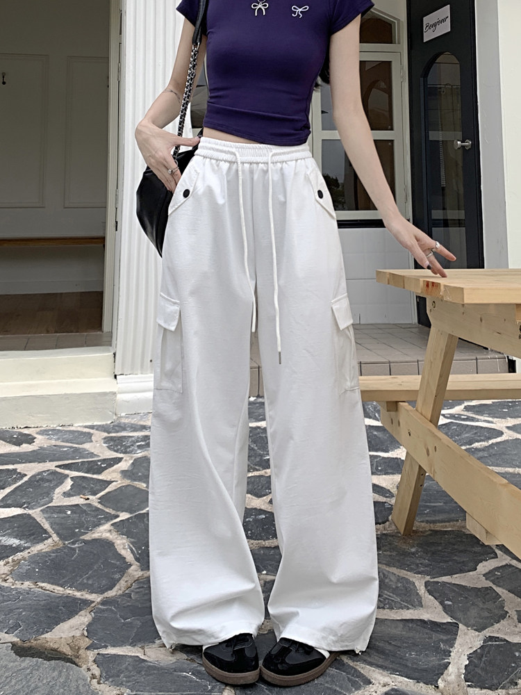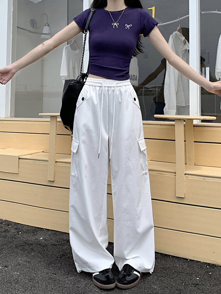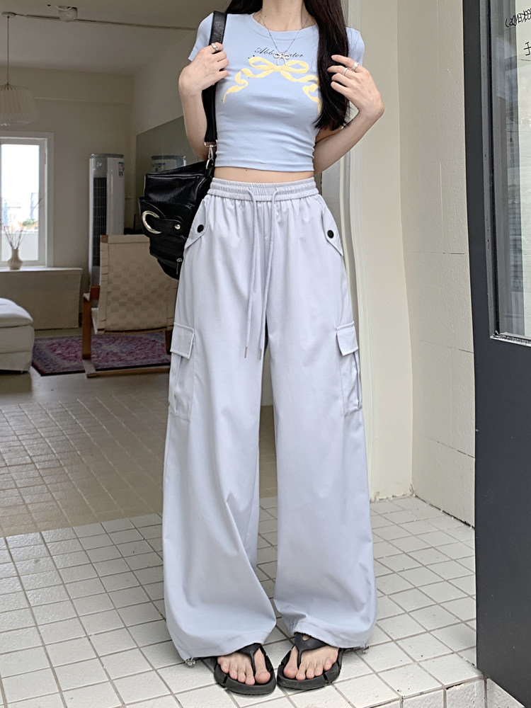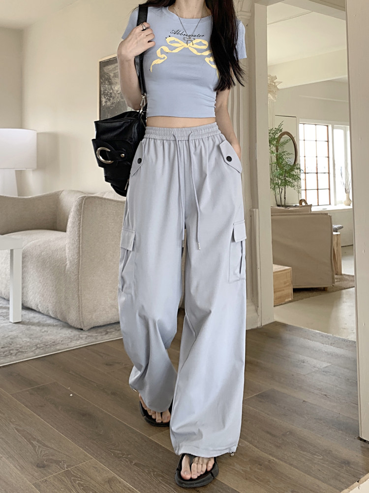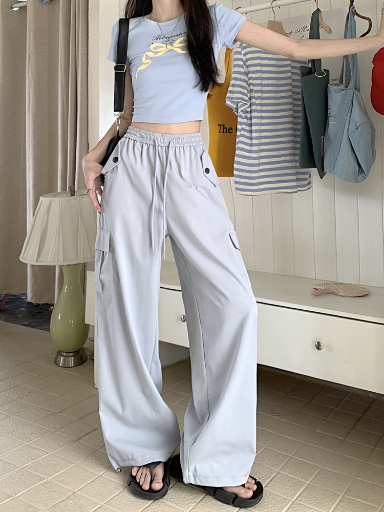 PPHOME拽酷先鋒~美式口袋工裝褲女夏季高腰濶腿休閒褲運動褲長褲