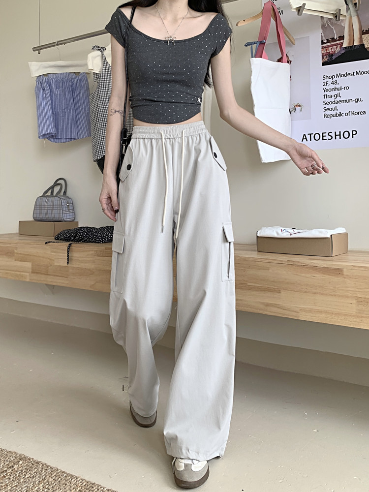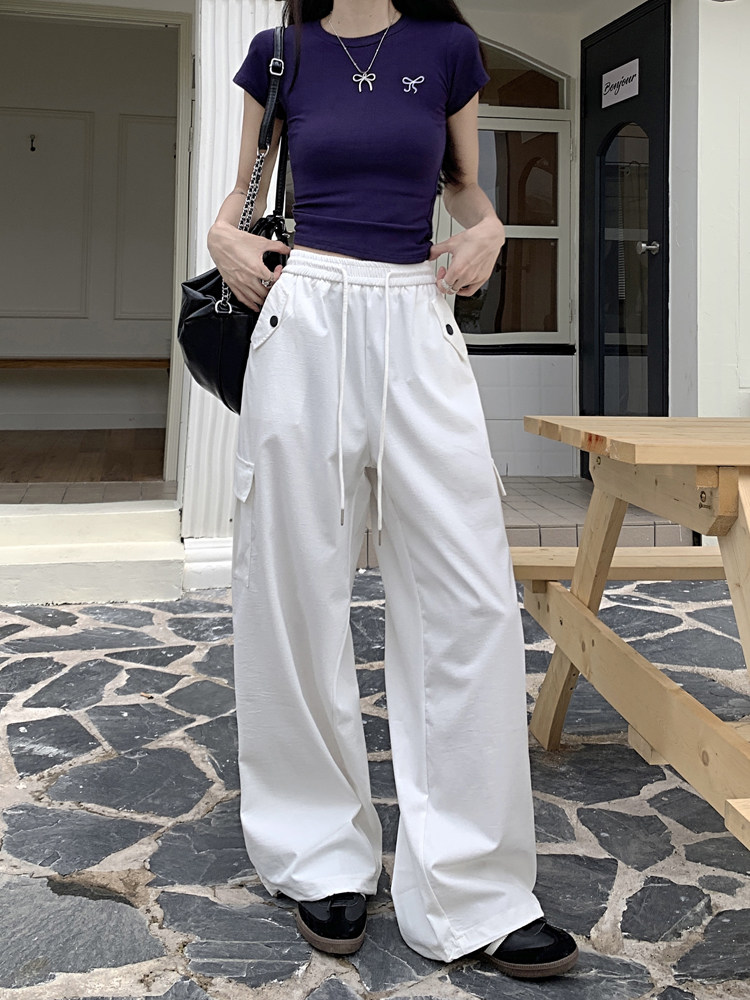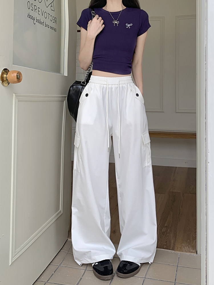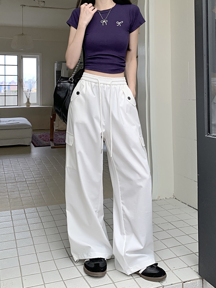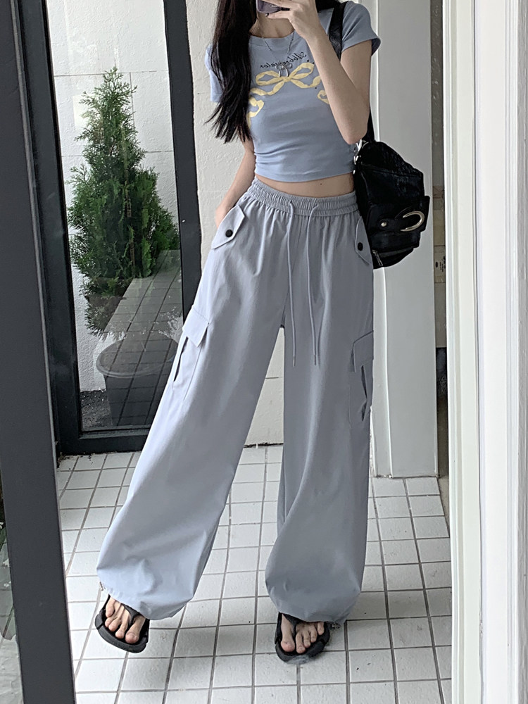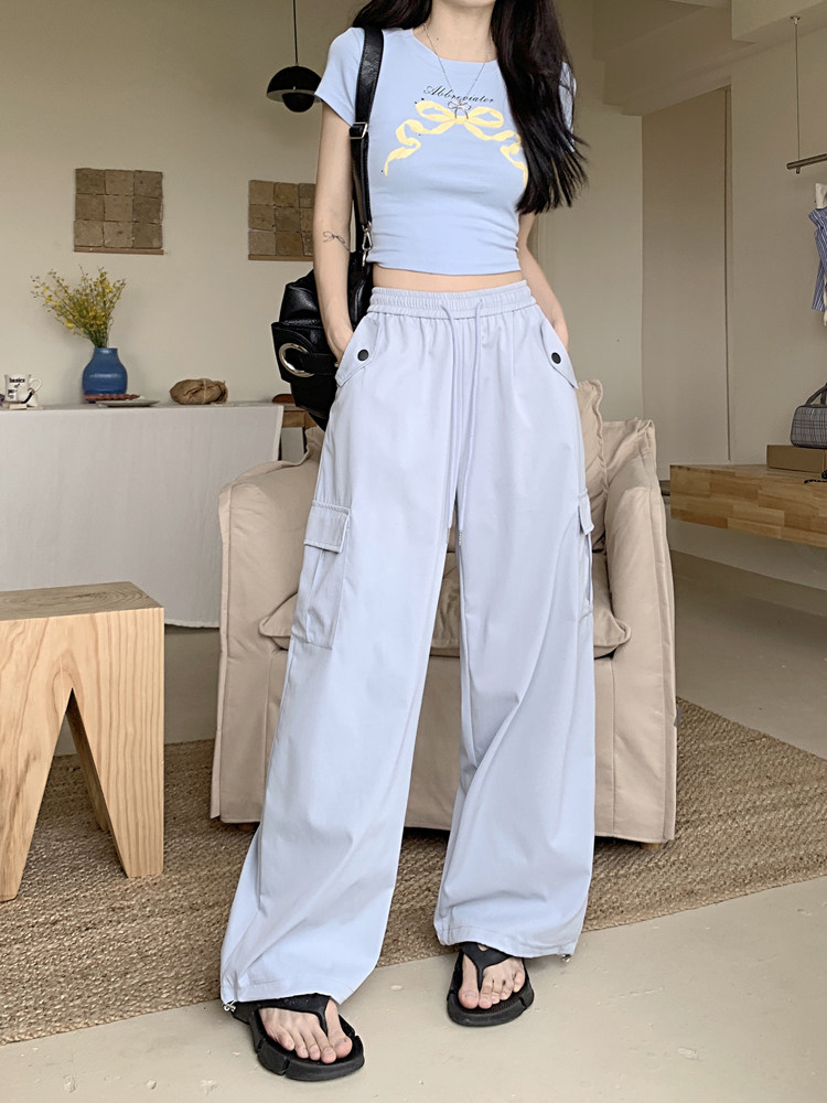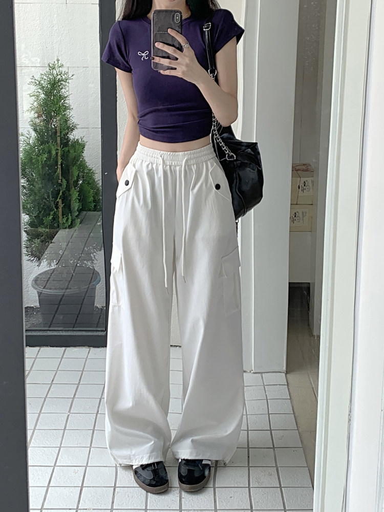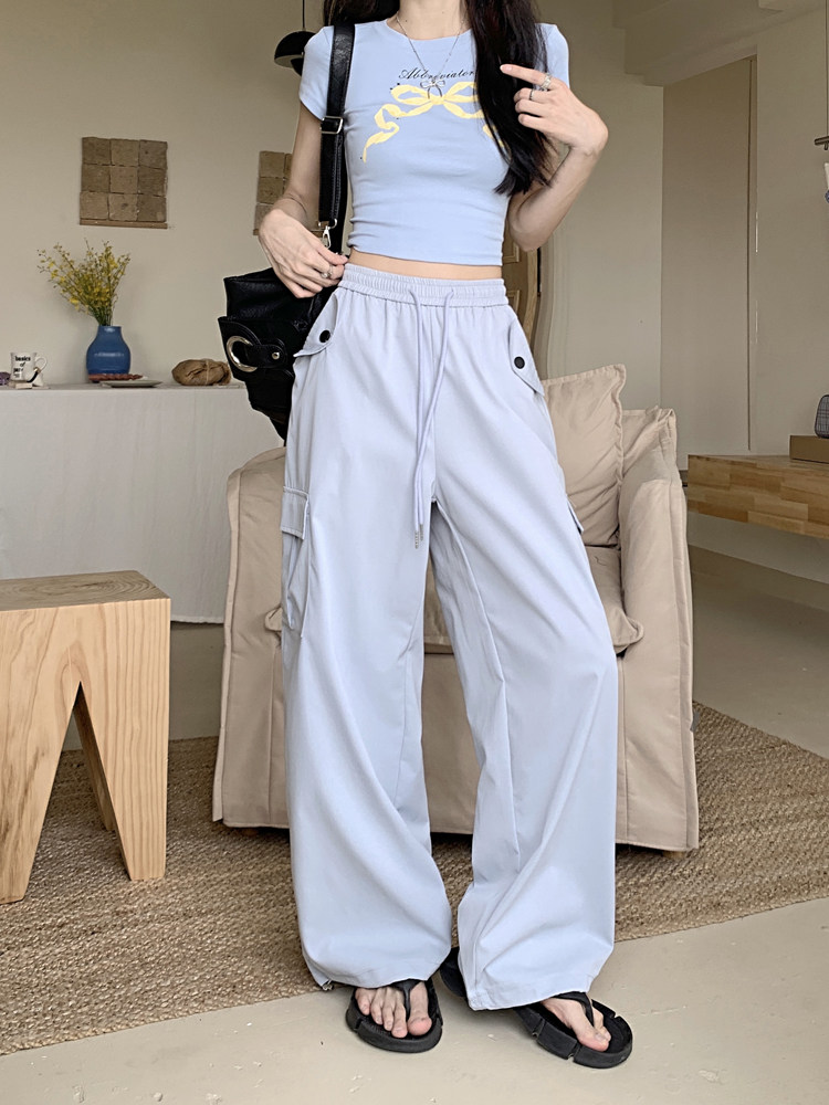 PPHOME拽酷先鋒~美式口袋工裝褲女夏季高腰濶腿休閒褲運動褲長褲