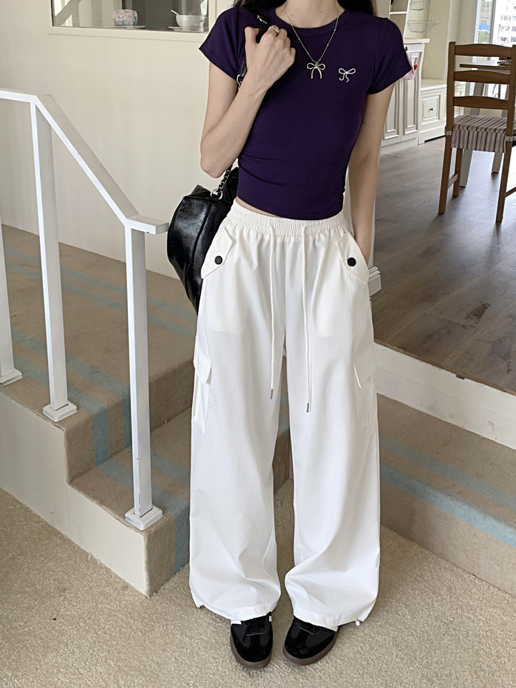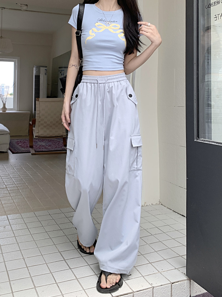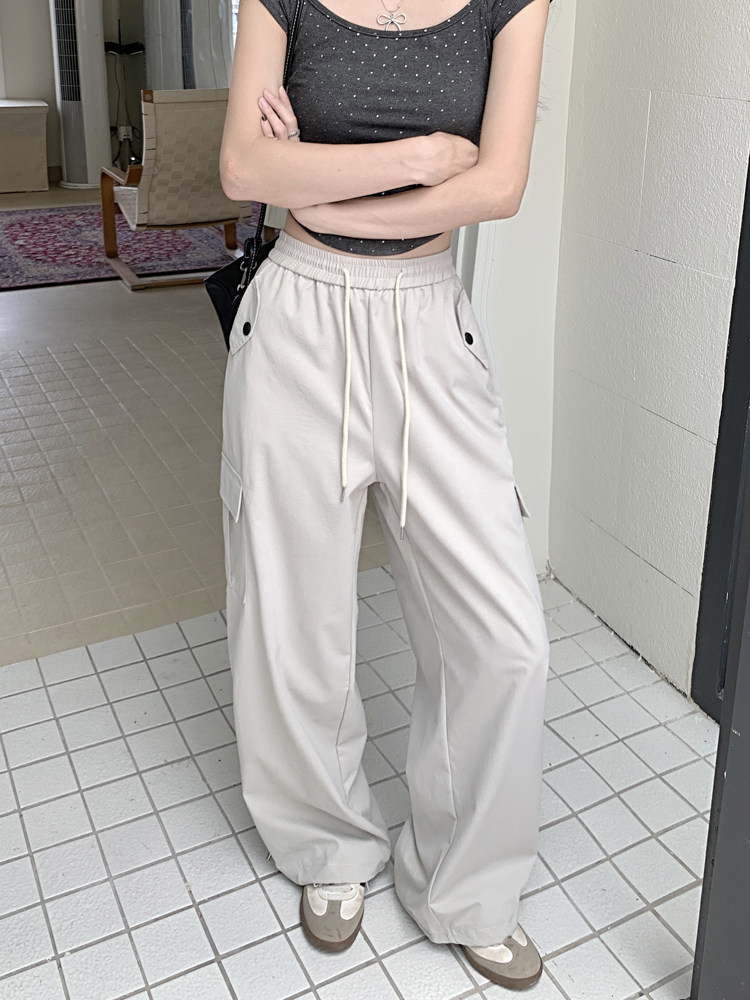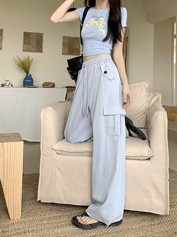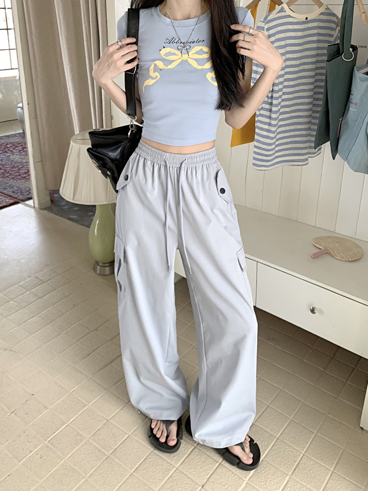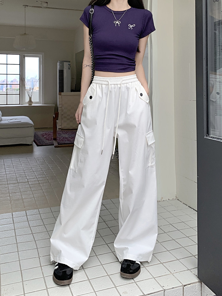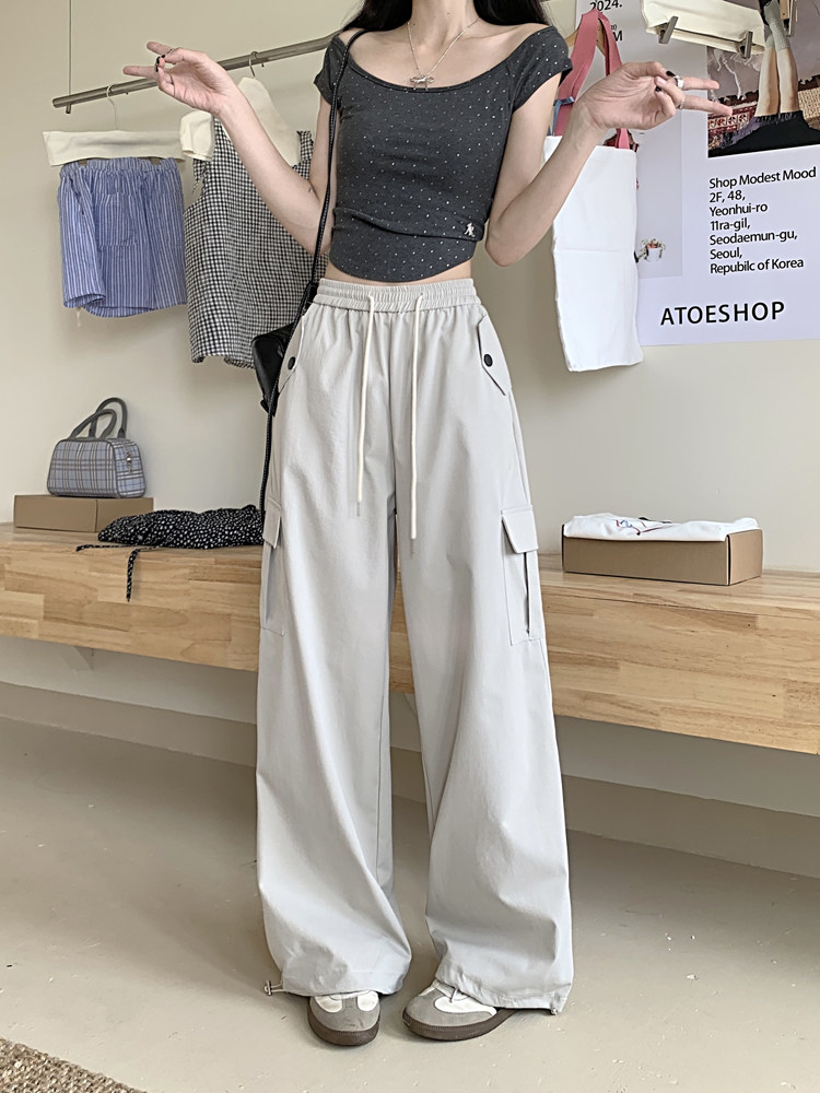 PPHOME拽酷先鋒~美式口袋工裝褲女夏季高腰濶腿休閒褲運動褲長褲