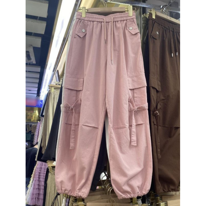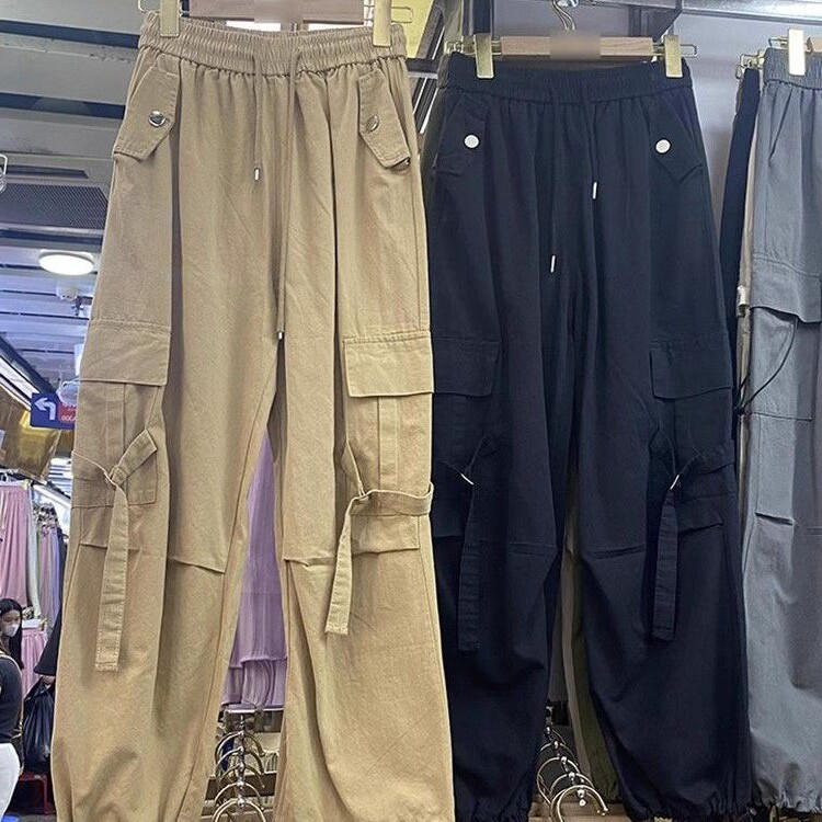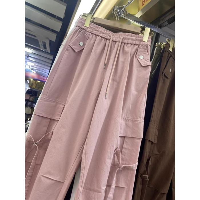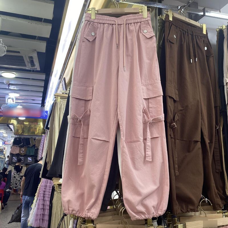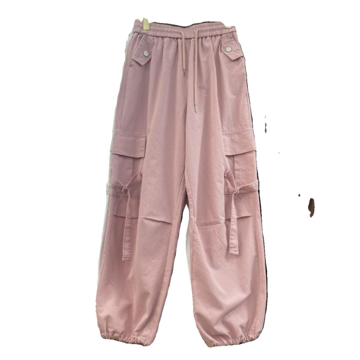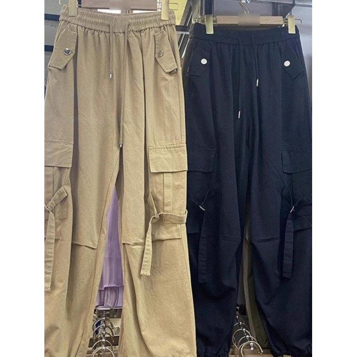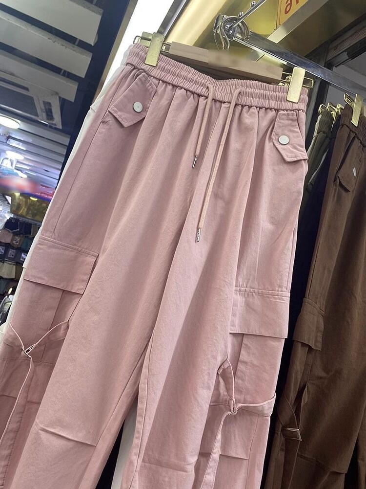 胖mm大碼300斤美式復古束腳工裝褲女春秋高腰顯瘦直筒褲抽繩長褲