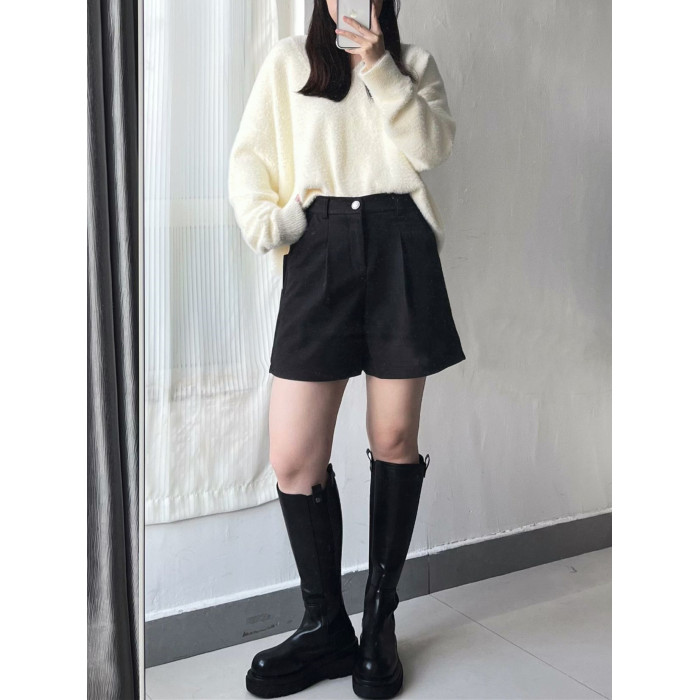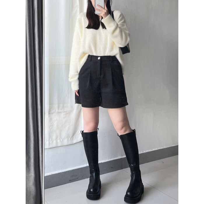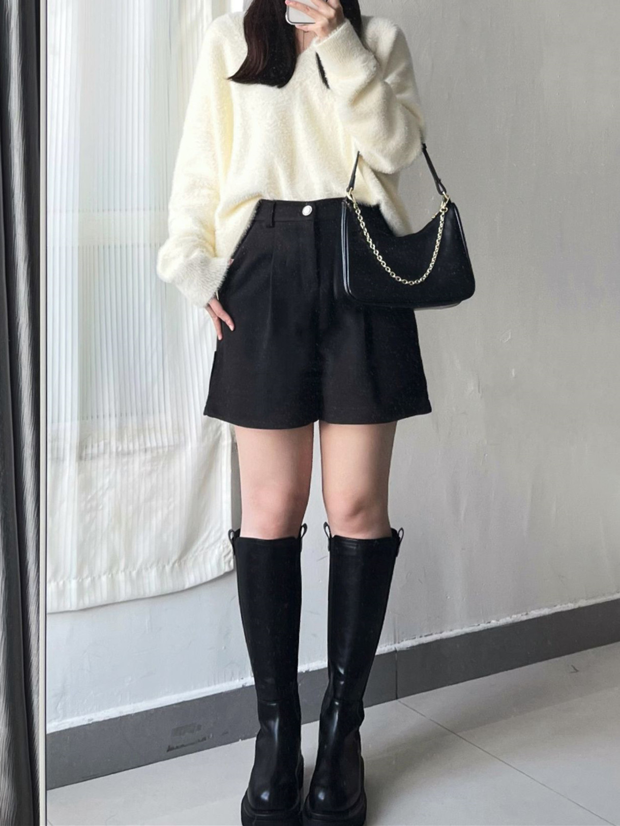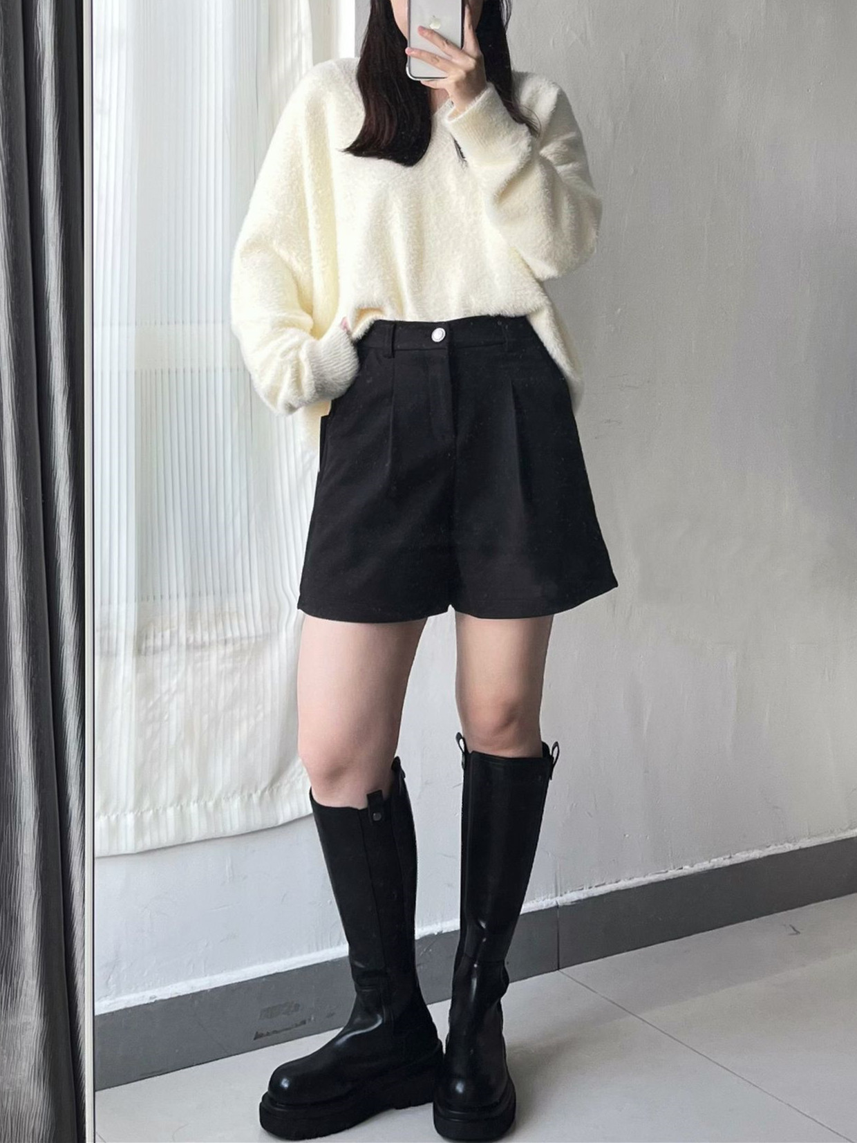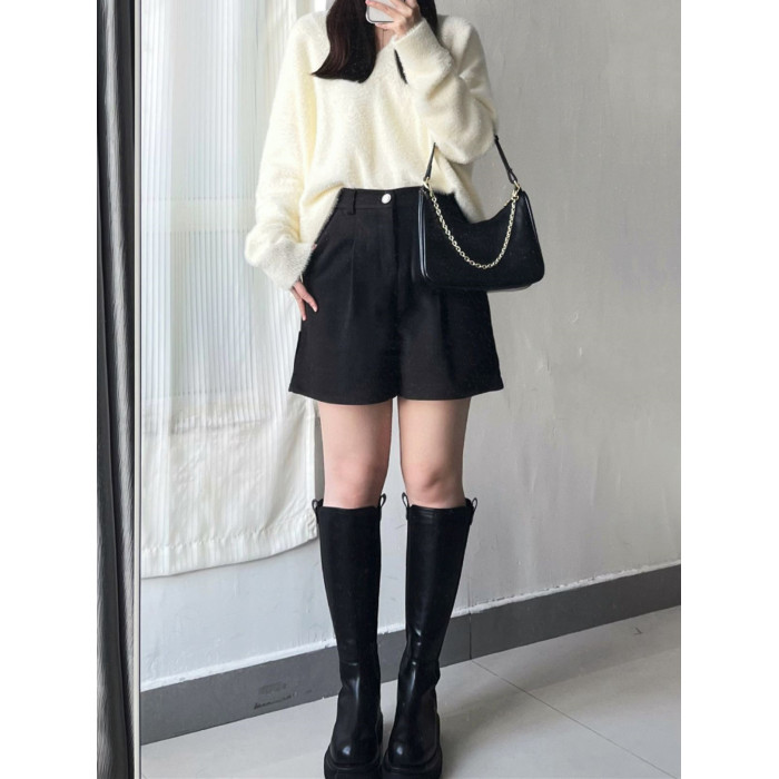 大碼微胖mm毛呢濶腿褲女春秋外穿加厚高腰a字短褲小個子打底靴褲