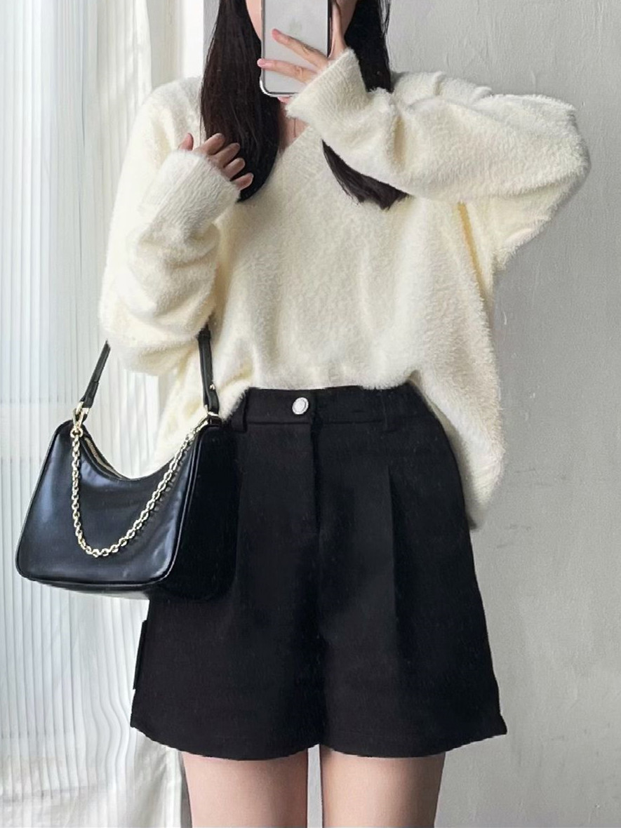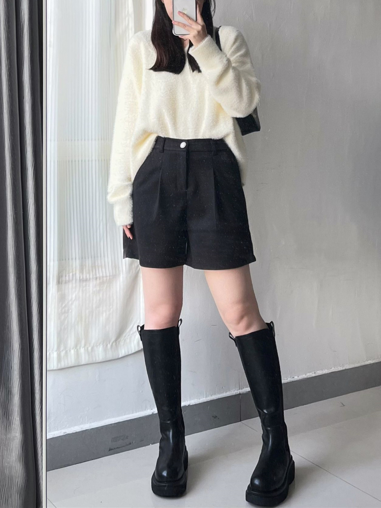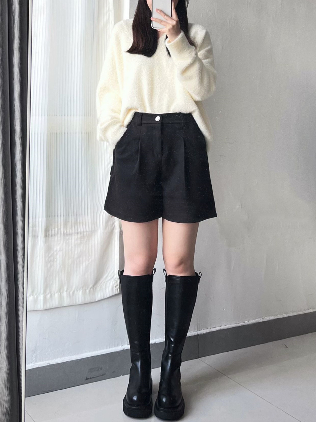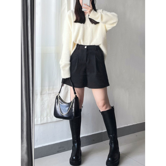 大碼微胖mm毛呢濶腿褲女春秋外穿加厚高腰a字短褲小個子打底靴褲