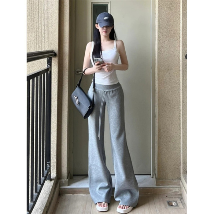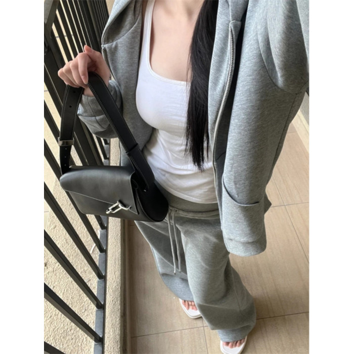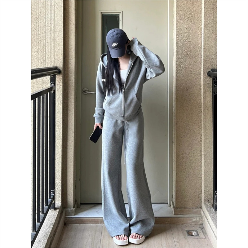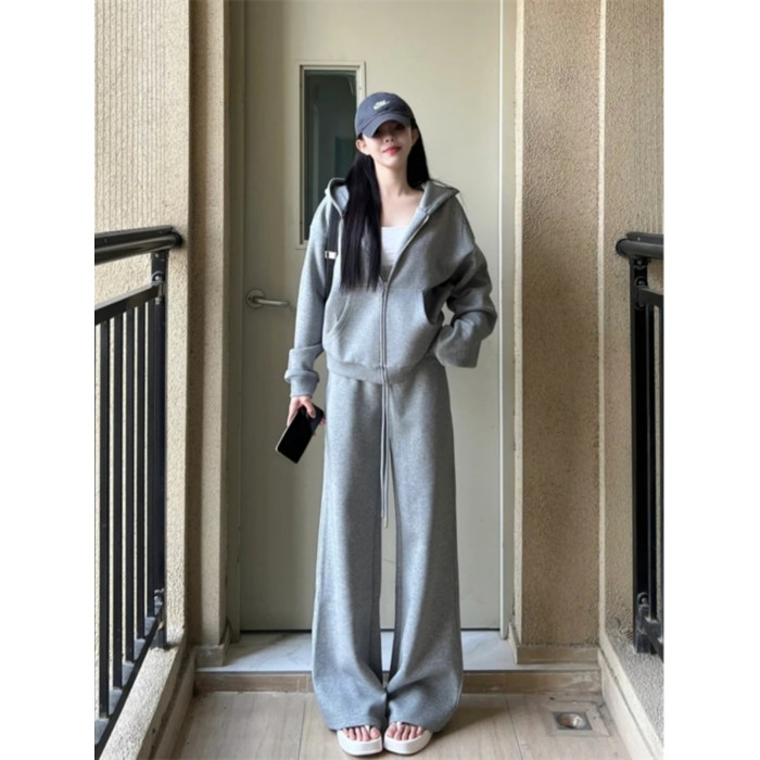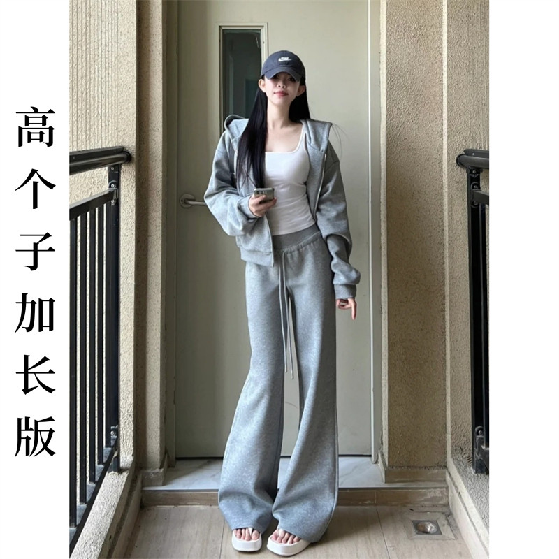 175高個子加長慵懶感灰色連帽外衣套裝女早春百搭濶腿休閒拖地褲