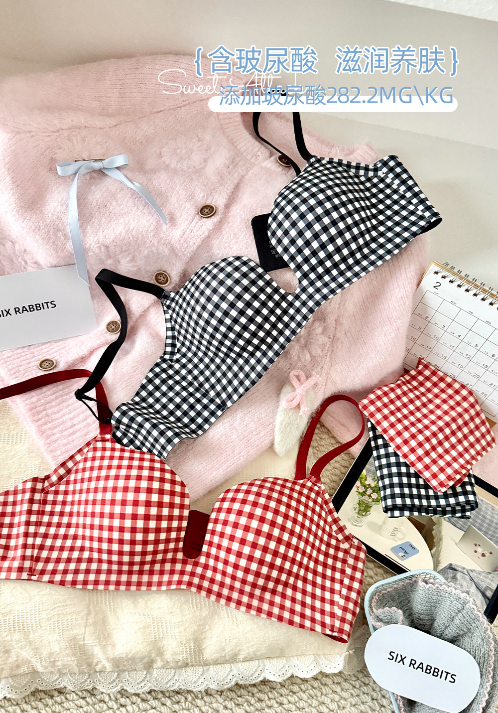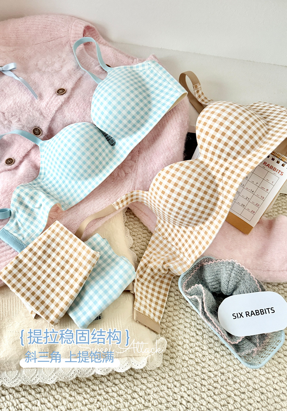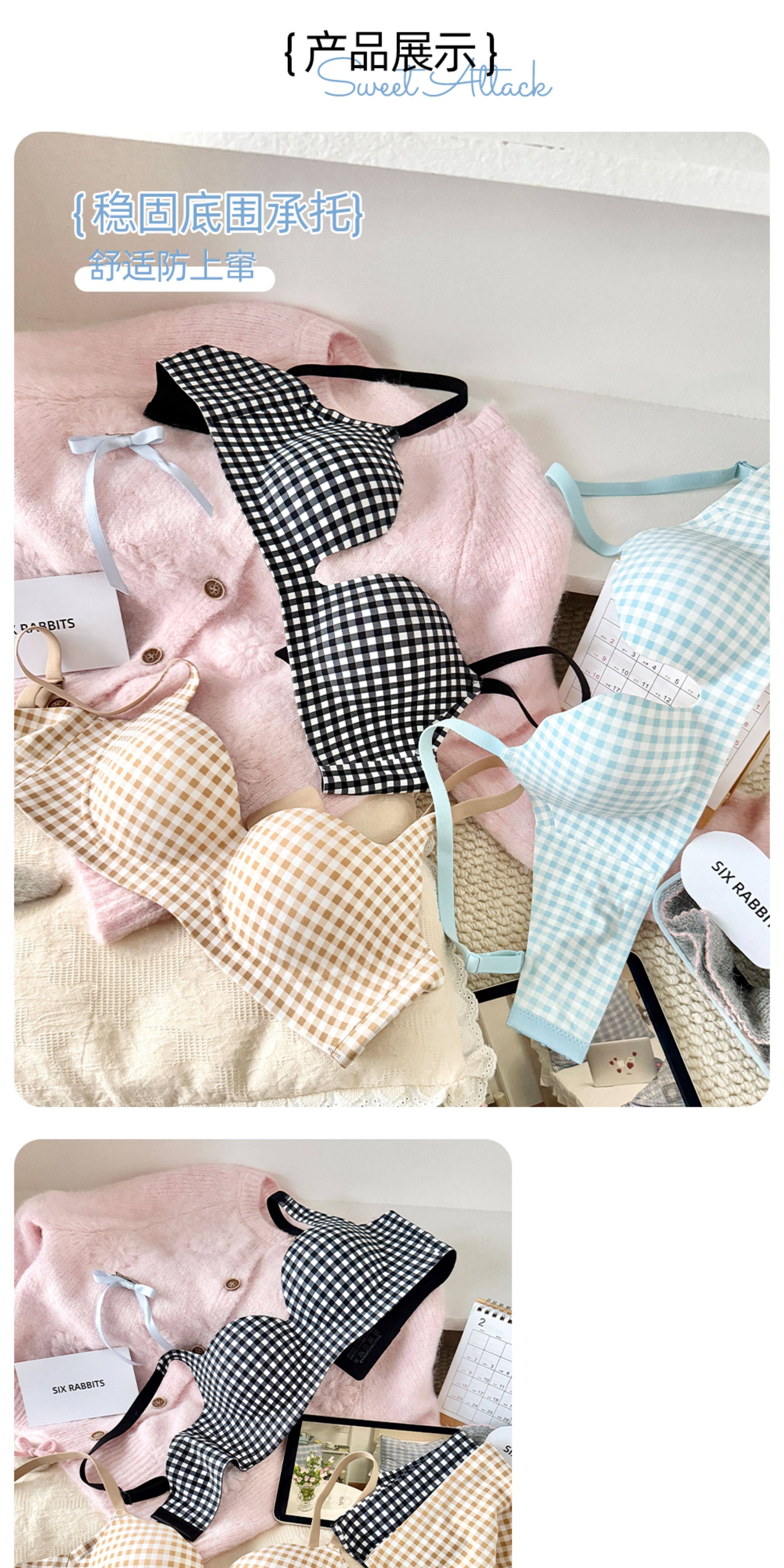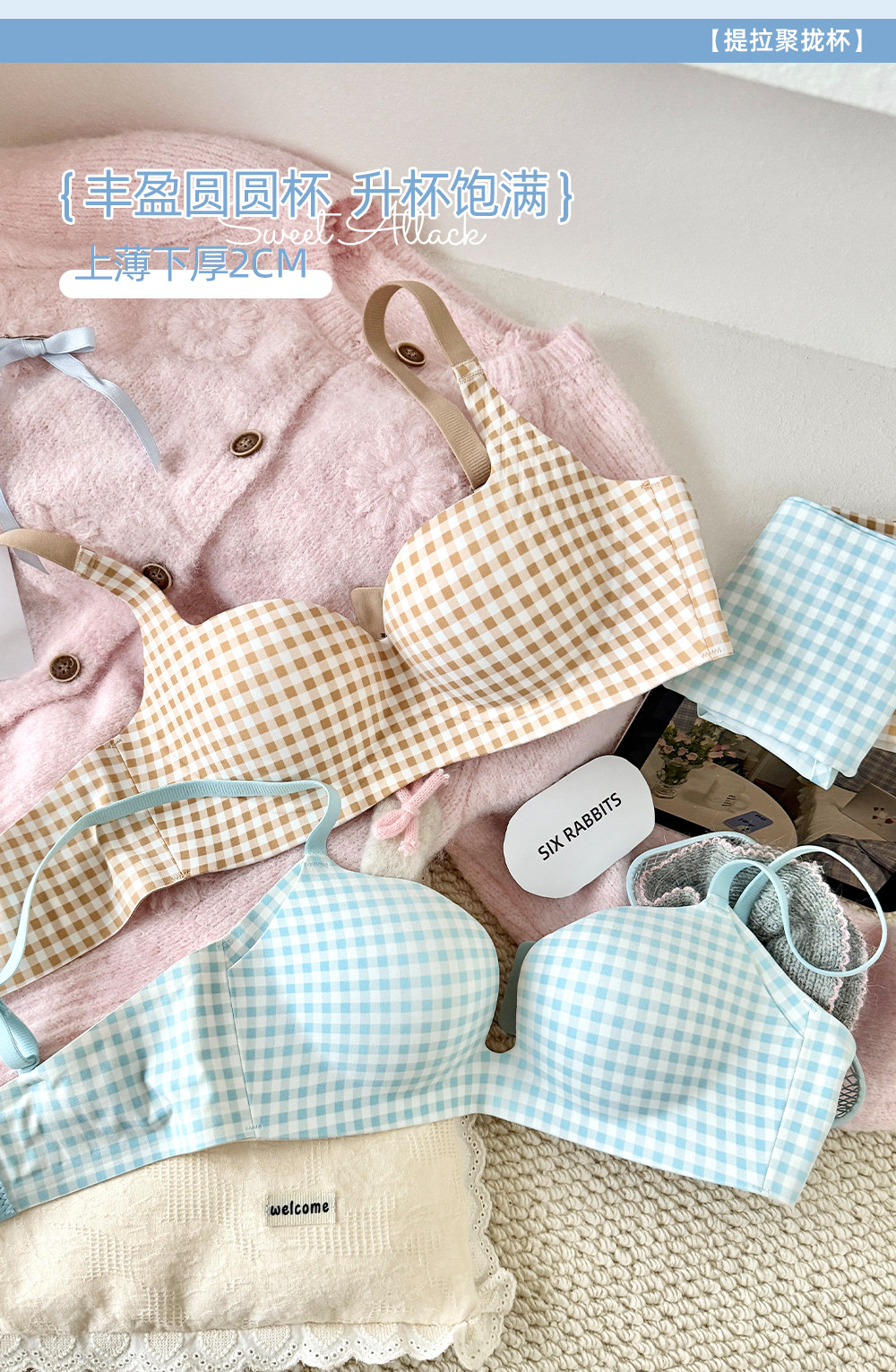 六隻兔子抑菌內衣女小胸聚攏升杯胸罩無鋼圈收副乳防下垂格子文胸