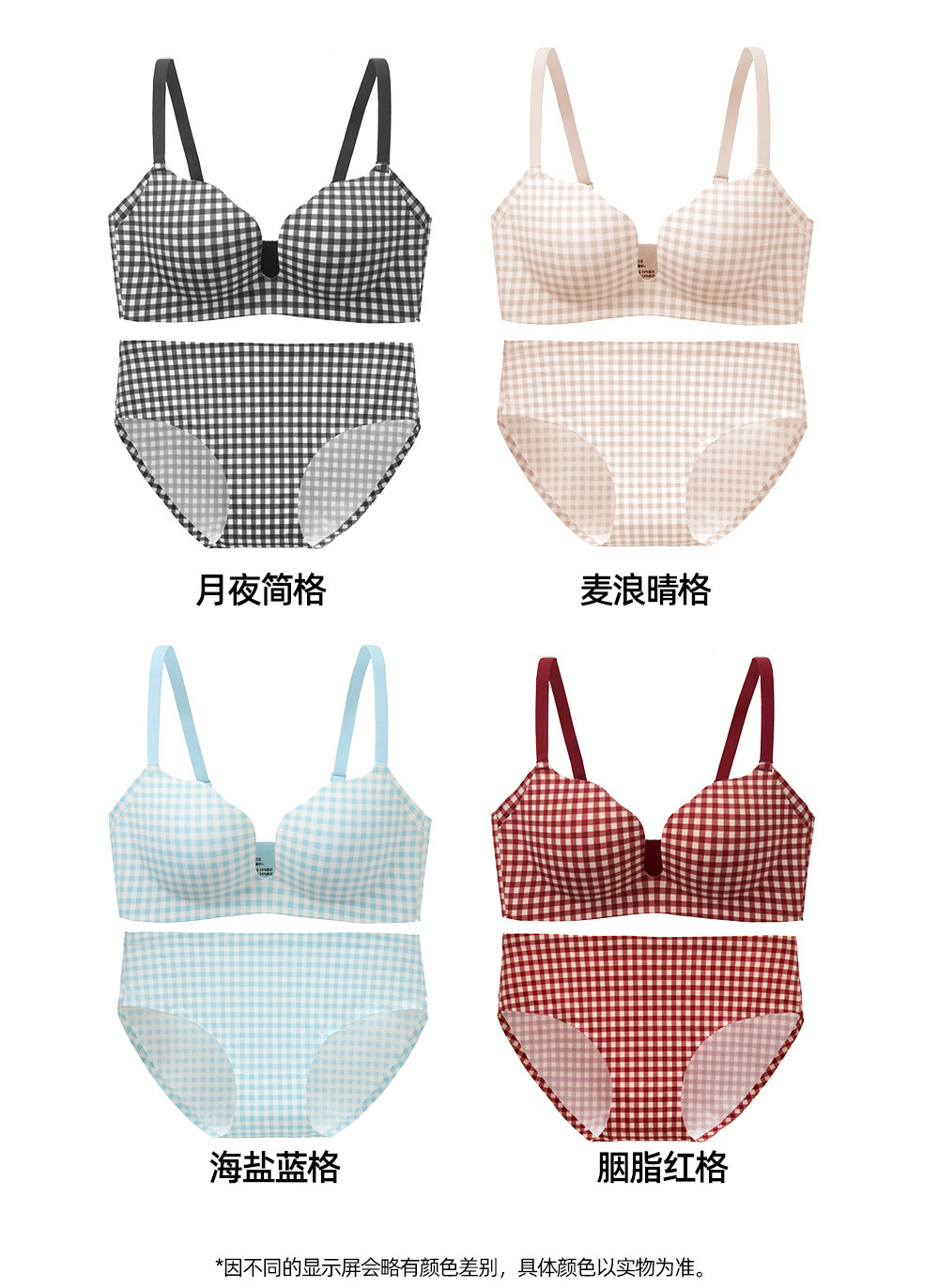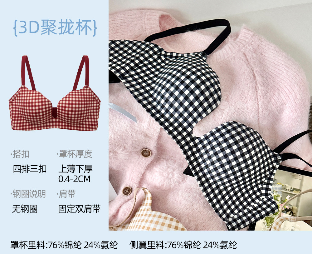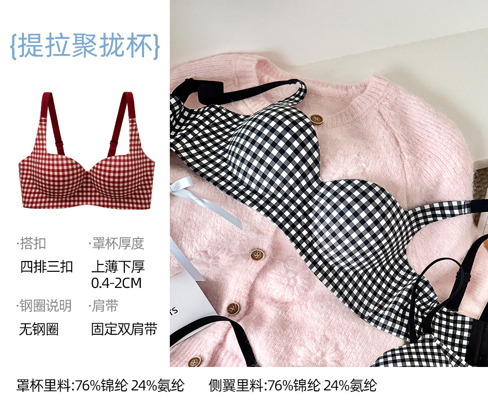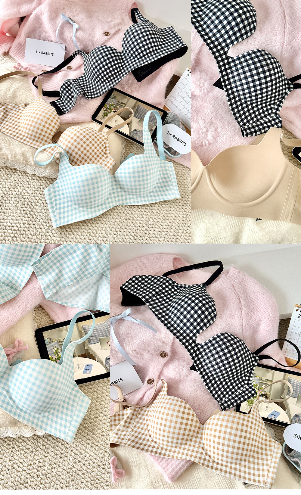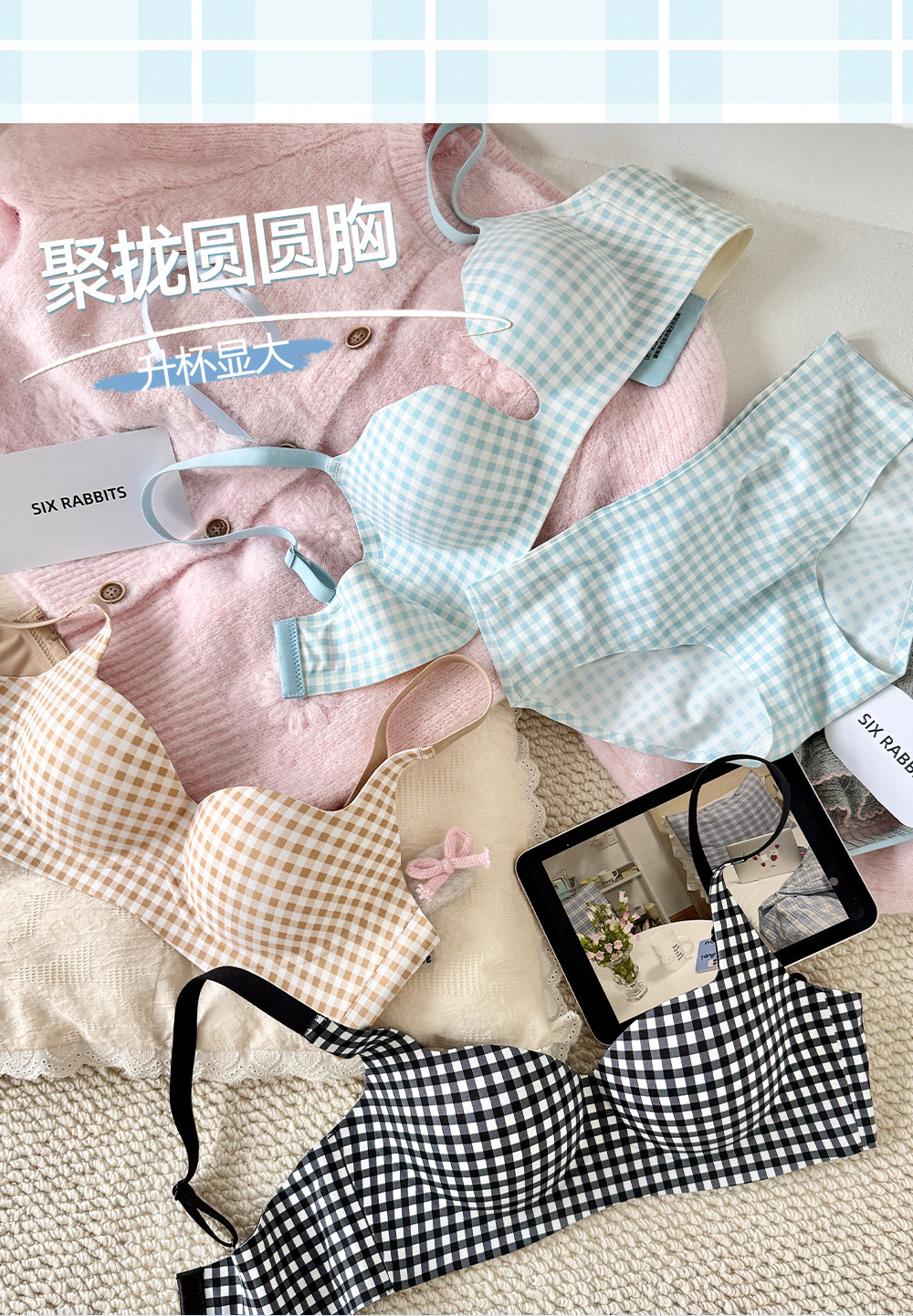 六隻兔子抑菌內衣女小胸聚攏升杯胸罩無鋼圈收副乳防下垂格子文胸