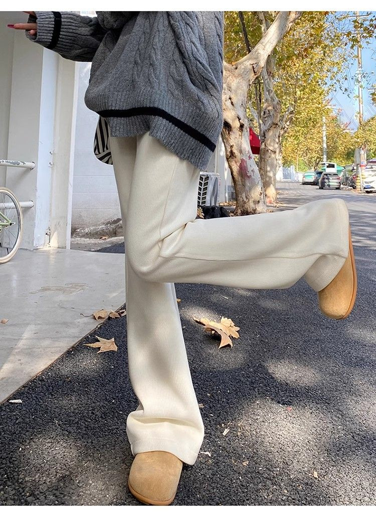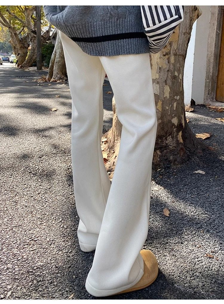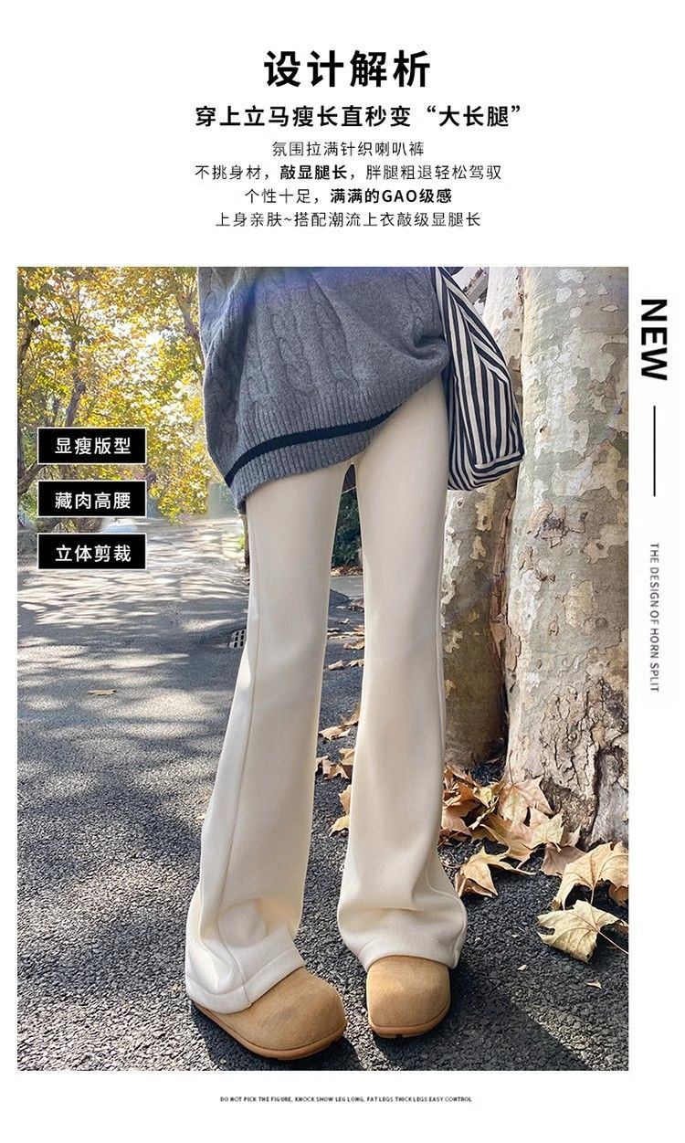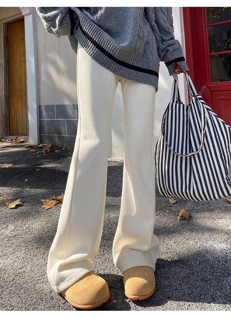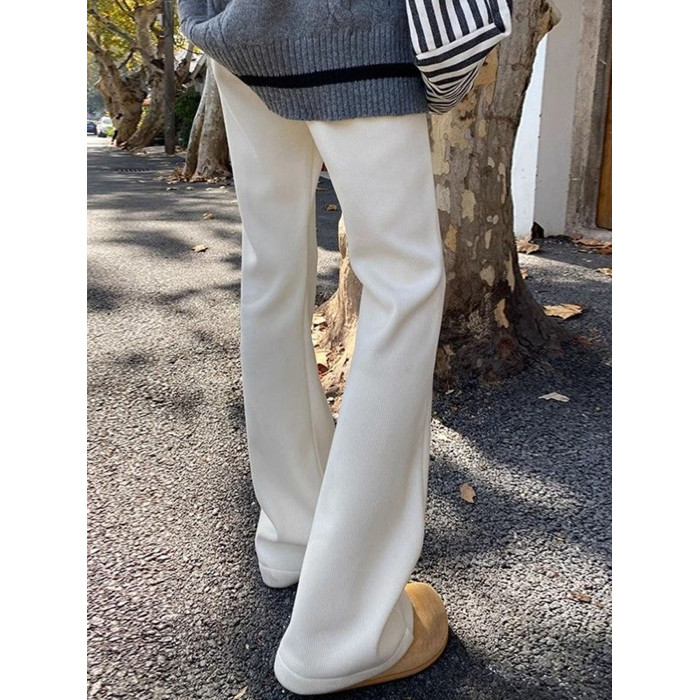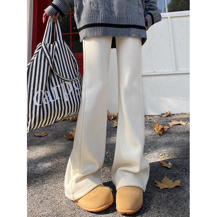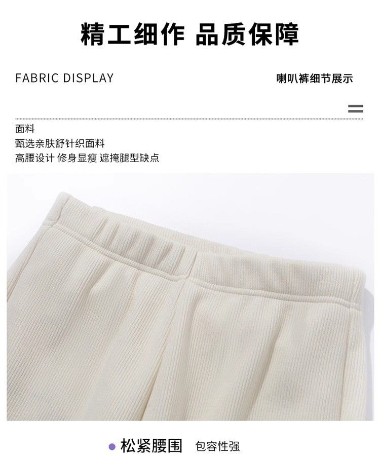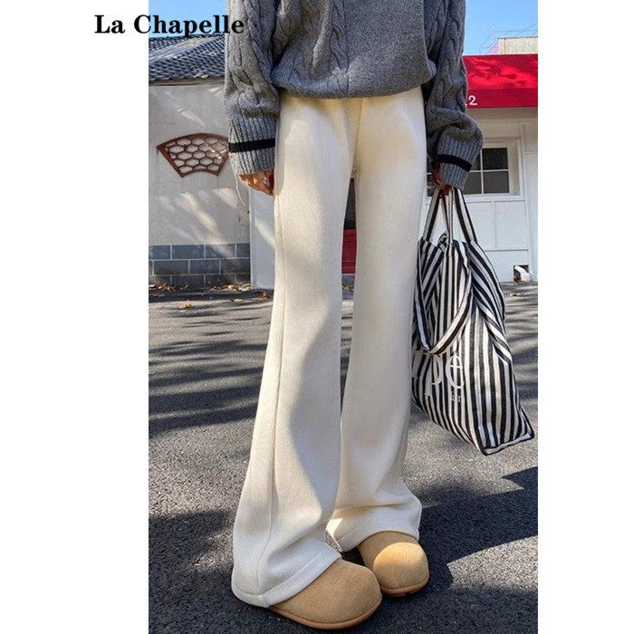 拉夏貝爾白色針織加絨微喇叭褲女2025新款秋冬季高腰顯瘦休閒褲子