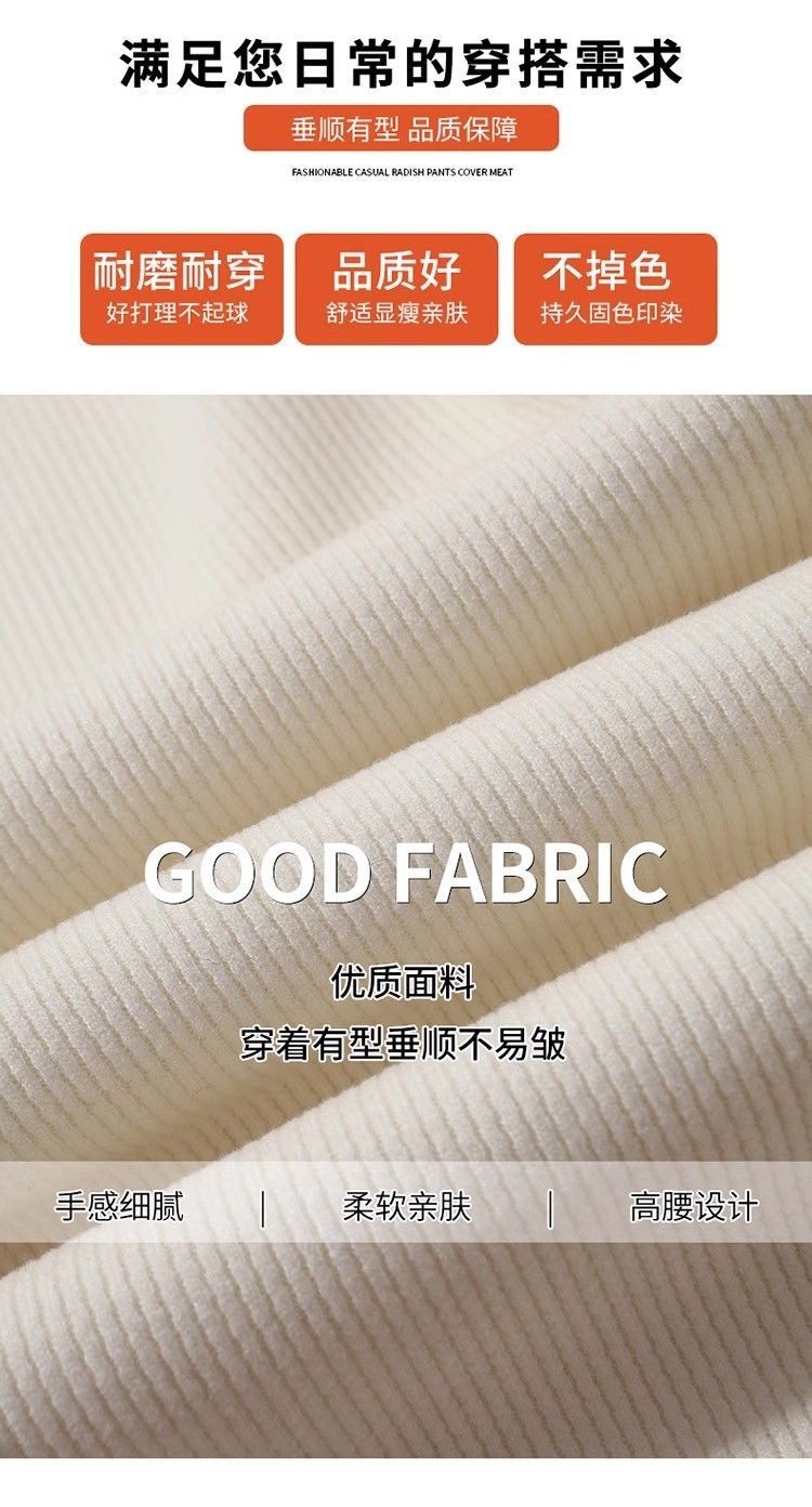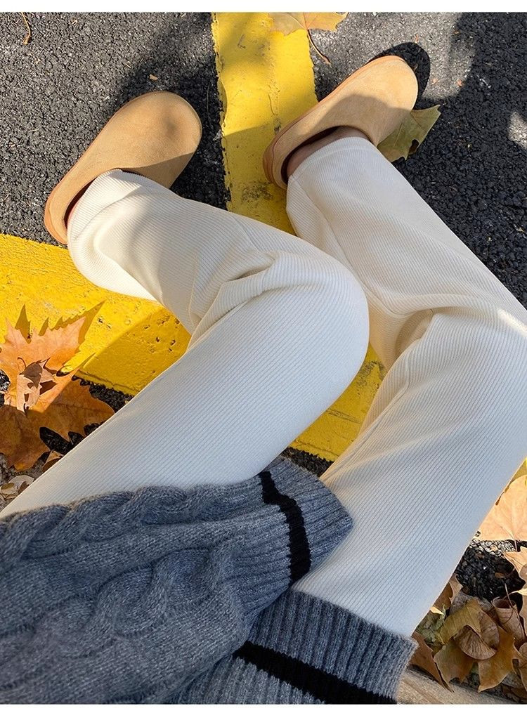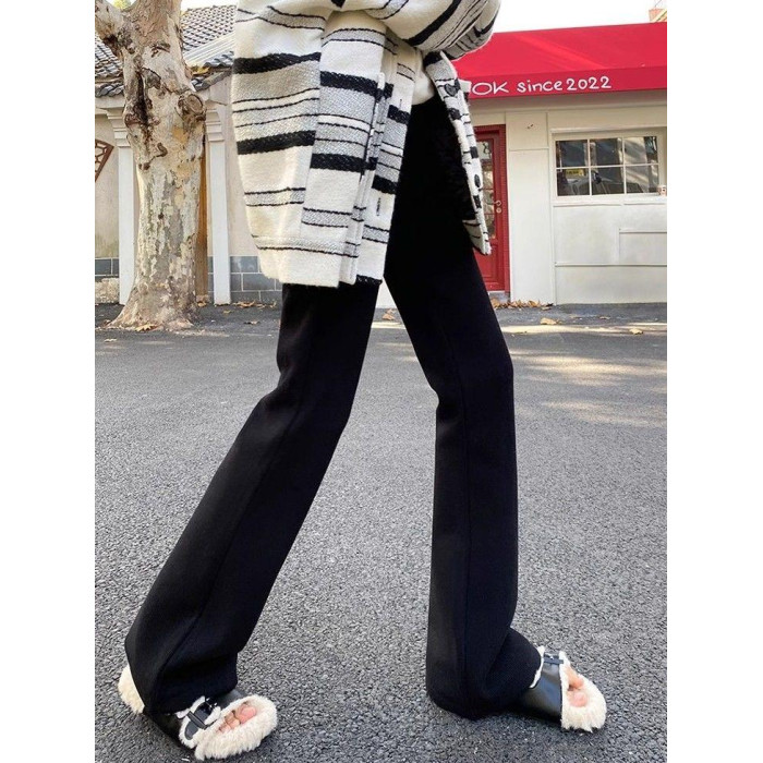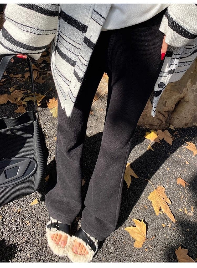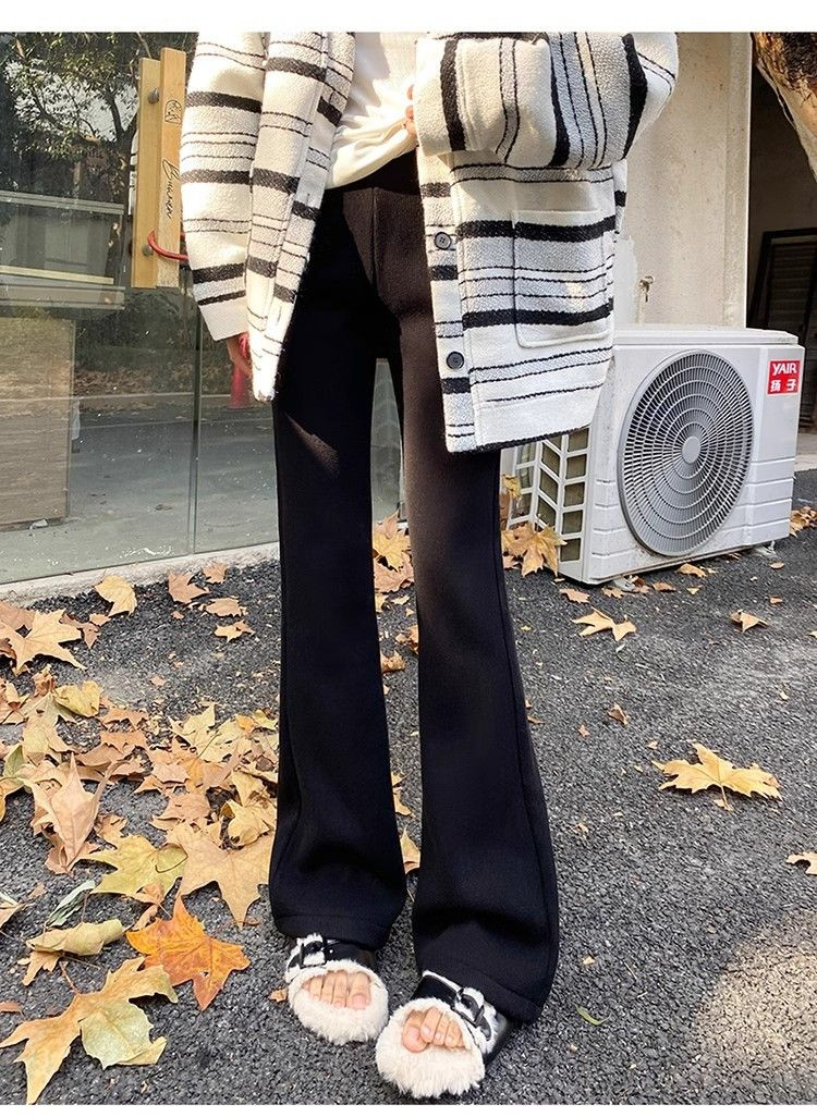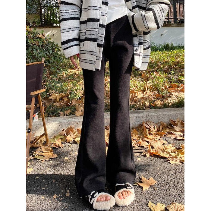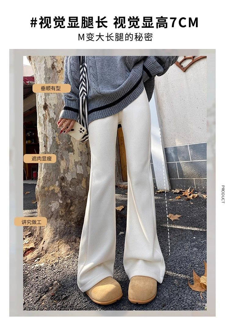 拉夏貝爾白色針織加絨微喇叭褲女2025新款秋冬季高腰顯瘦休閒褲子