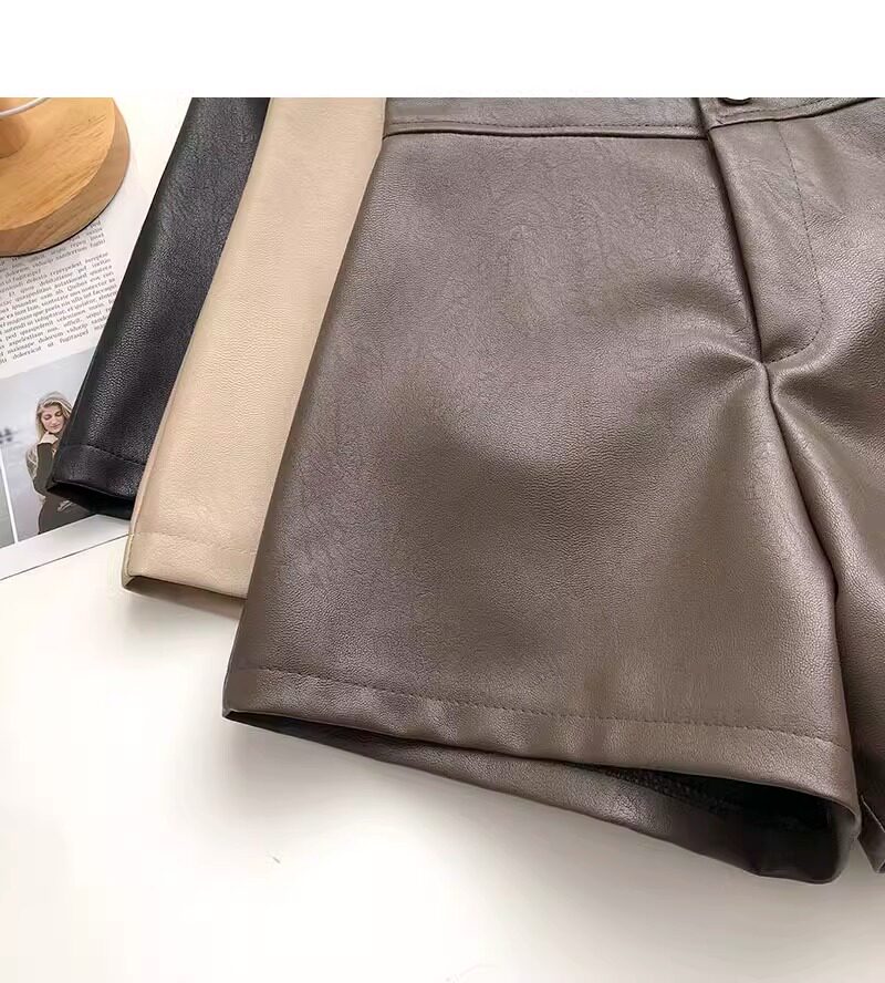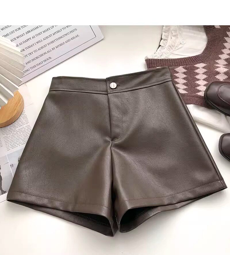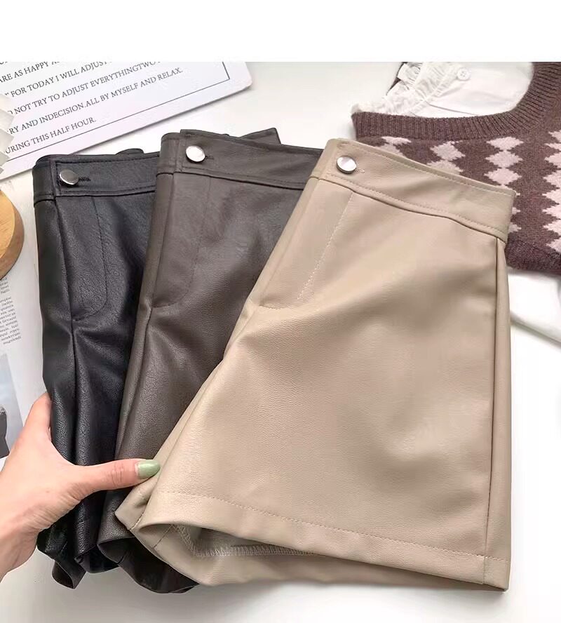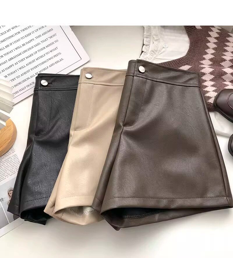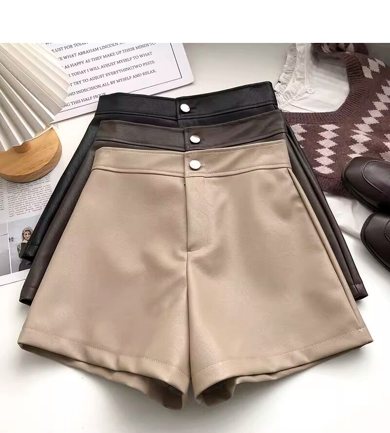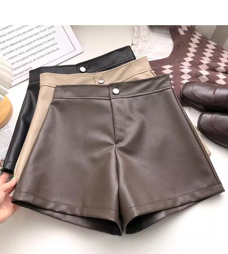 一粒釦高腰PU皮A字休閒褲女2022年秋裝韓版時尚百搭外穿濶腿短褲
