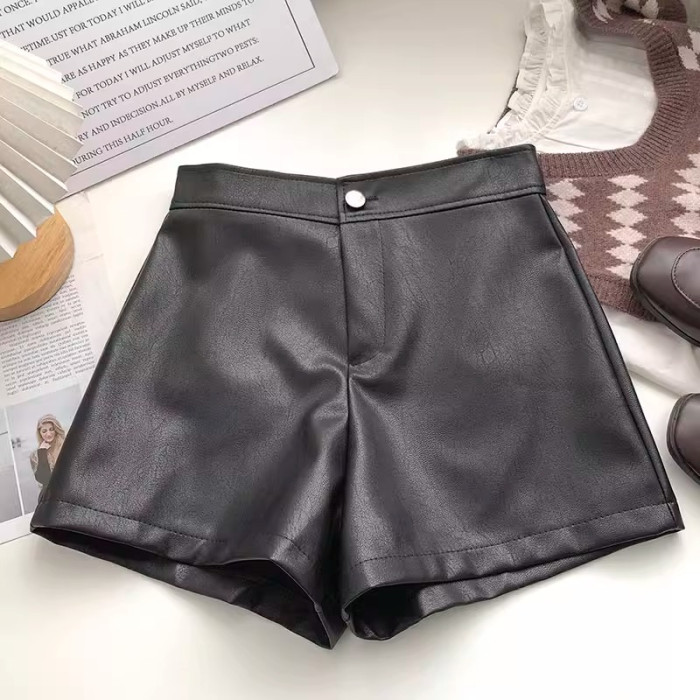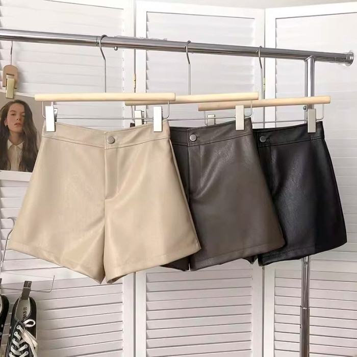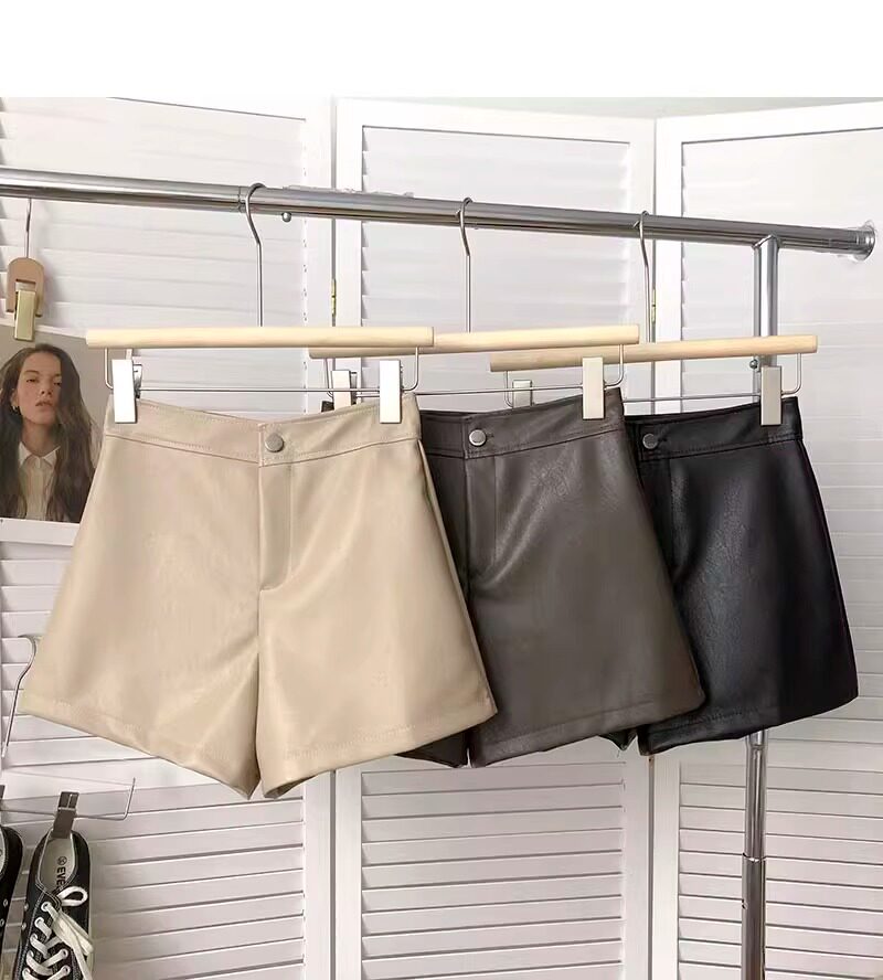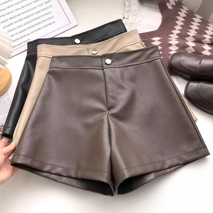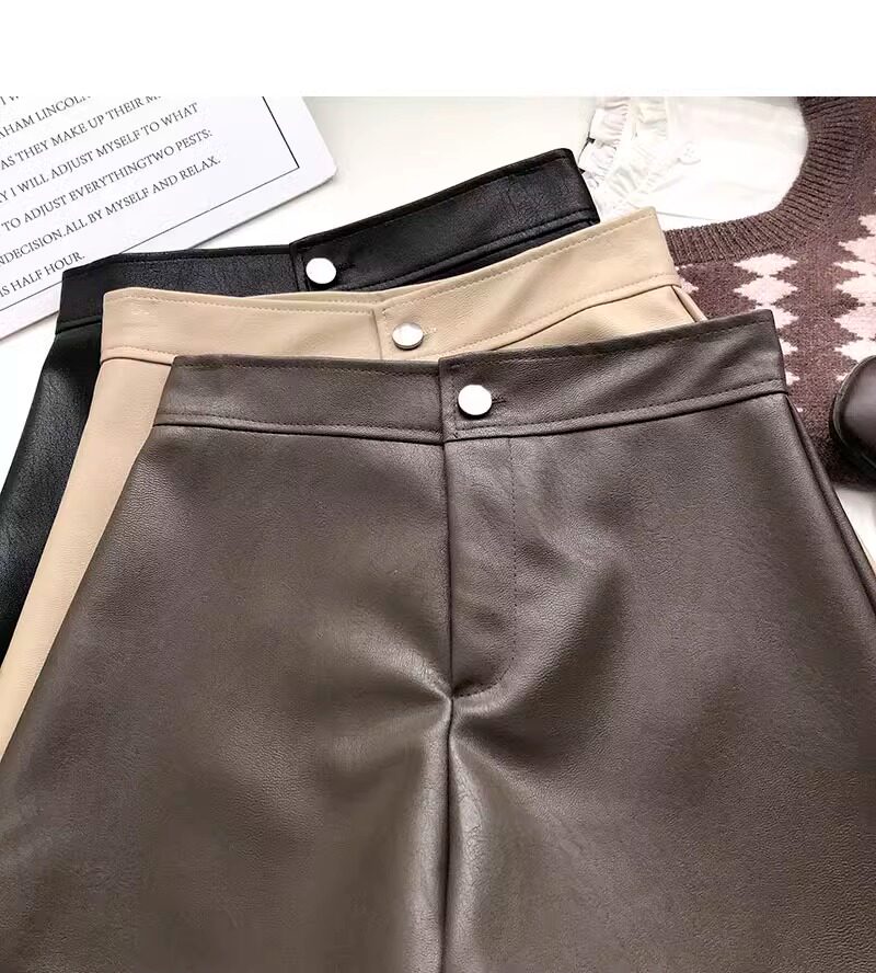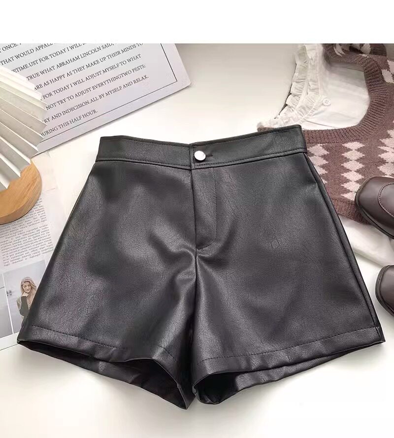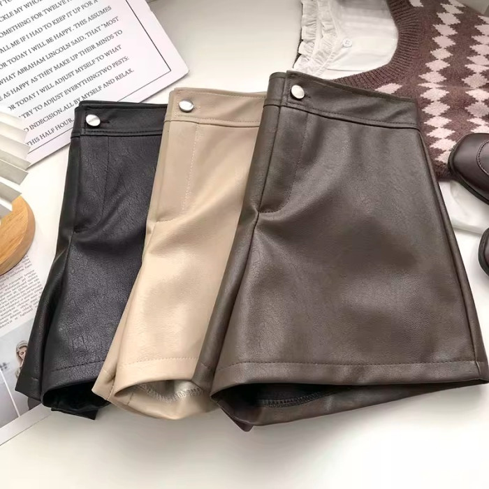 一粒釦高腰PU皮A字休閒褲女2022年秋裝韓版時尚百搭外穿濶腿短褲
