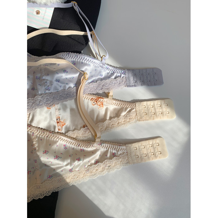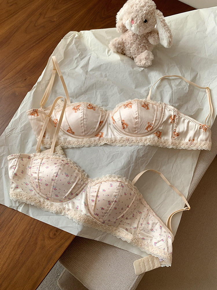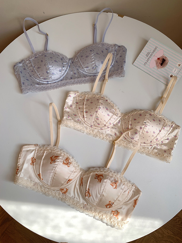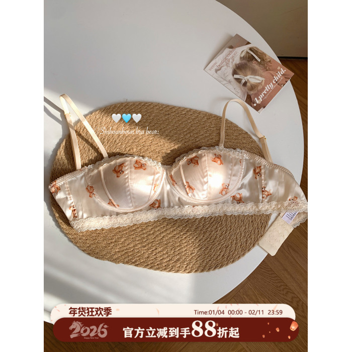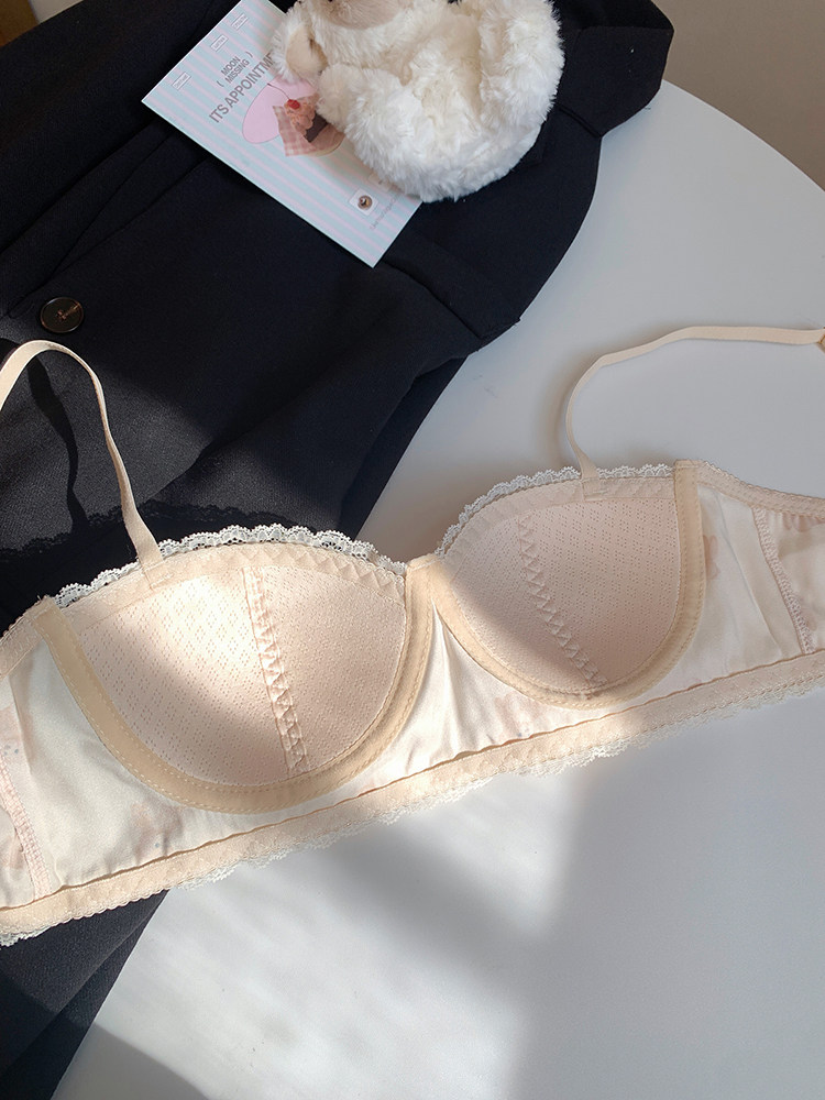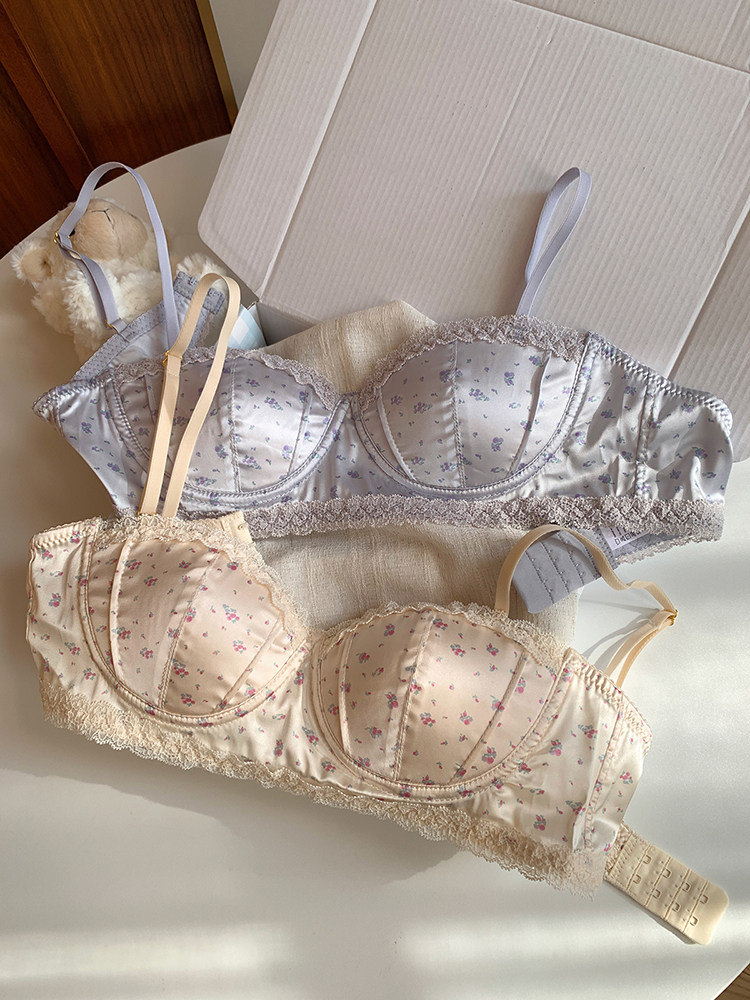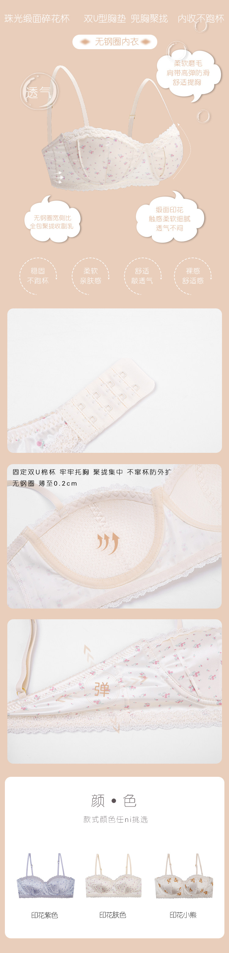 馨幫幫Bra 法式蕾絲碎花貝殼杯內衣女薄款無鋼圈小胸聚攏緞面文胸