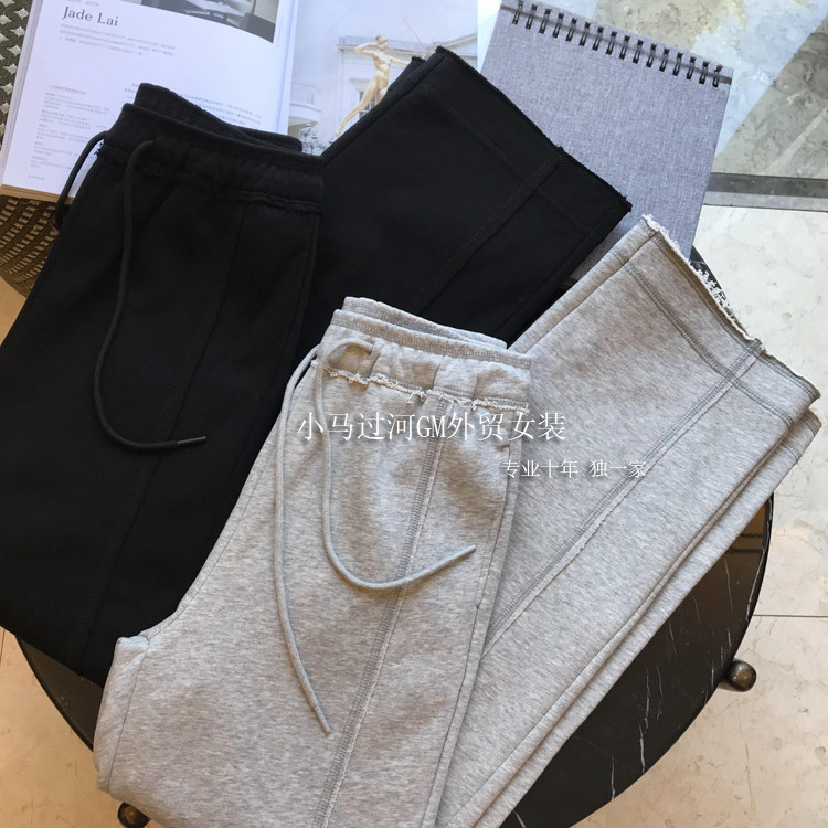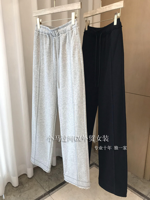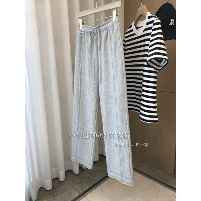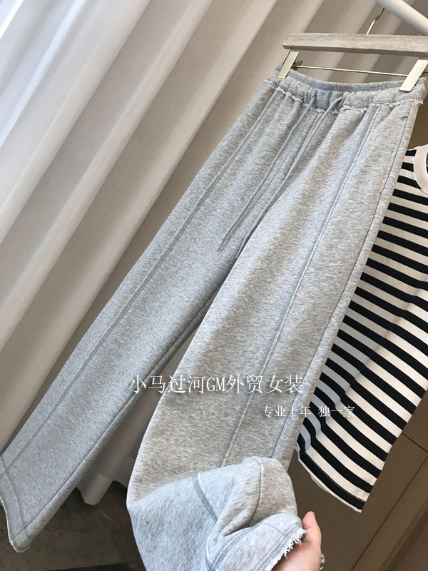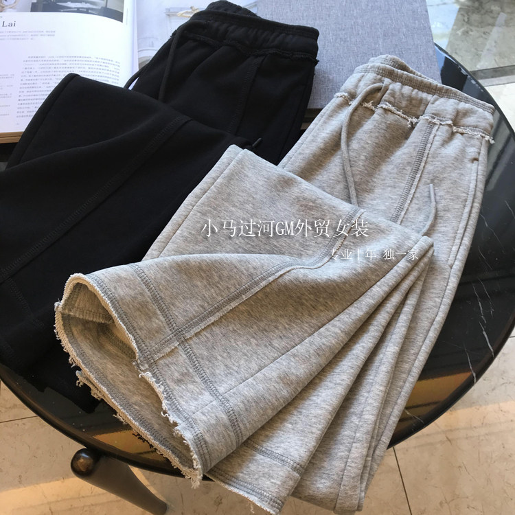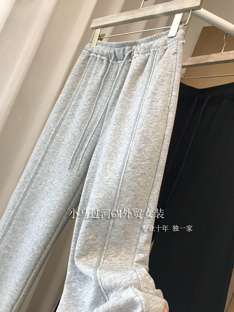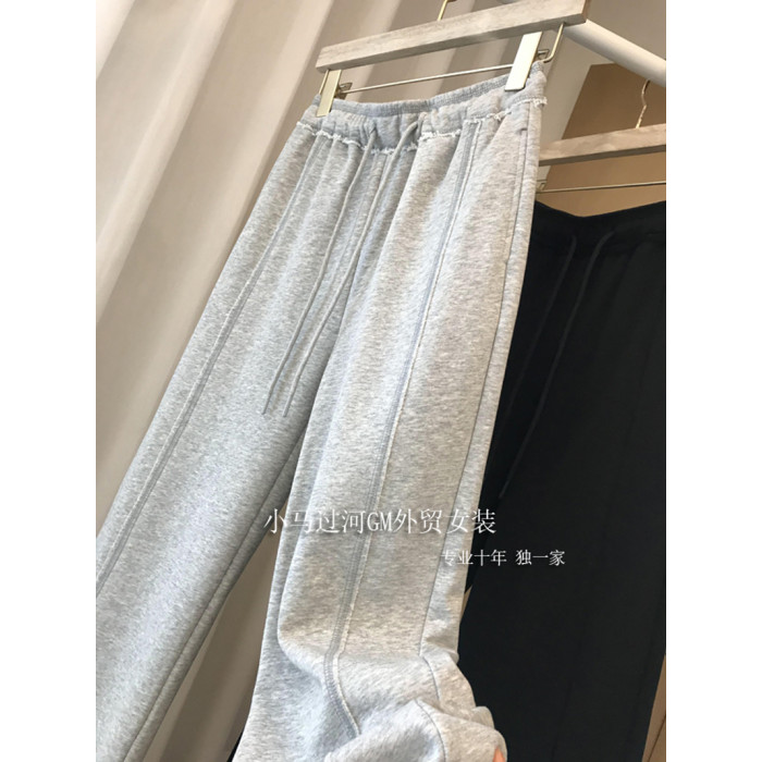 秋季2025新款灰色運動褲顯瘦高腰直筒濶腿褲毛邊休閒褲女春秋褲子