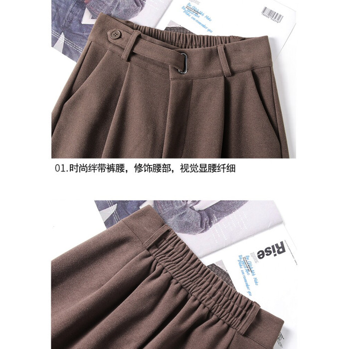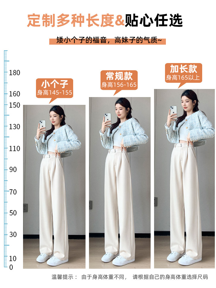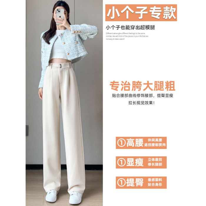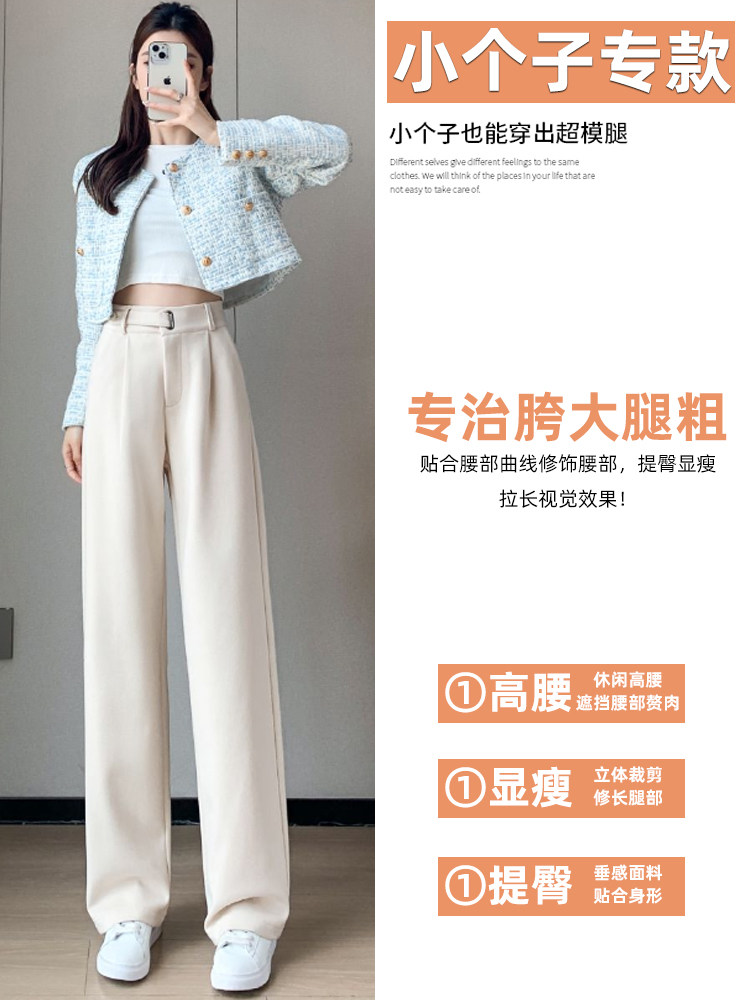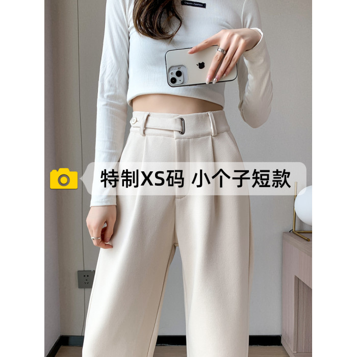 小個子杏色毛呢濶腿褲女秋冬季加厚高腰窄版直筒褲150cm顯高褲子