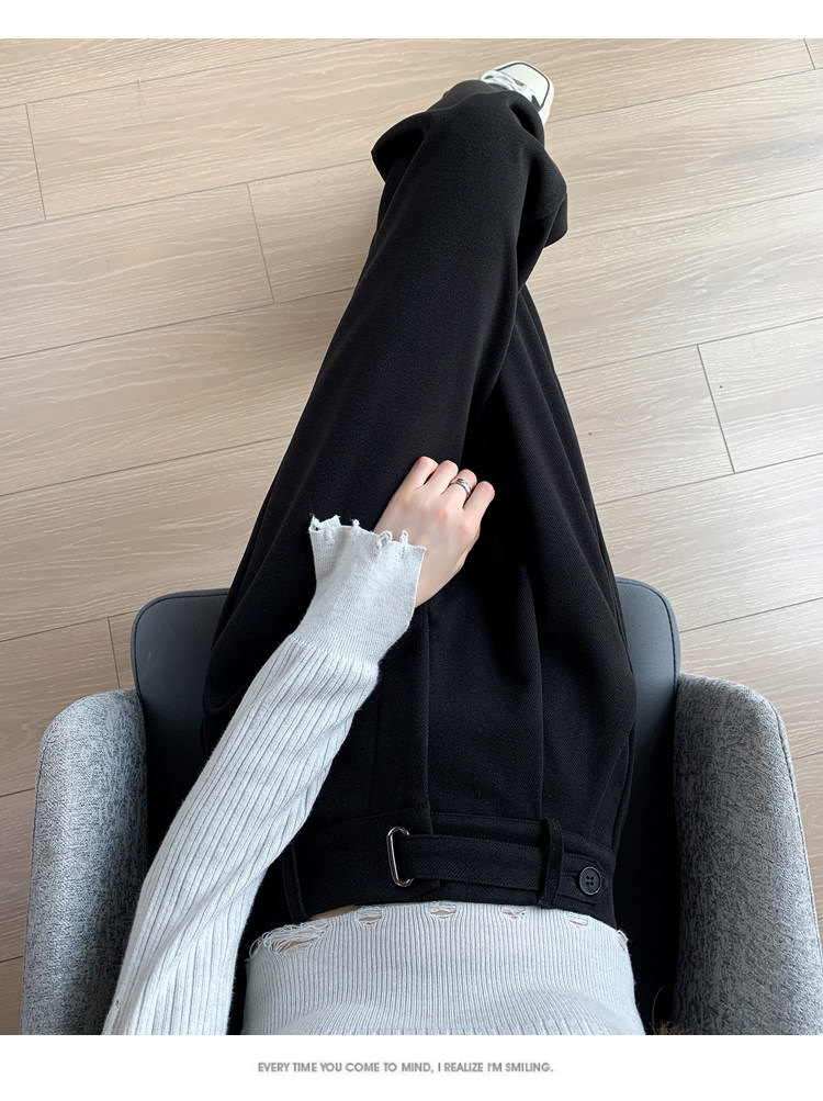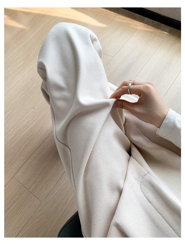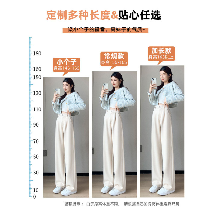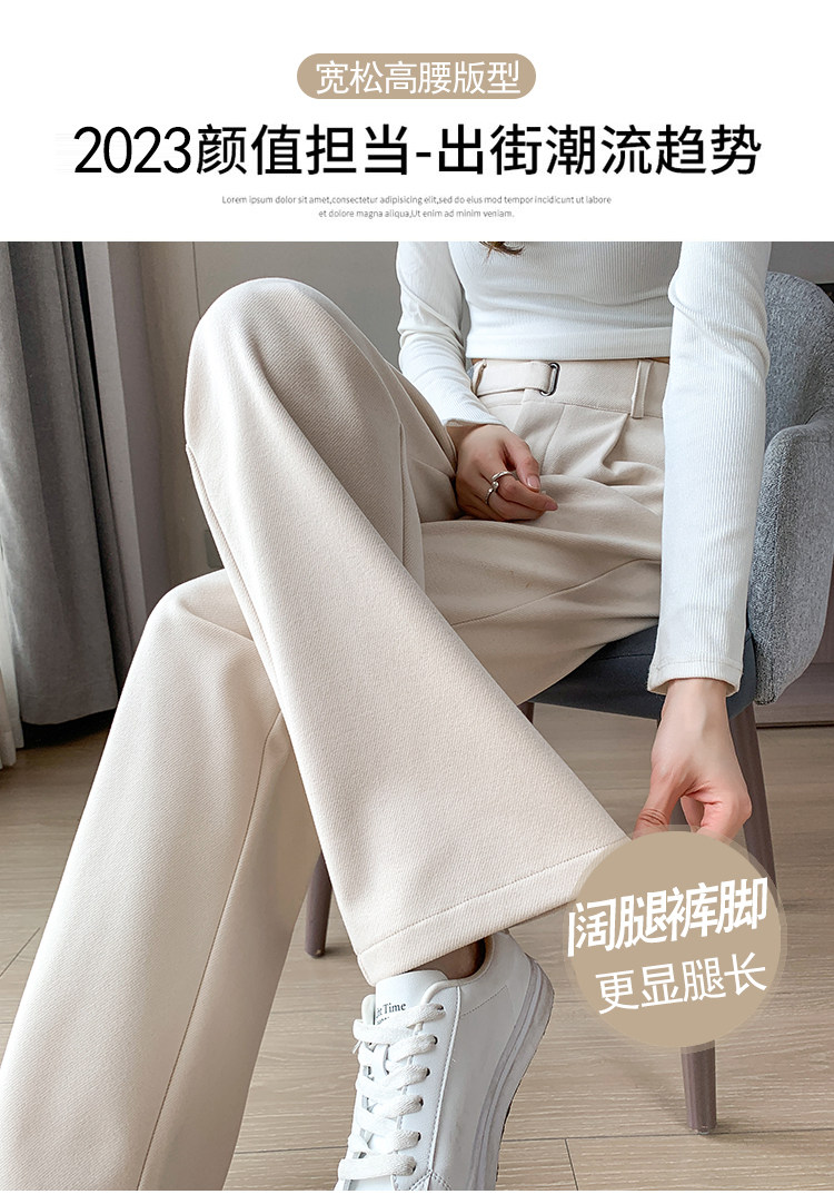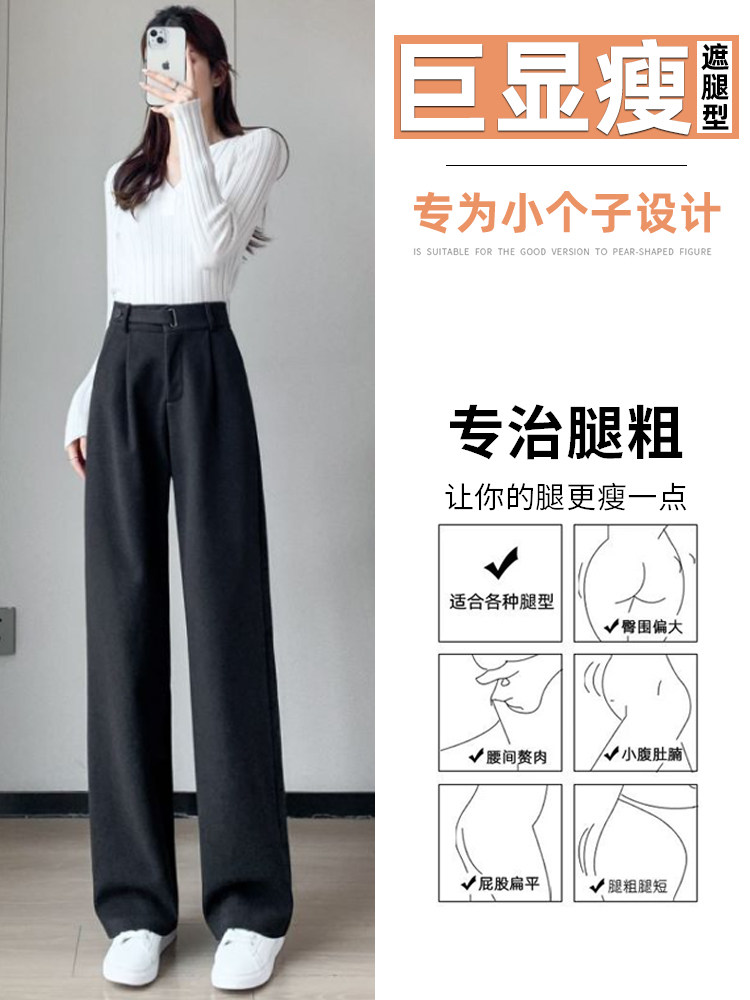 小個子杏色毛呢濶腿褲女秋冬季加厚高腰窄版直筒褲150cm顯高褲子