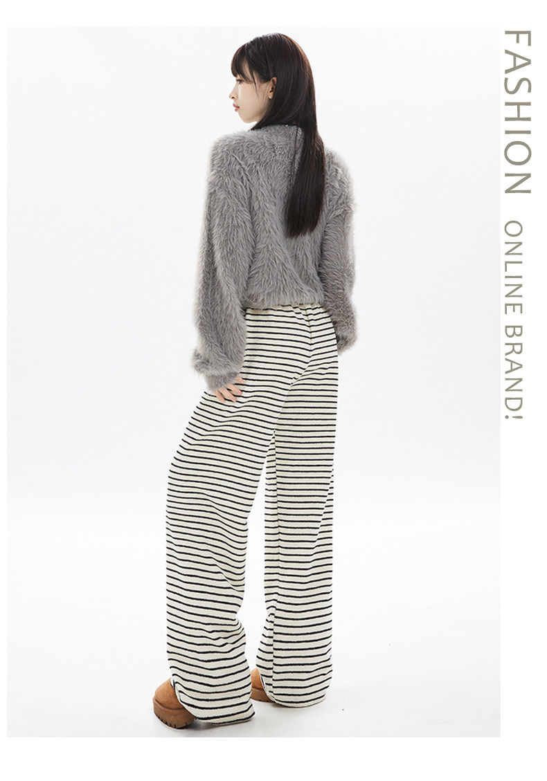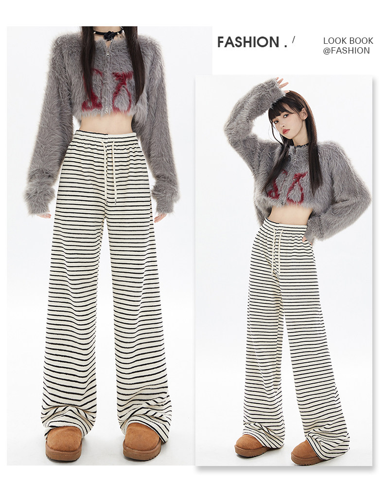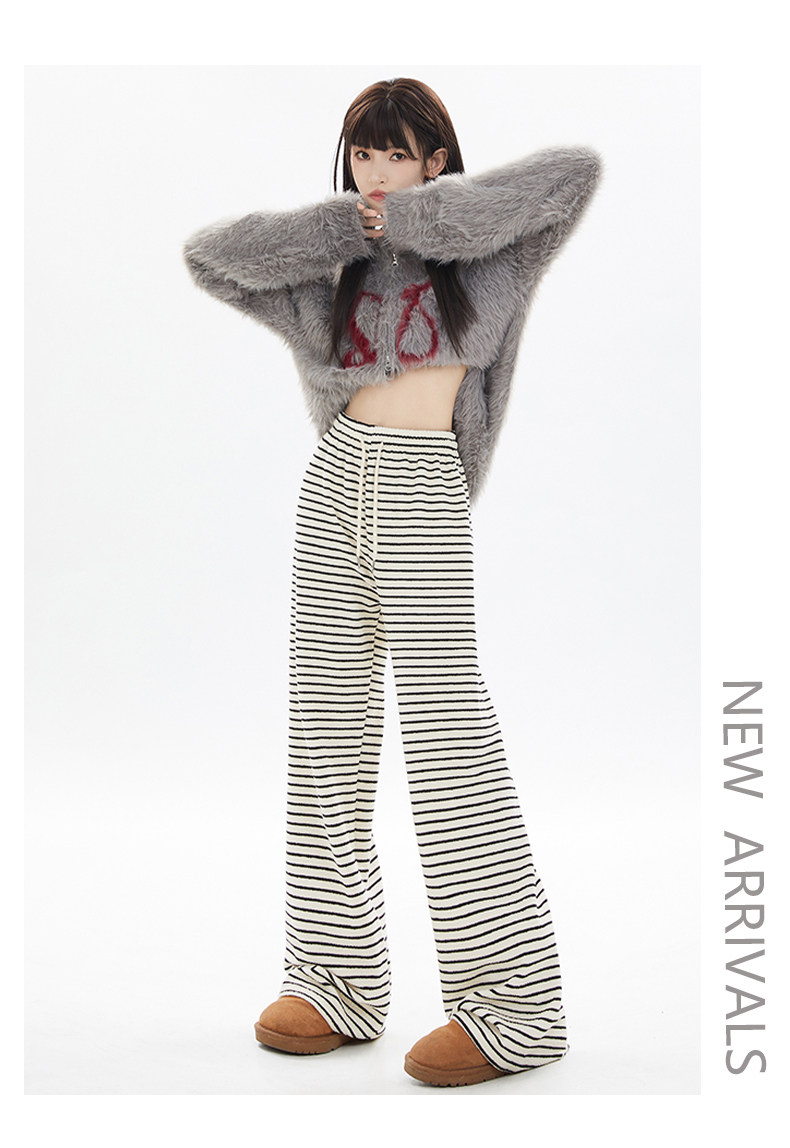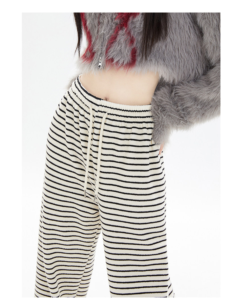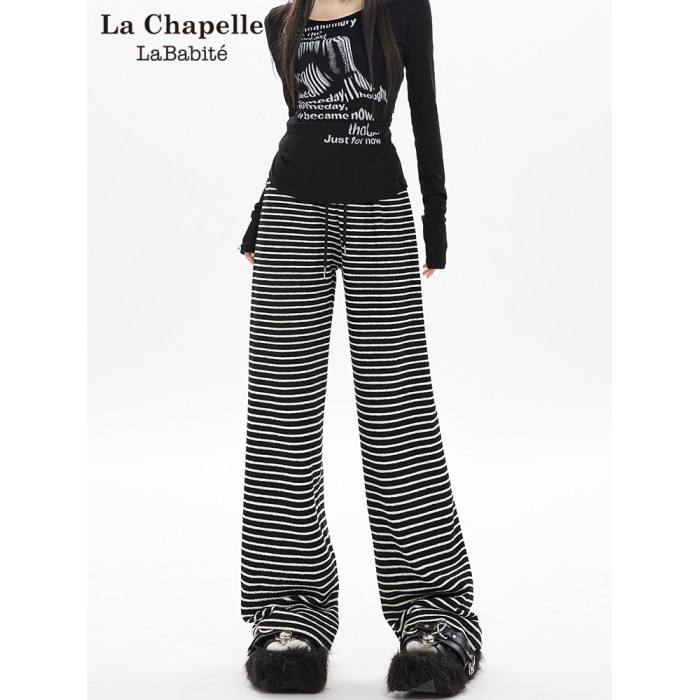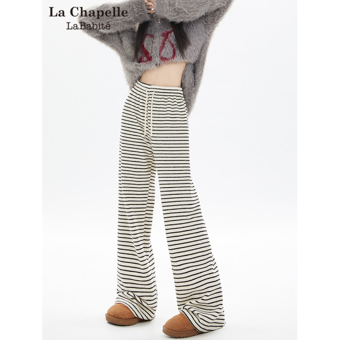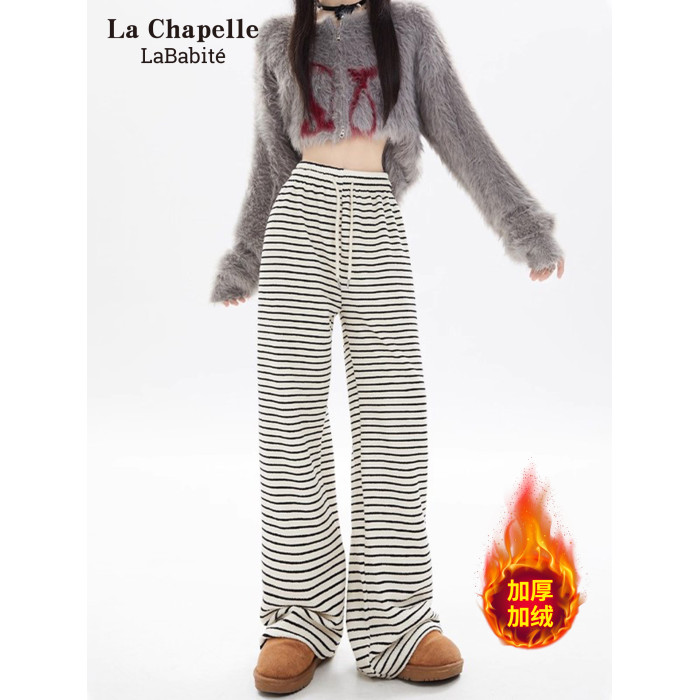 拉夏貝爾Lababite白色加絨條紋濶腿褲冬季女2025新款休閒毛巾褲子