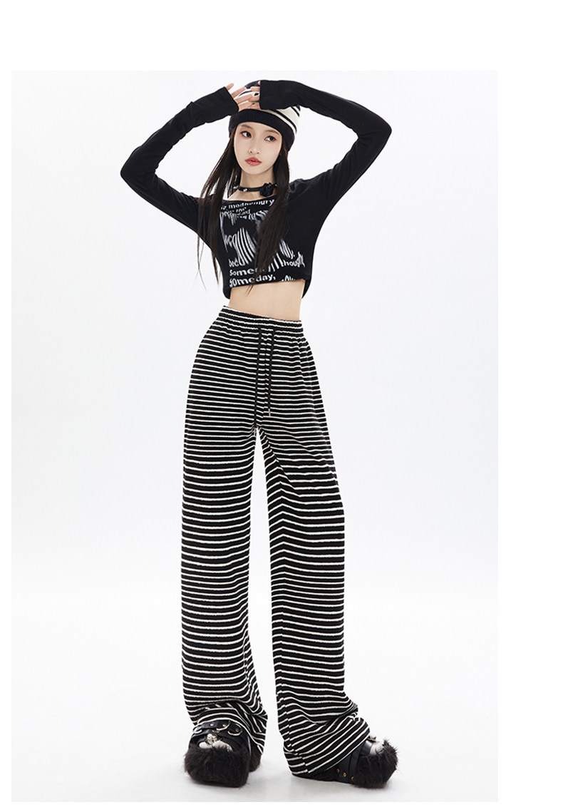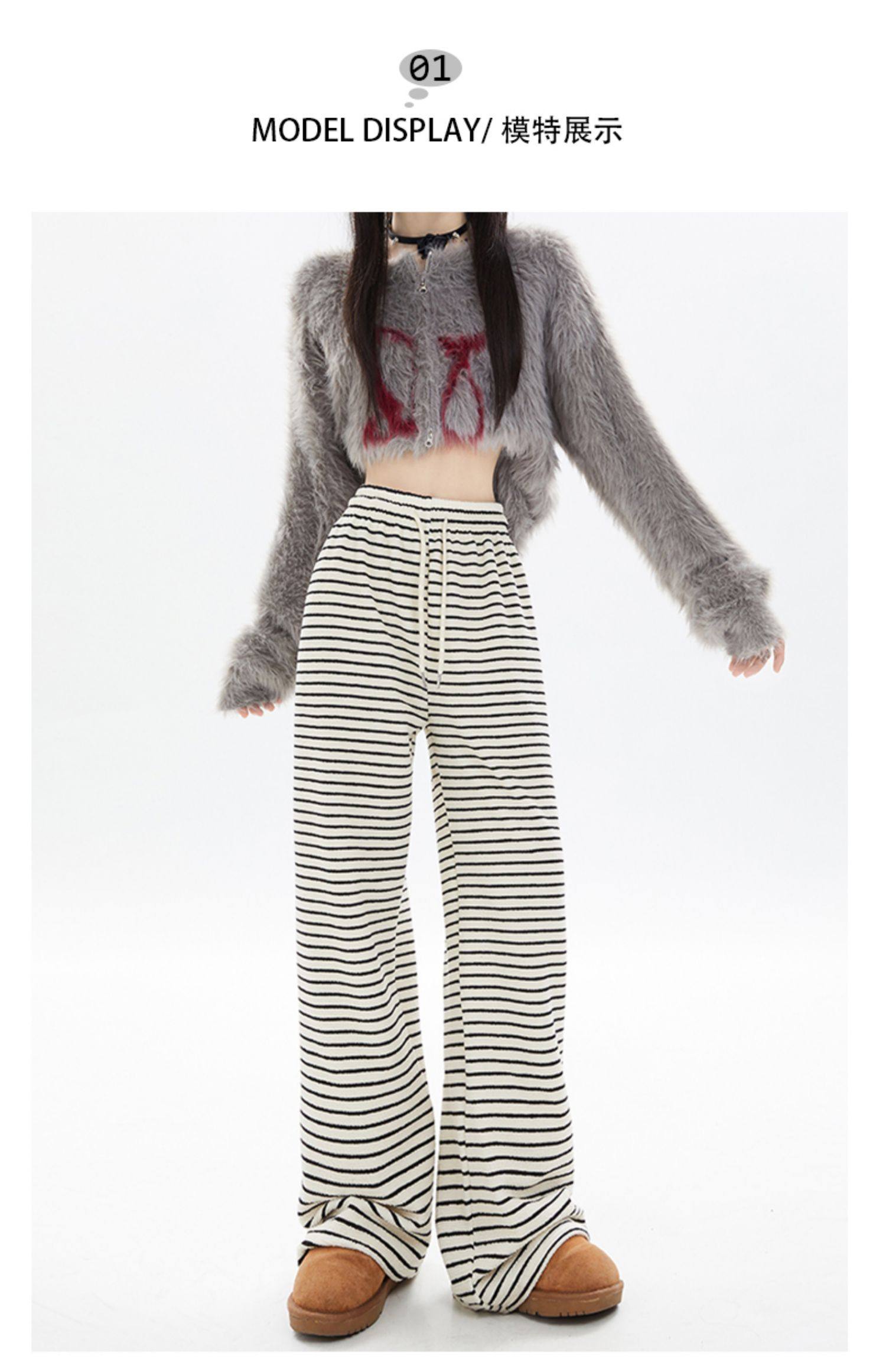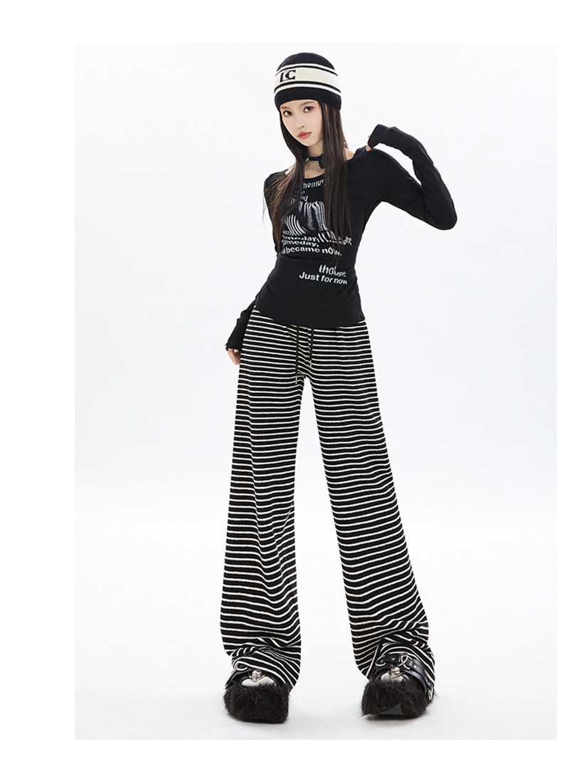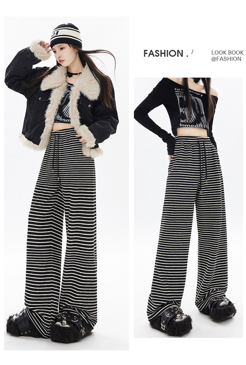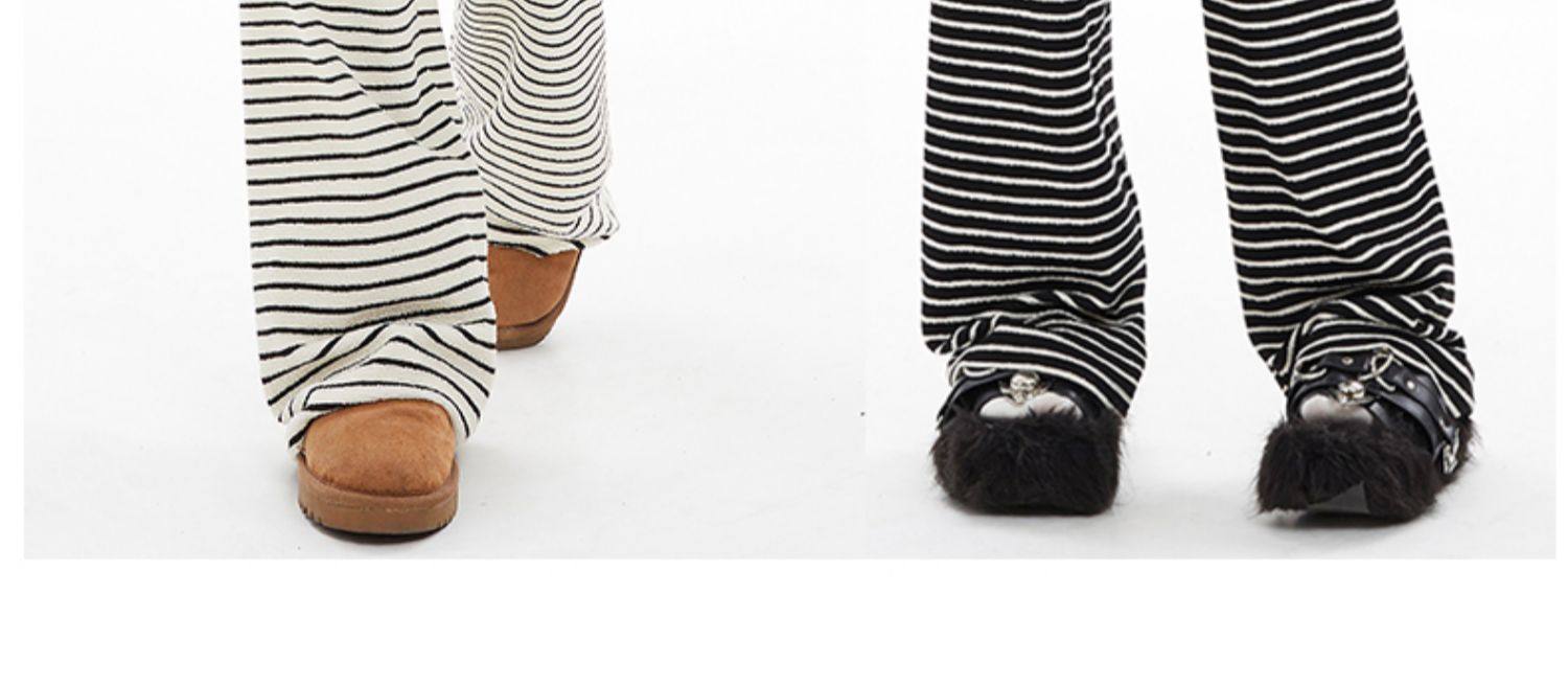 拉夏貝爾Lababite白色加絨條紋濶腿褲冬季女2025新款休閒毛巾褲子