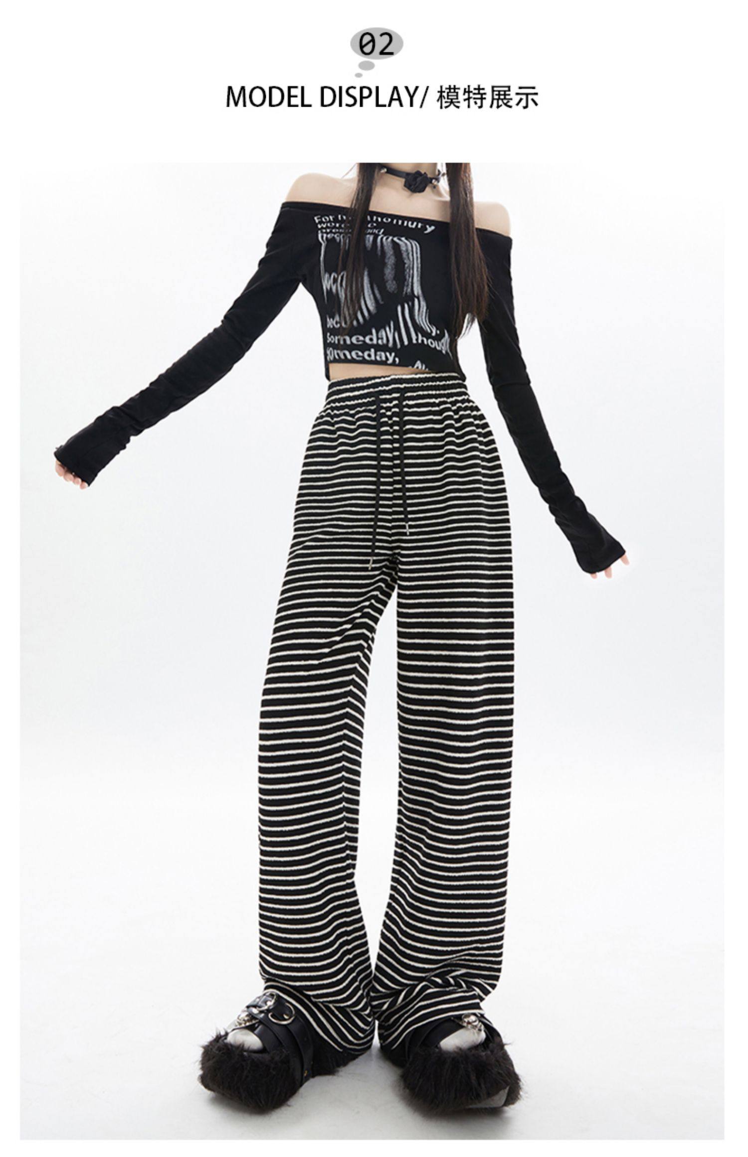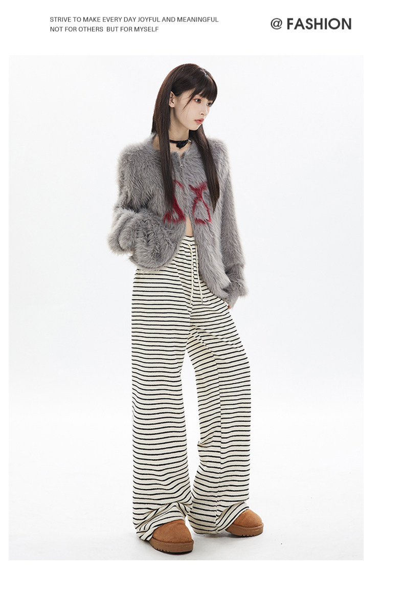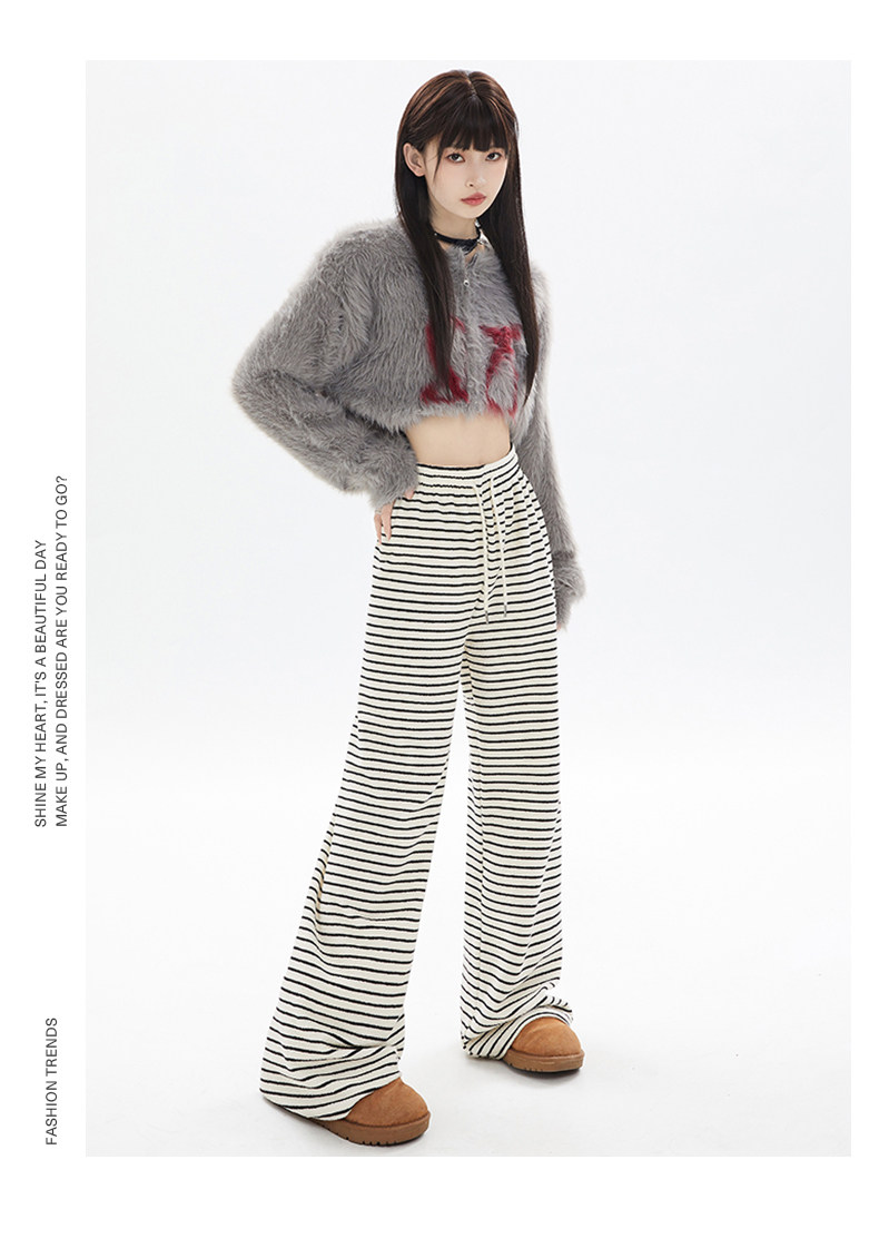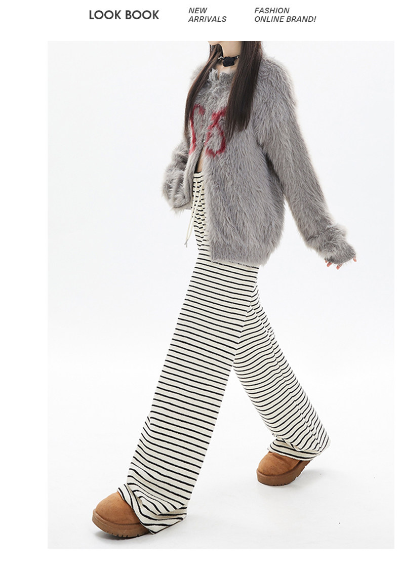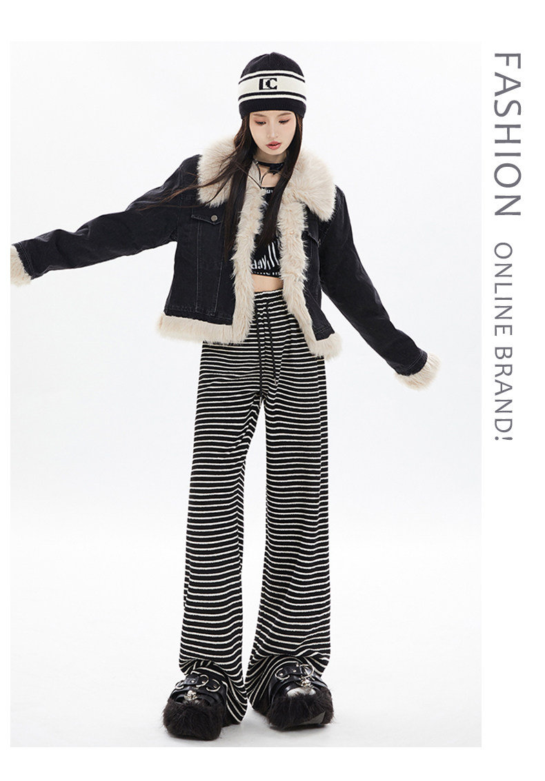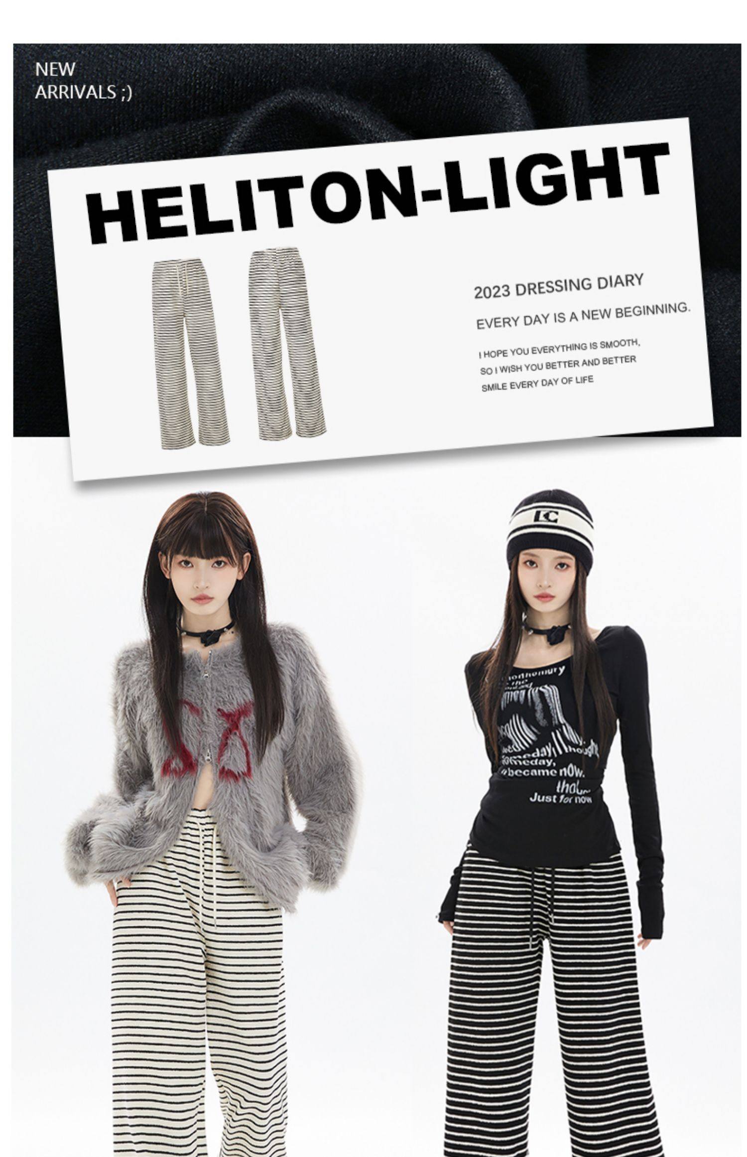 拉夏貝爾Lababite白色加絨條紋濶腿褲冬季女2025新款休閒毛巾褲子