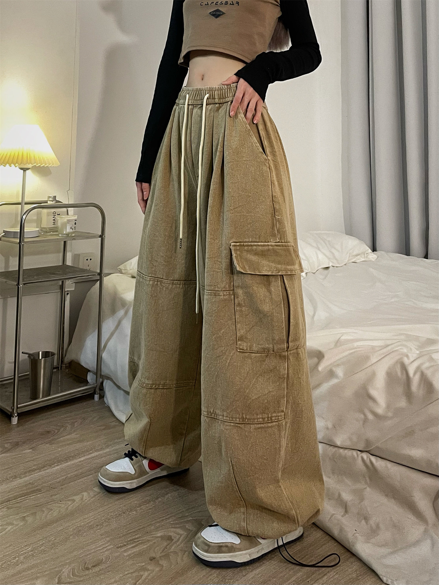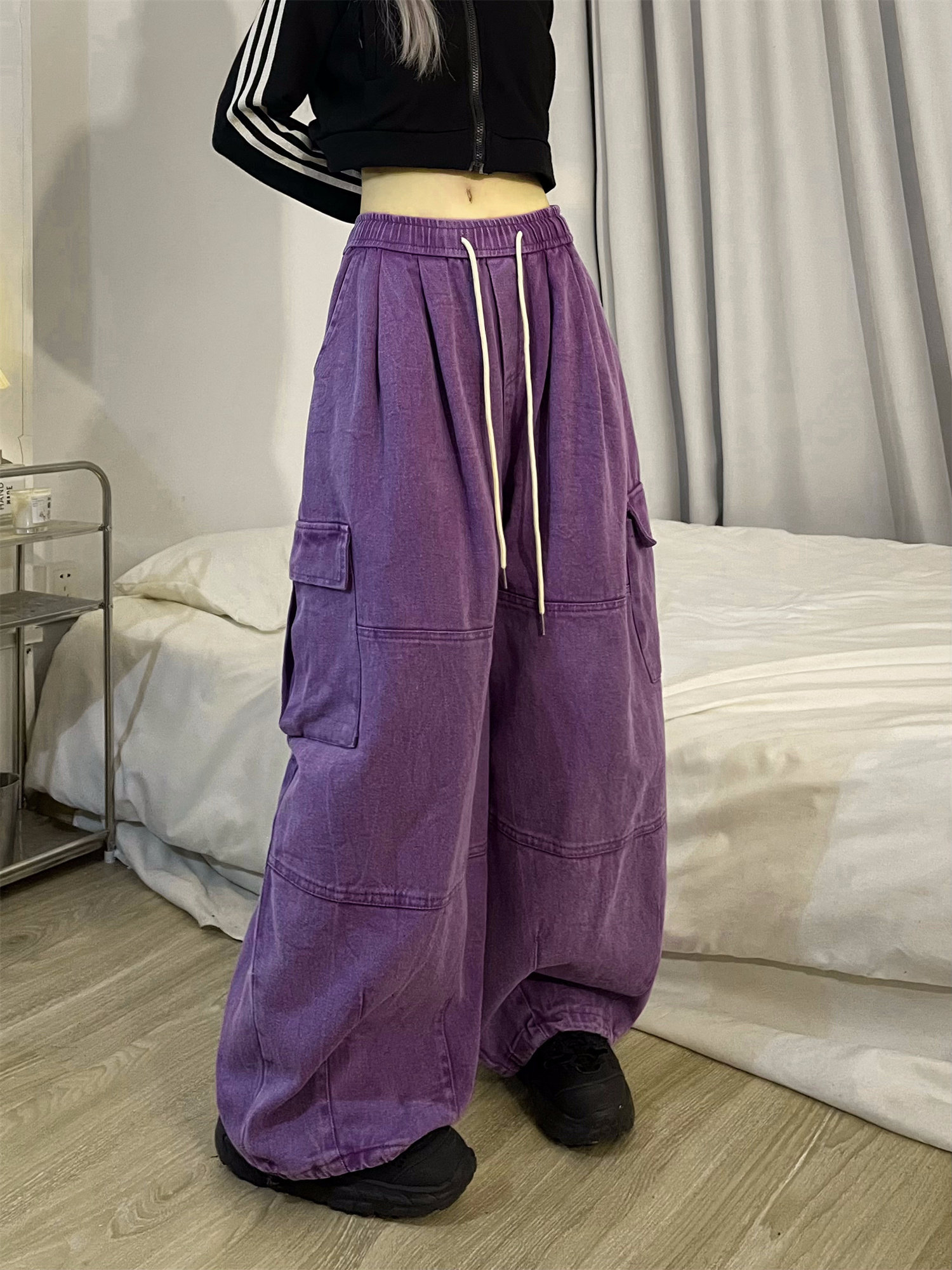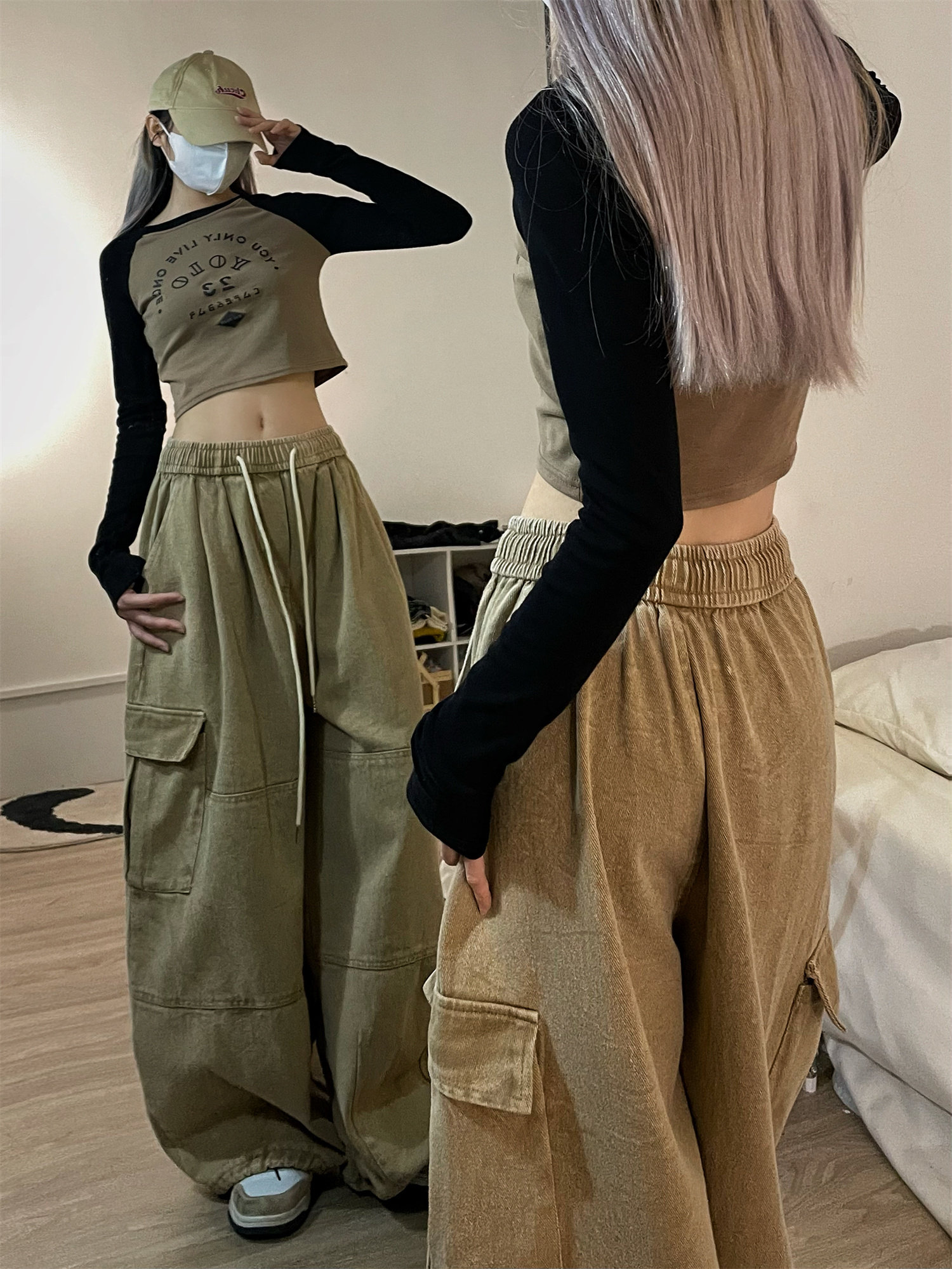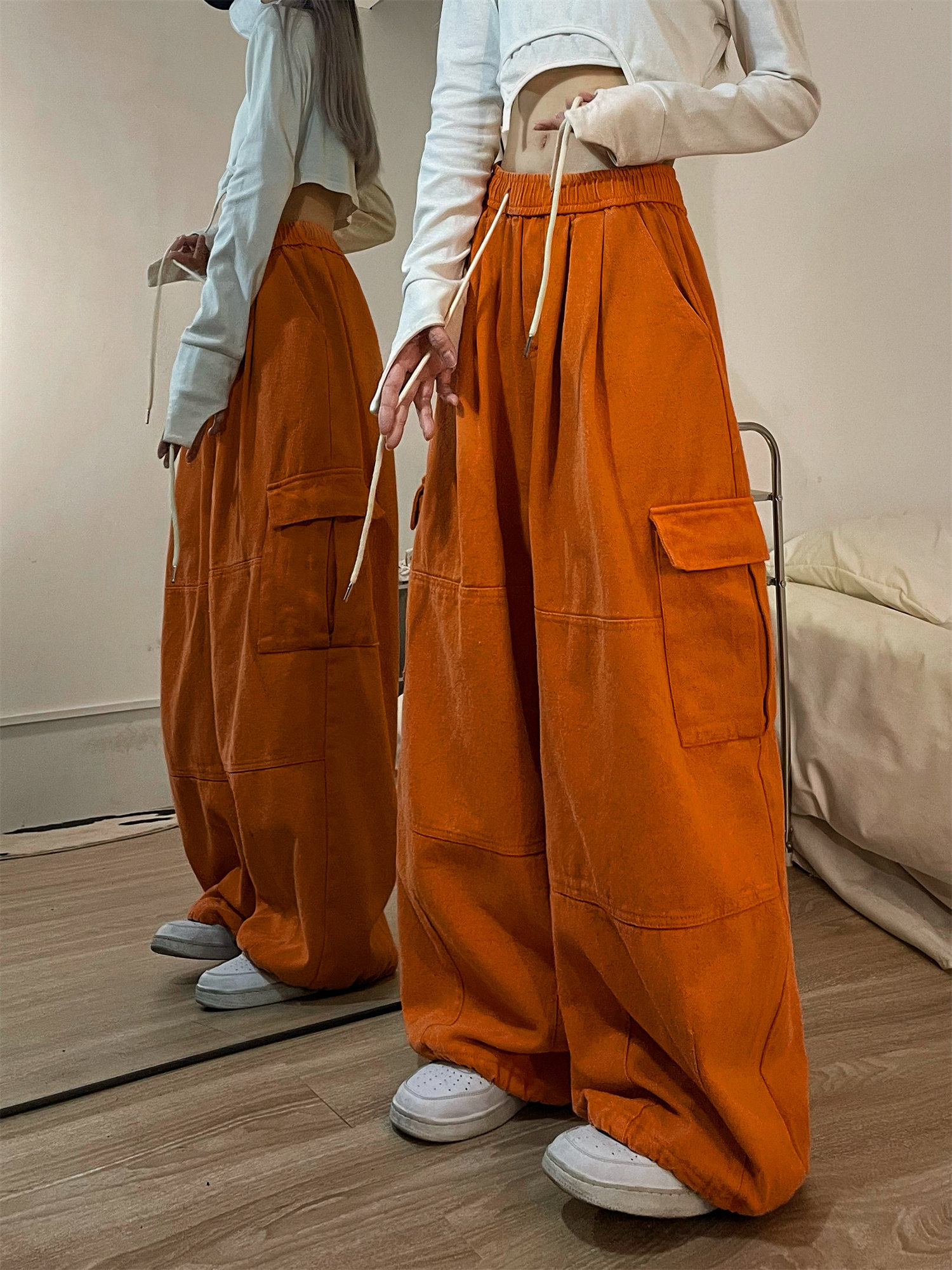 酷拽少女 國潮復古工裝褲女春季純棉加厚休閒寬鬆拖地濶腿褲ins潮