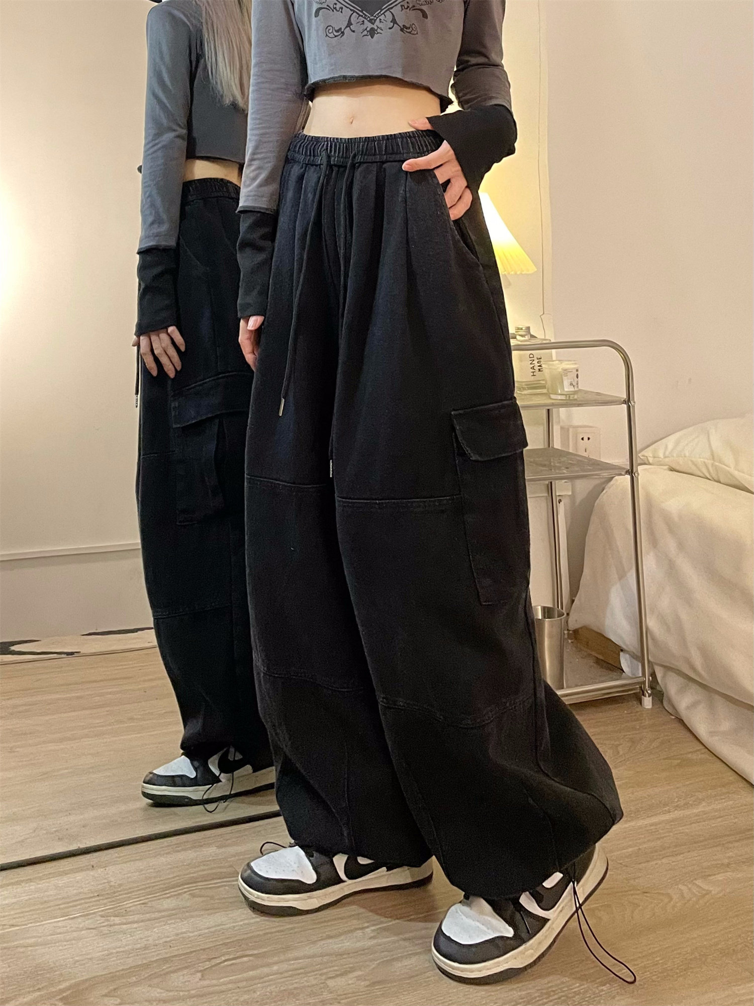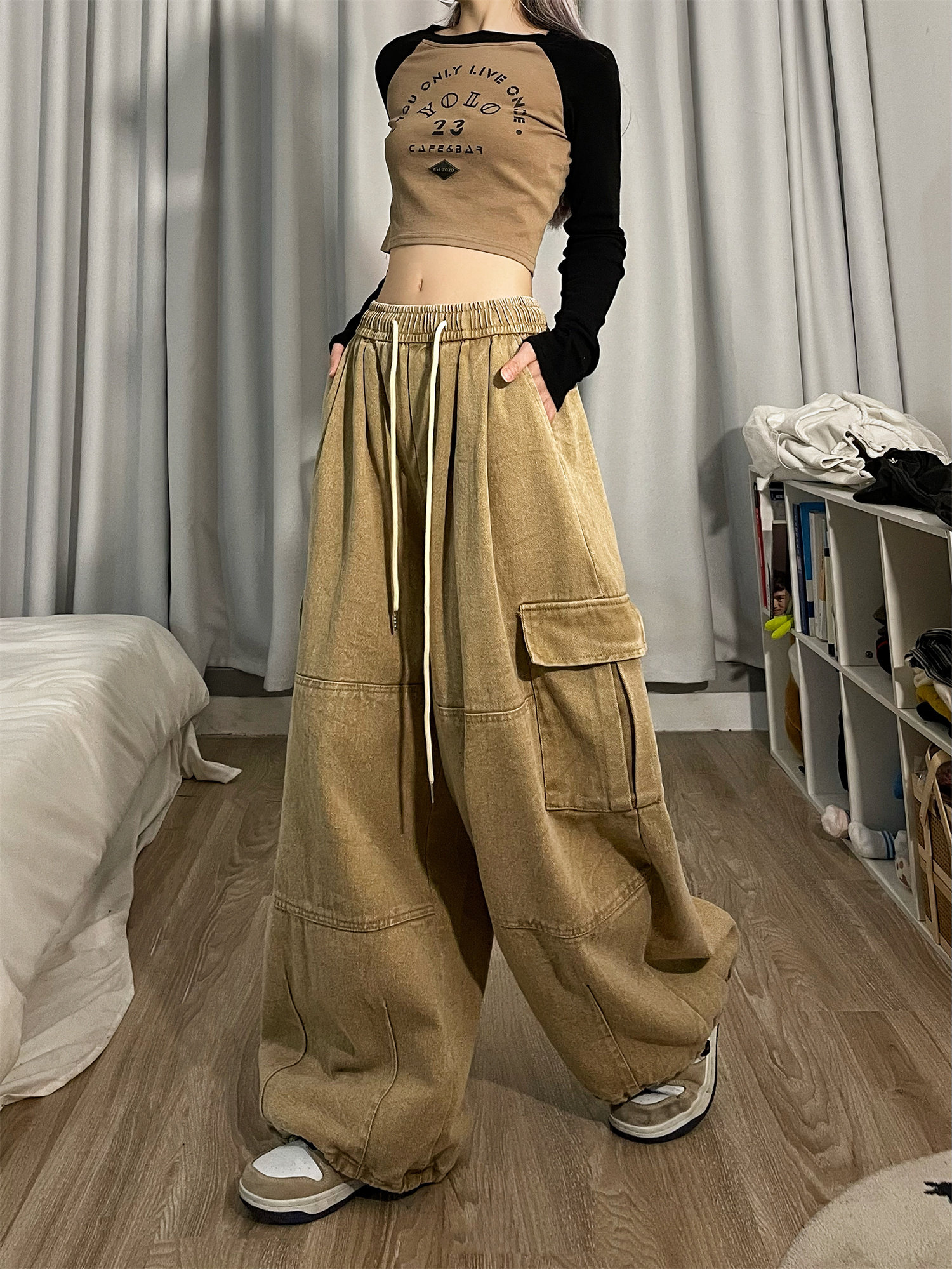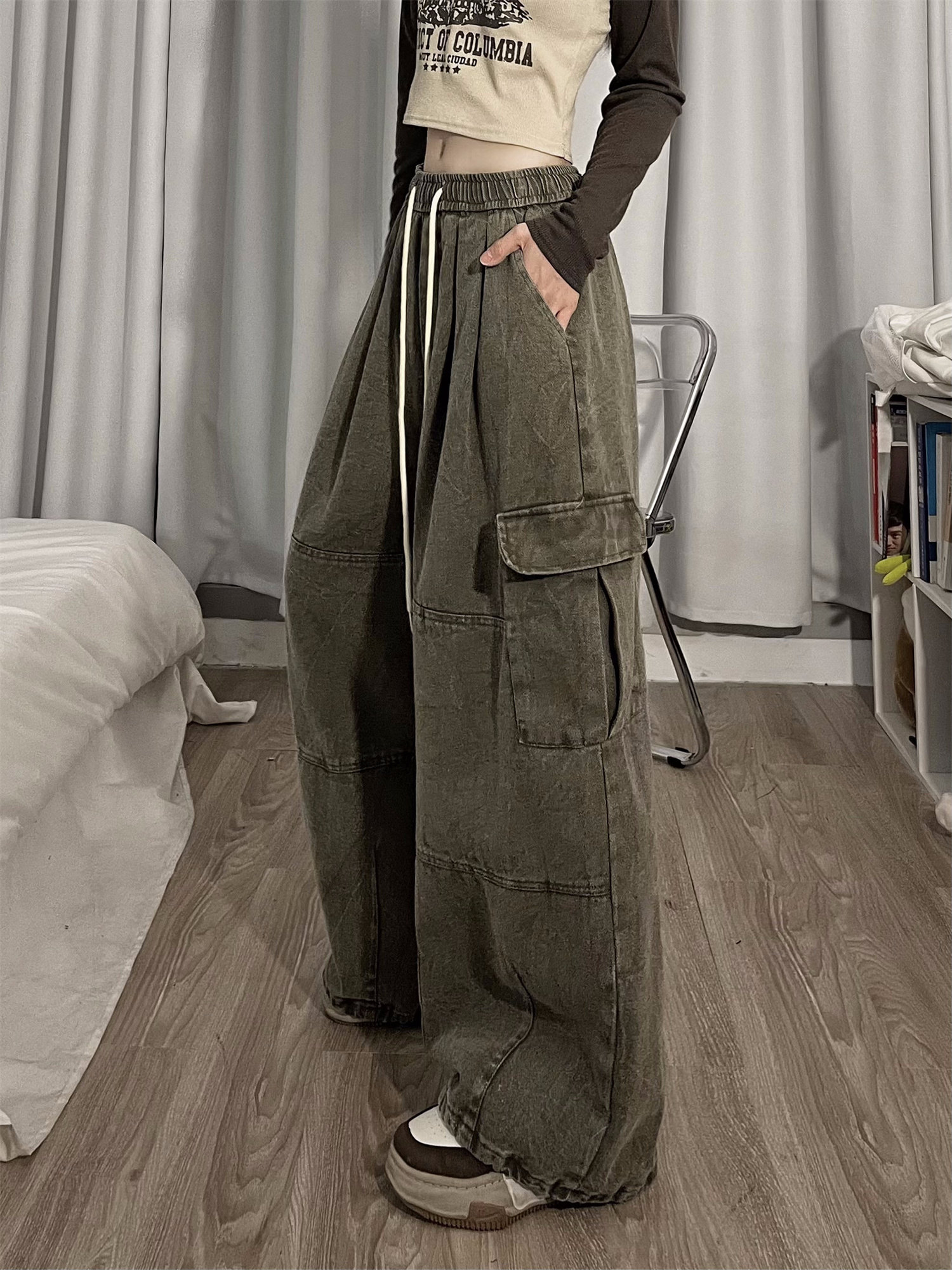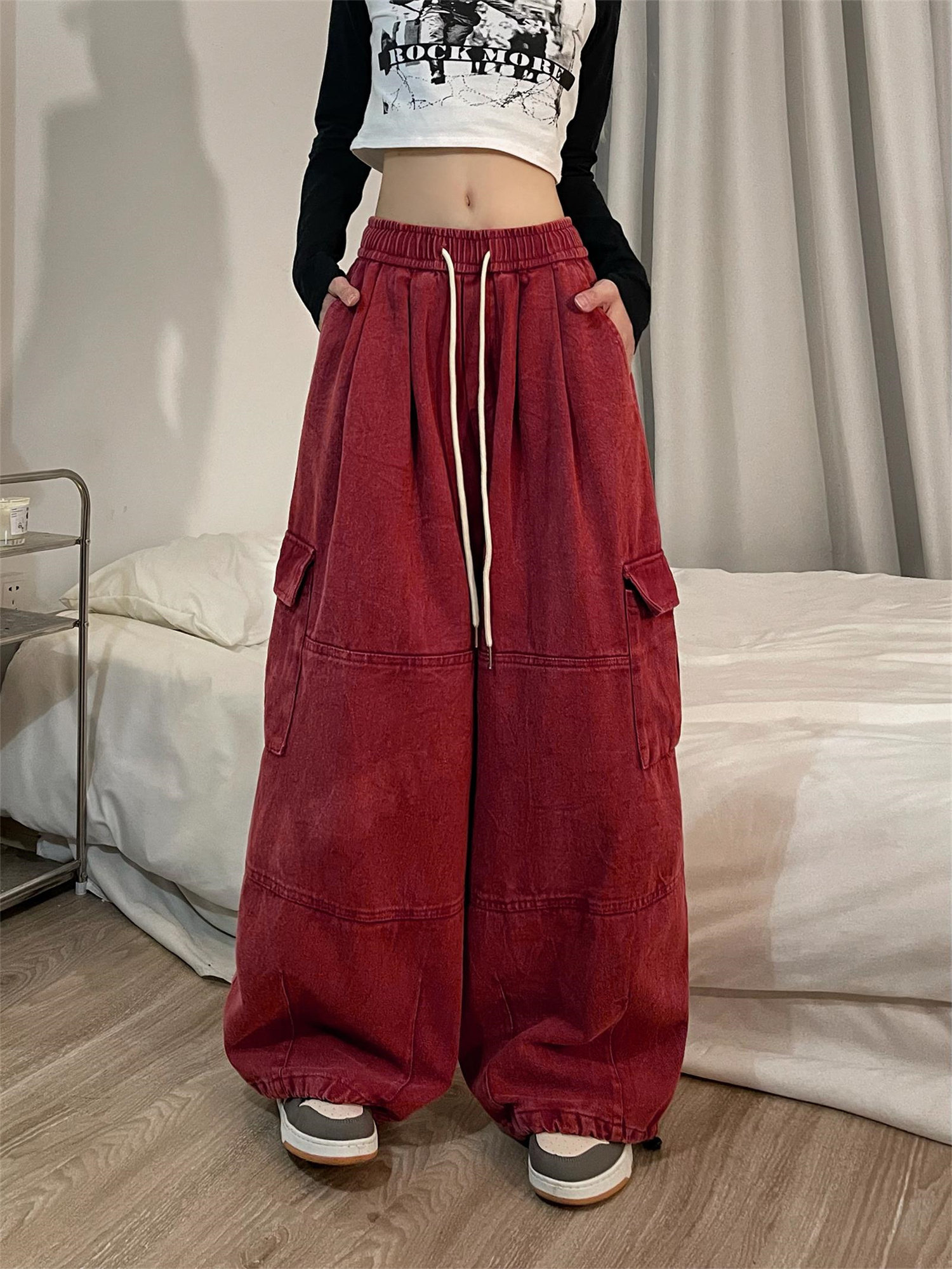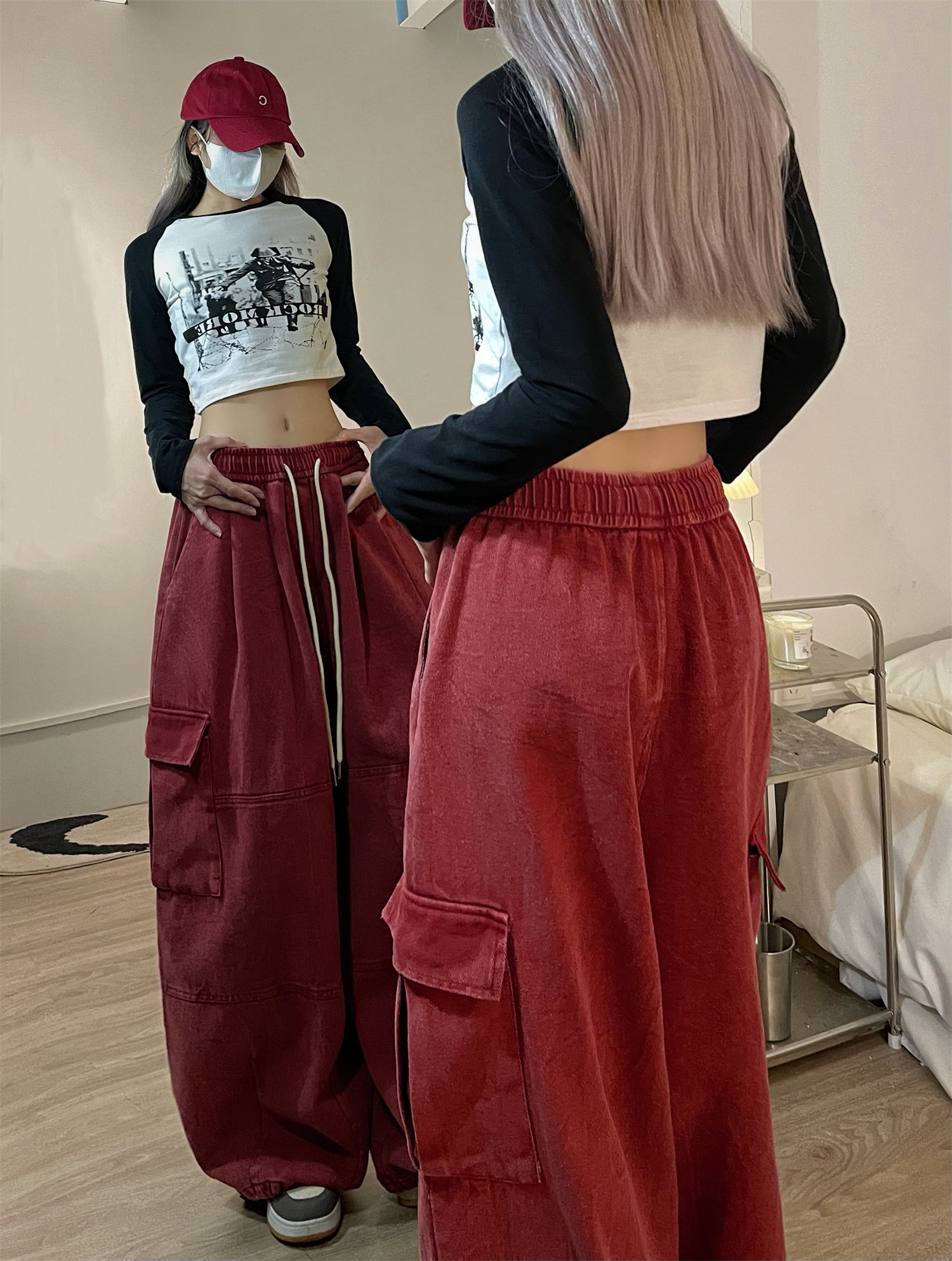 酷拽少女 國潮復古工裝褲女春季純棉加厚休閒寬鬆拖地濶腿褲ins潮