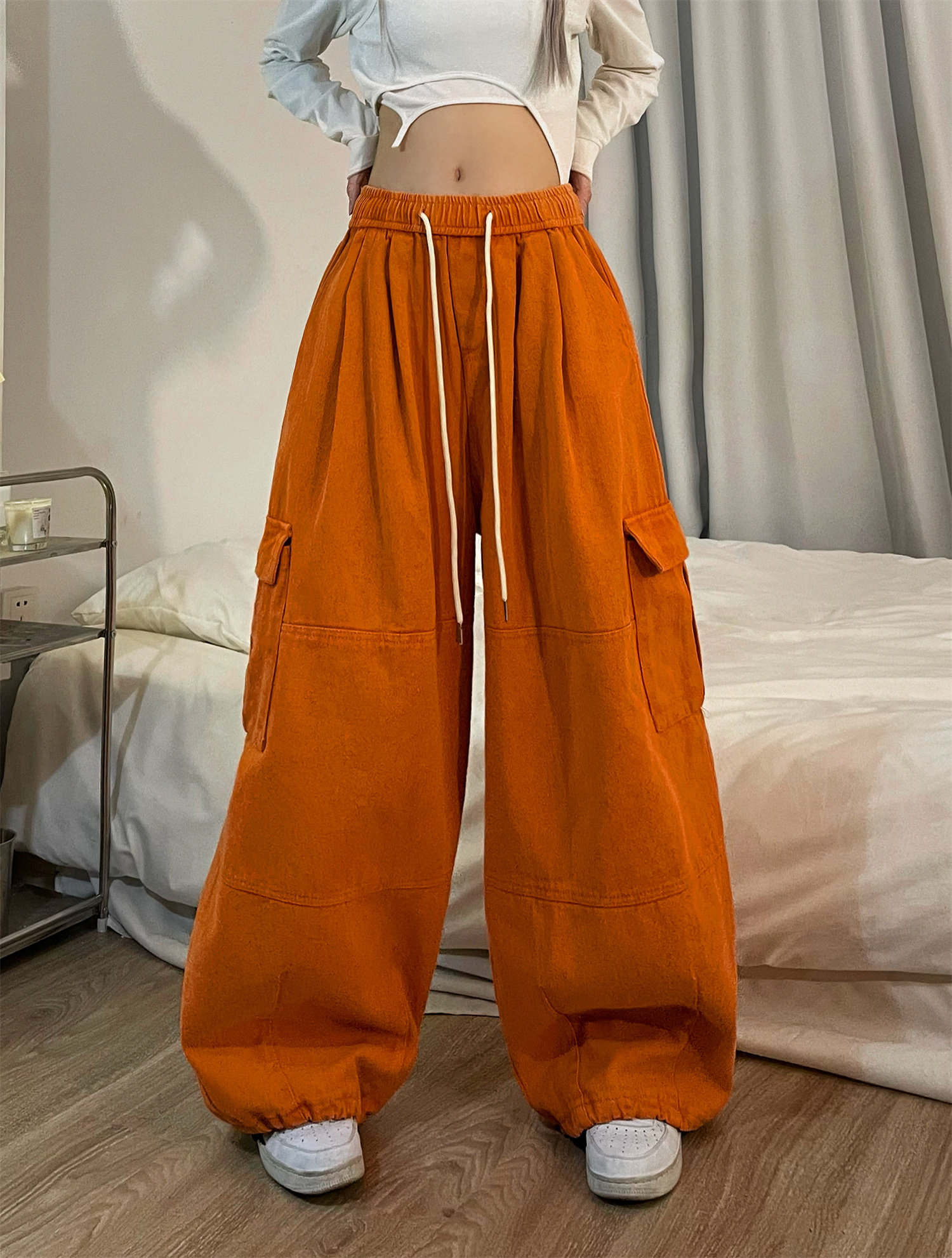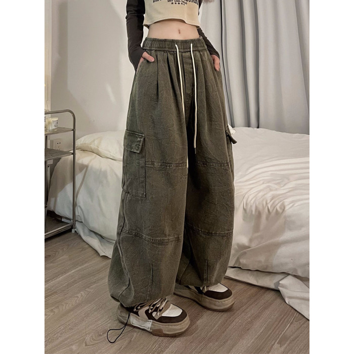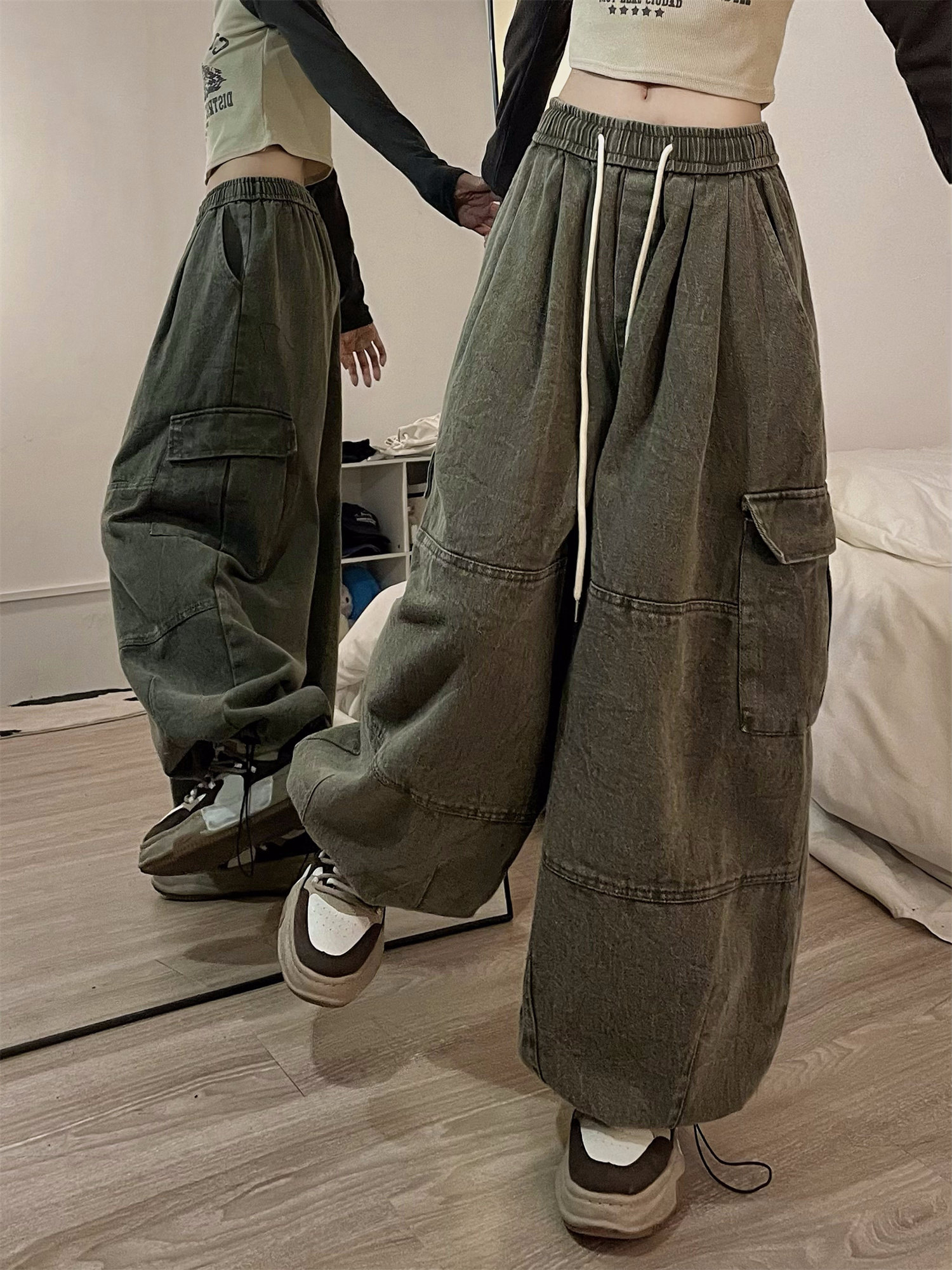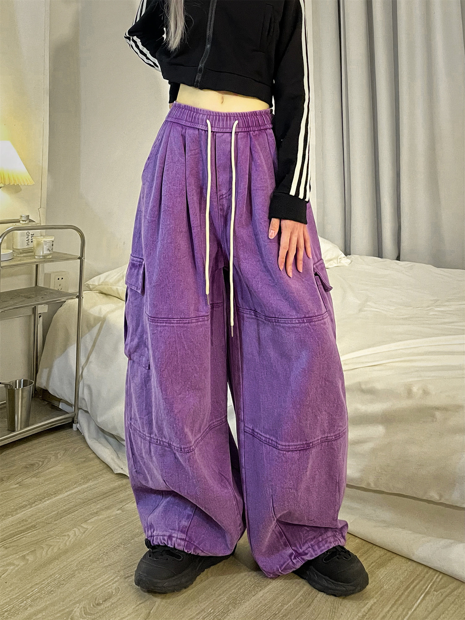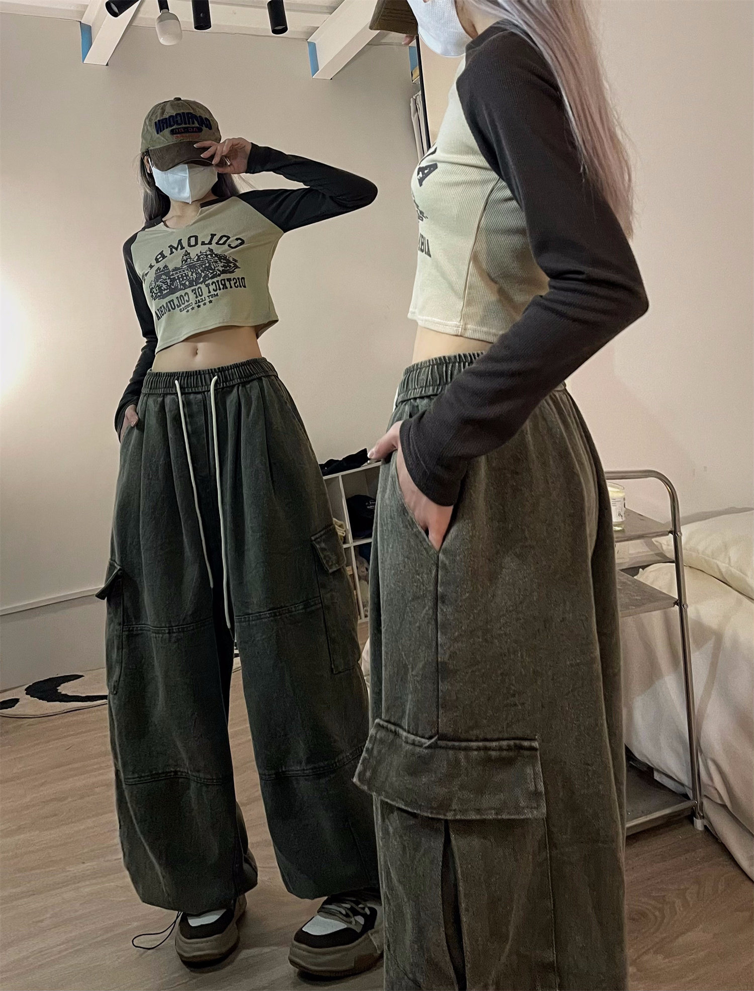 酷拽少女 國潮復古工裝褲女春季純棉加厚休閒寬鬆拖地濶腿褲ins潮