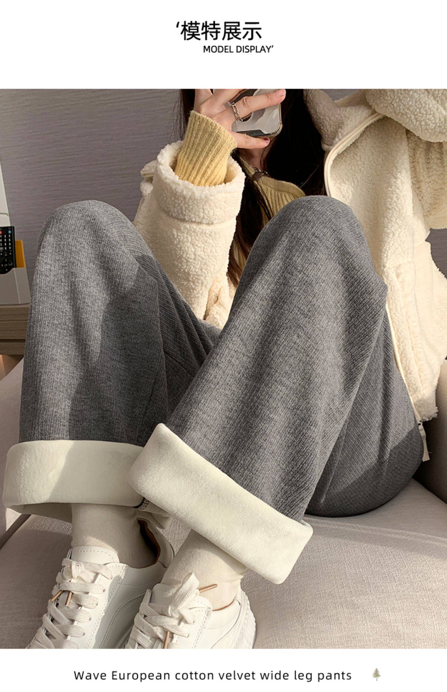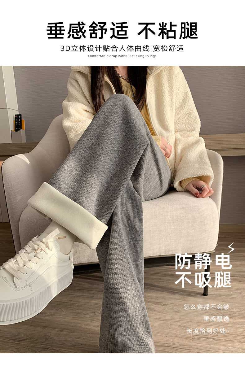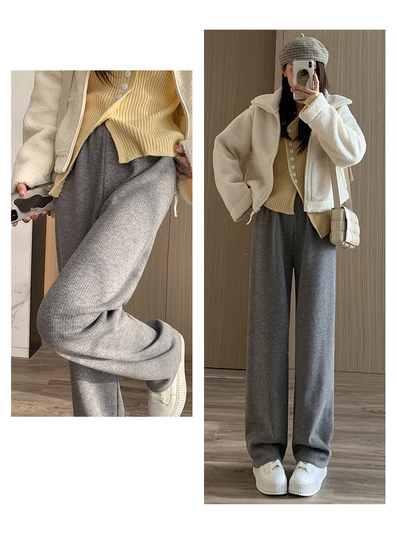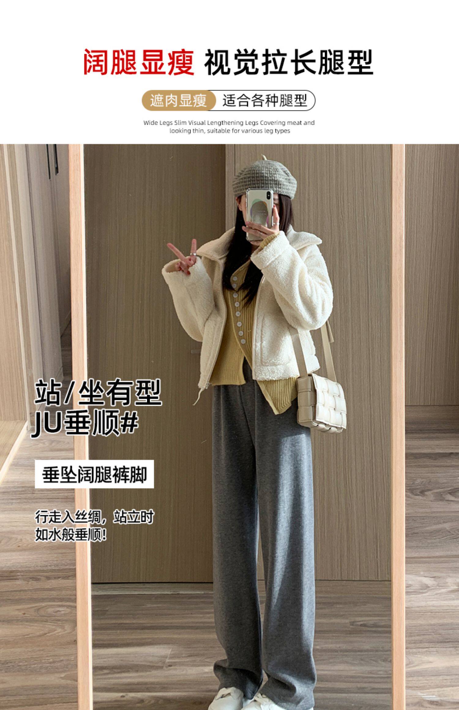 灰色仿羊毛絨加絨濶腿褲女秋季高腰垂感直筒窄版休閒褲糯米針織褲