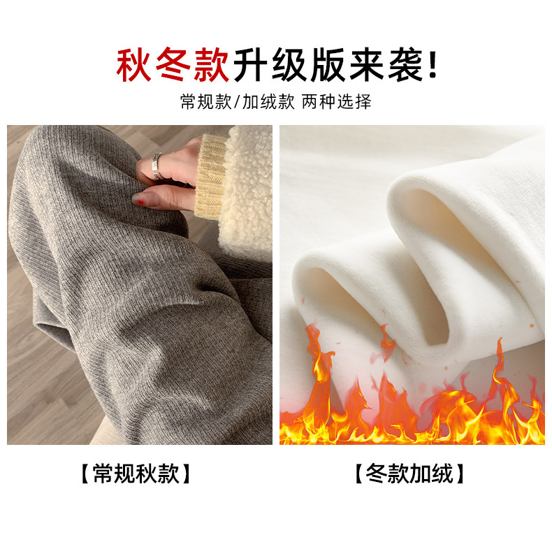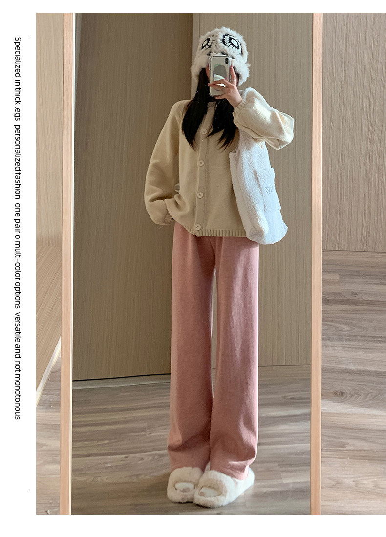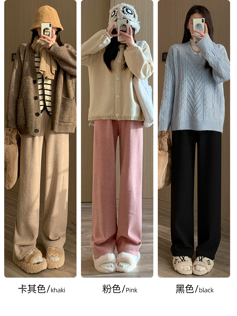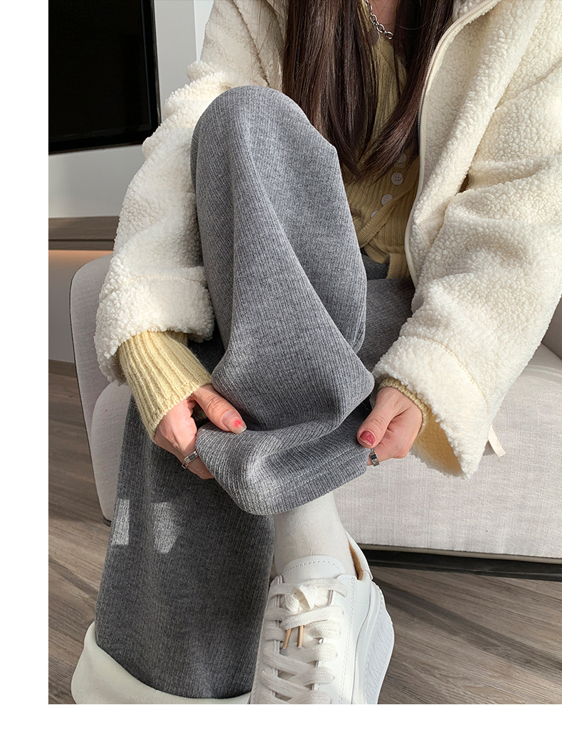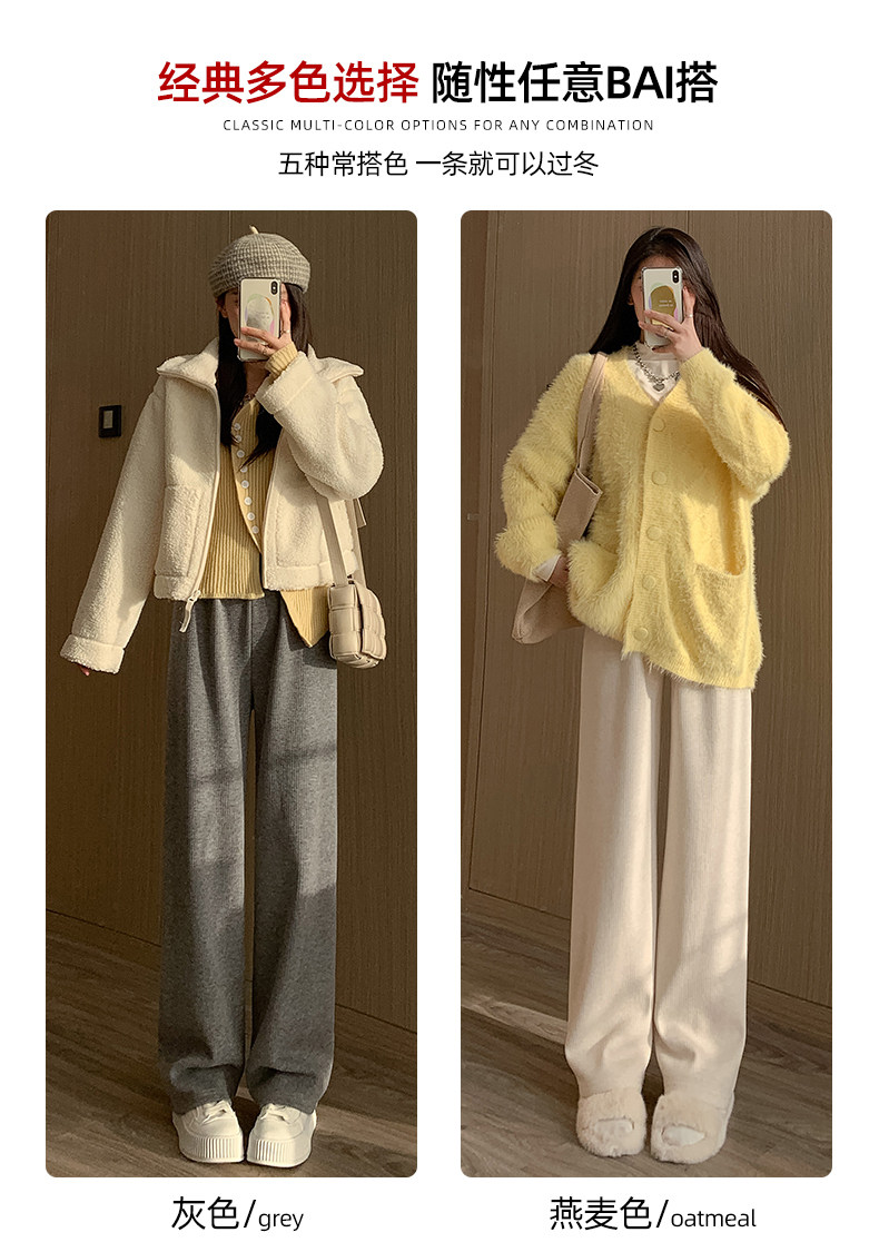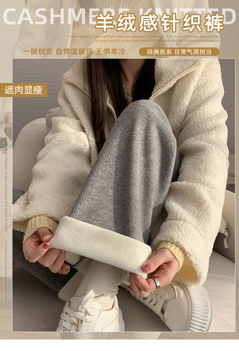 灰色仿羊毛絨加絨濶腿褲女秋季高腰垂感直筒窄版休閒褲糯米針織褲
