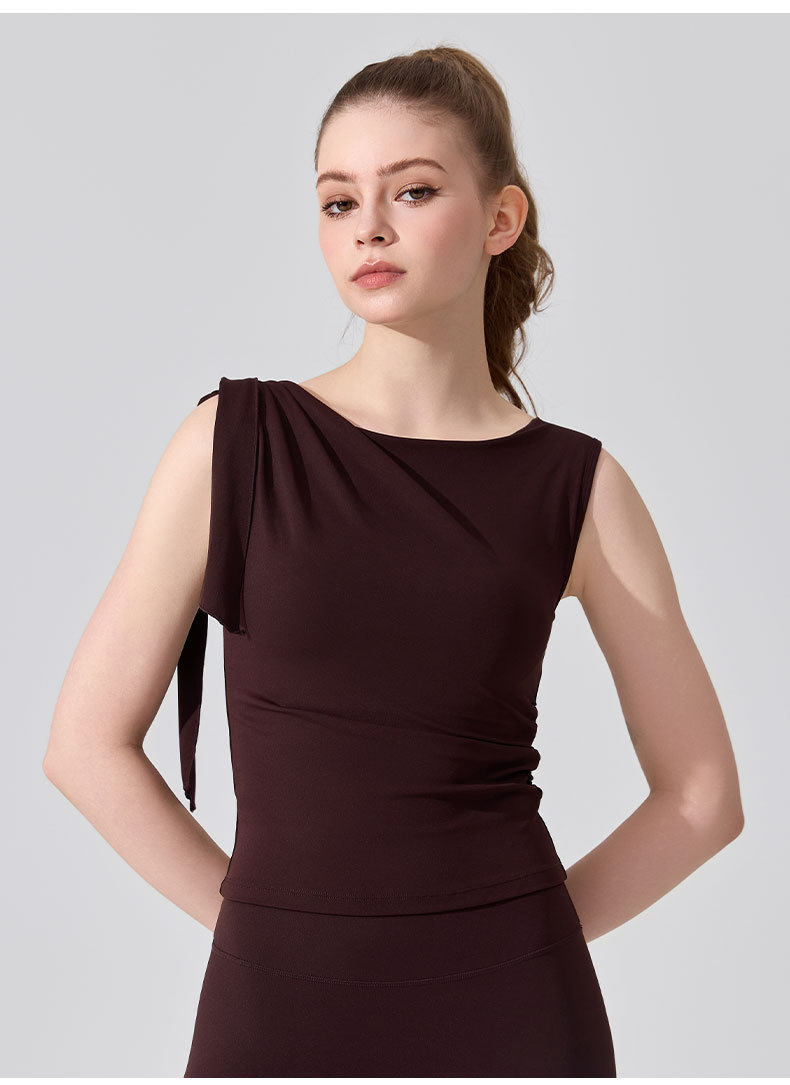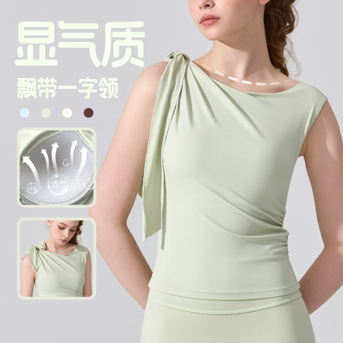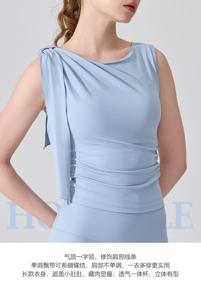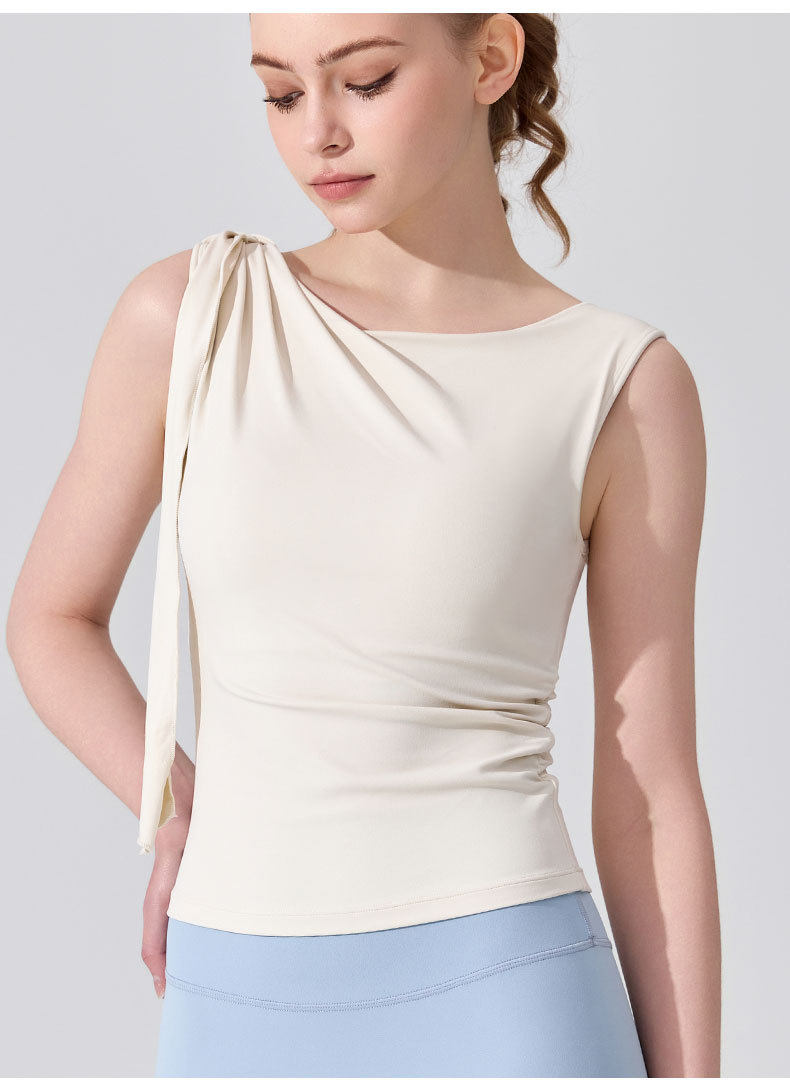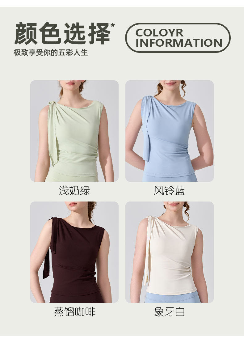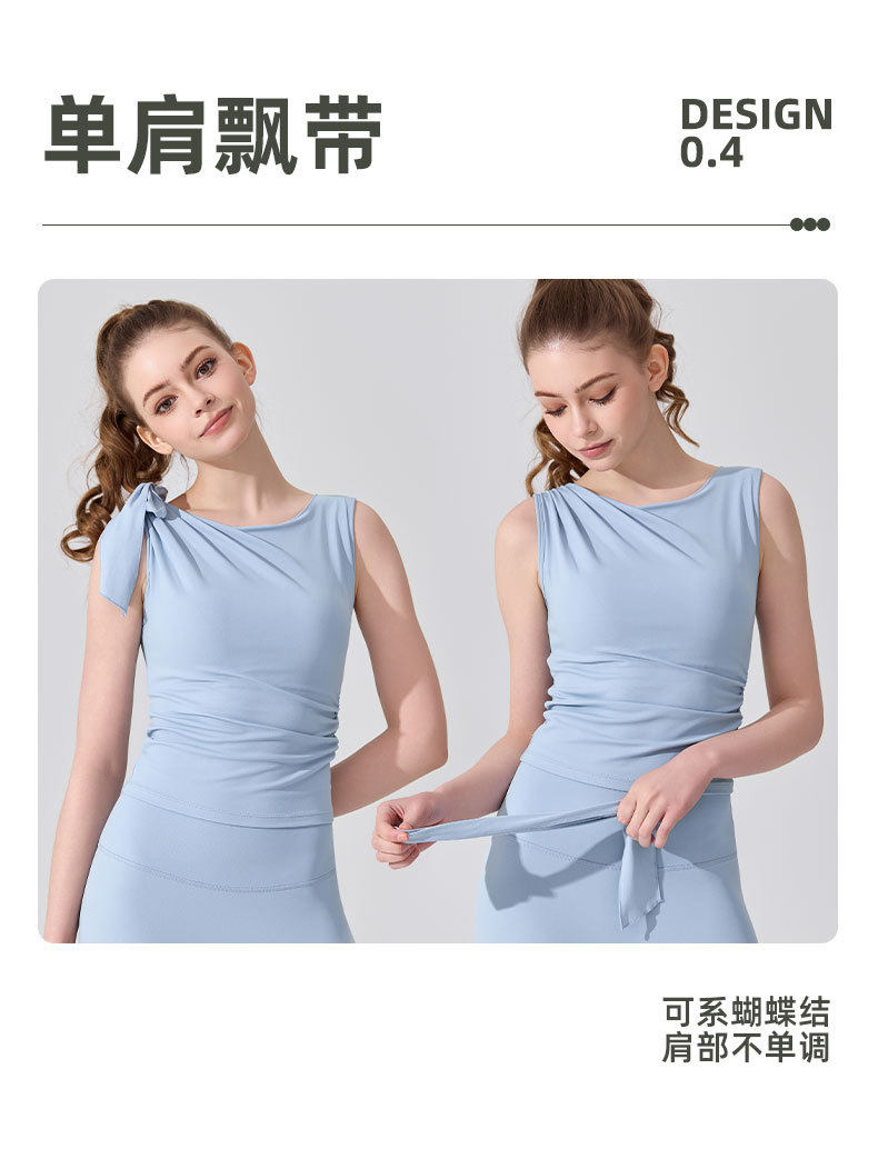 2025辣妹不規則斜肩綁帶T恤女夏帶胸墊肩部扭結無袖打底瑜珈背心