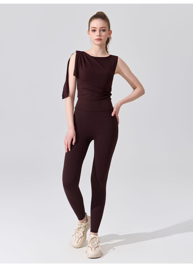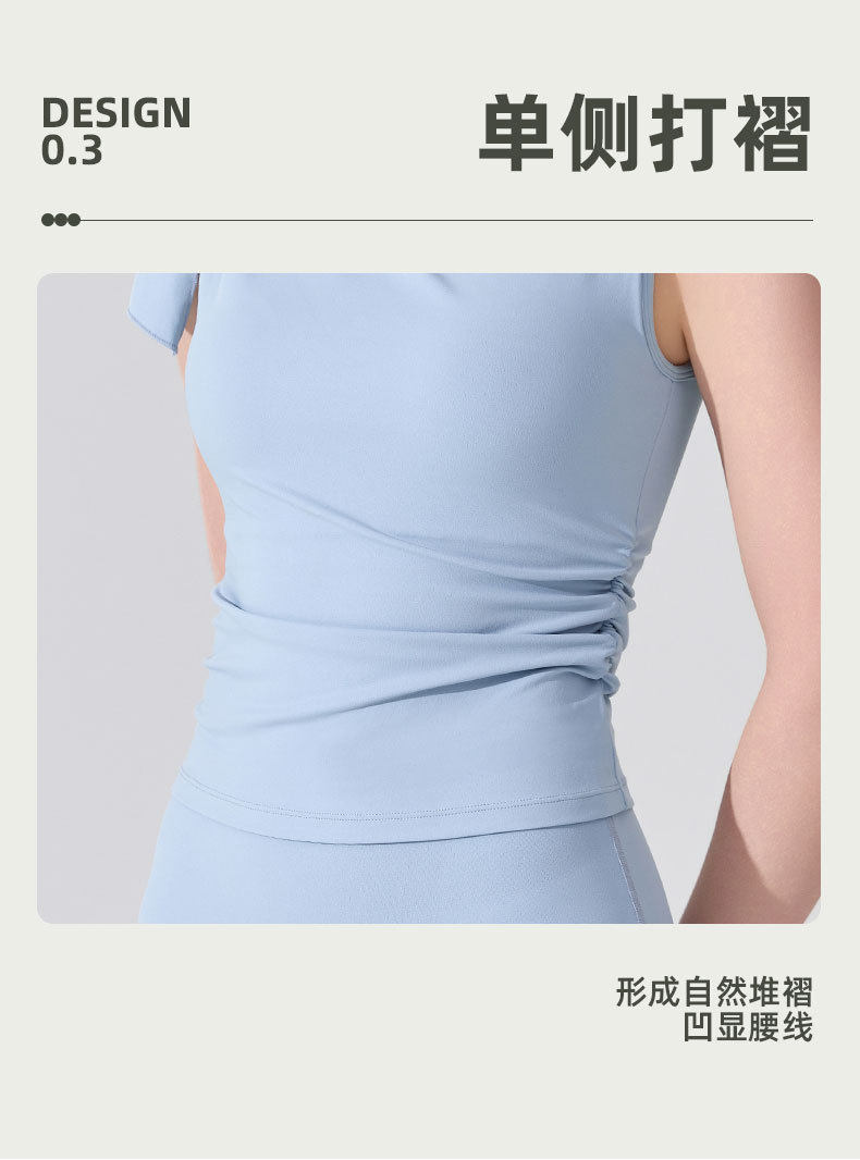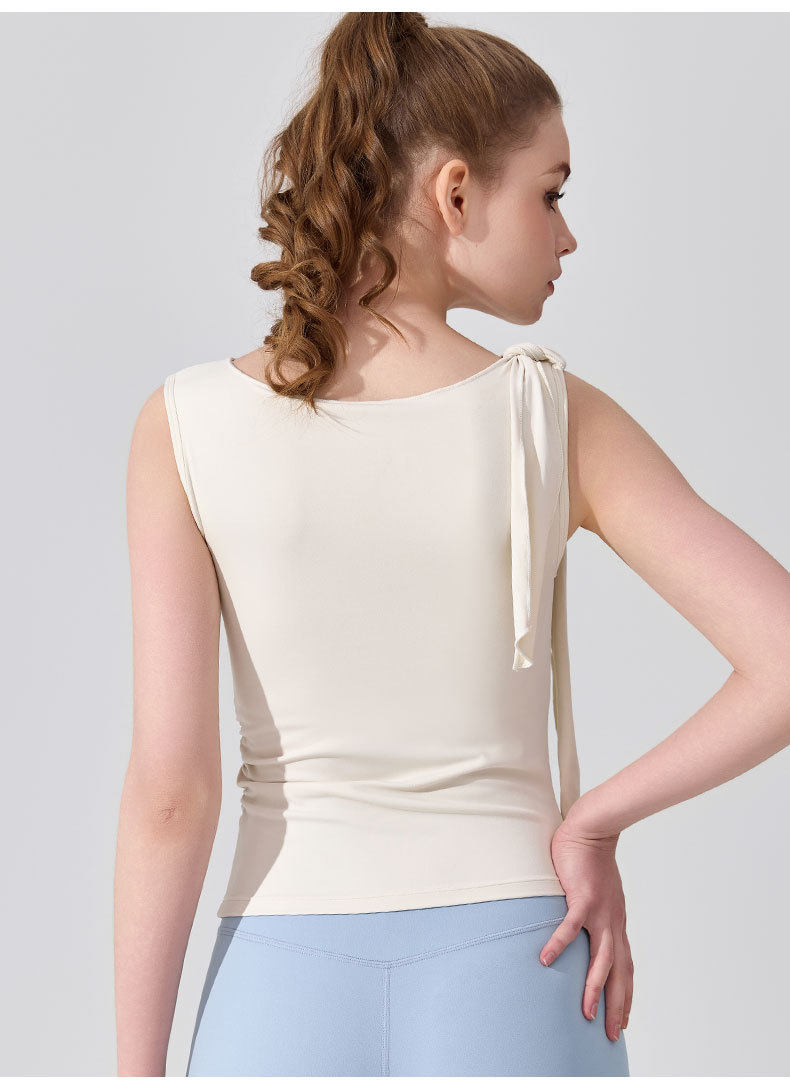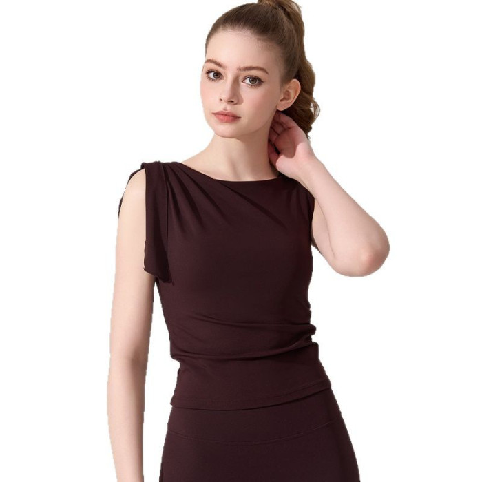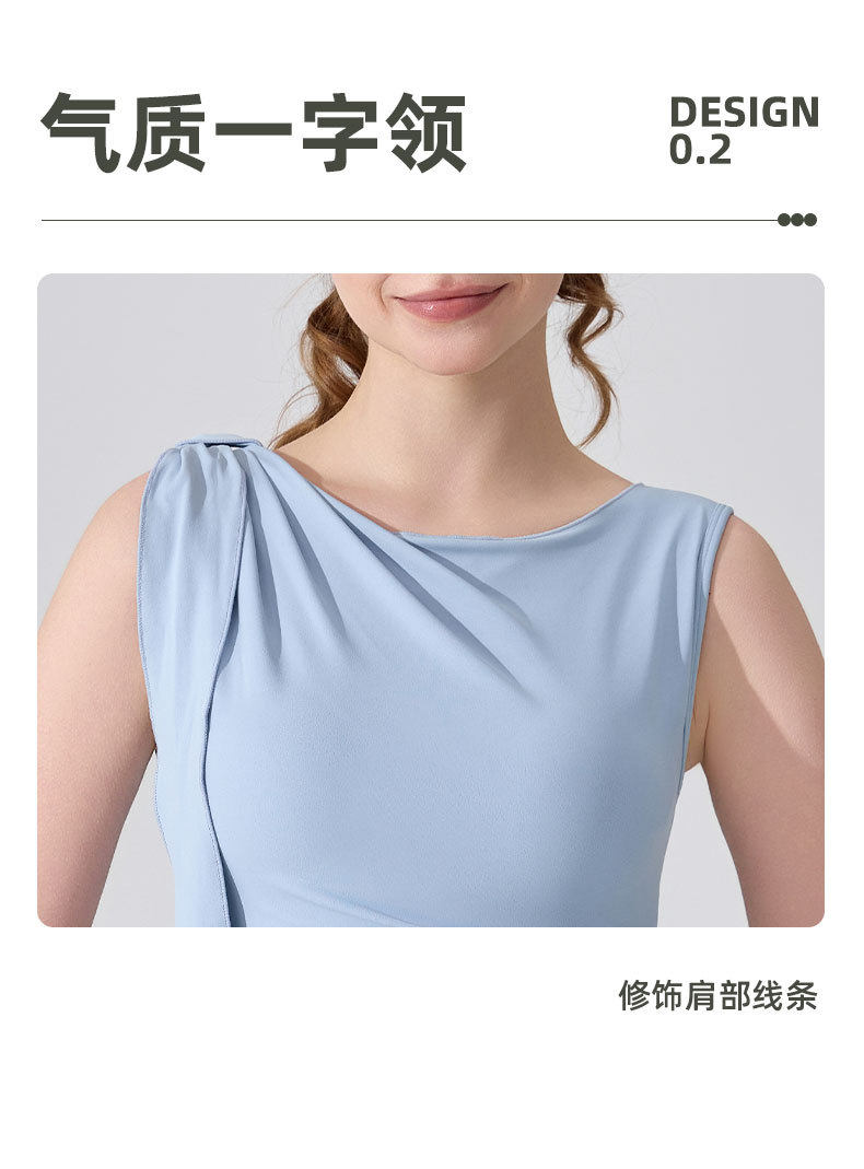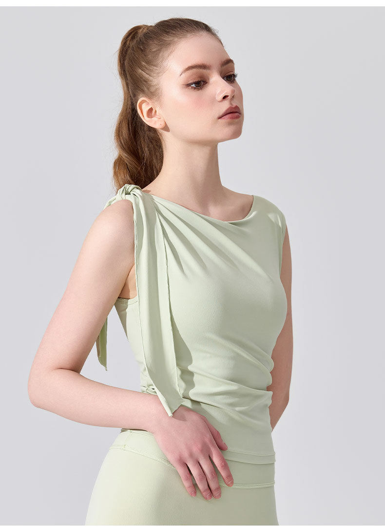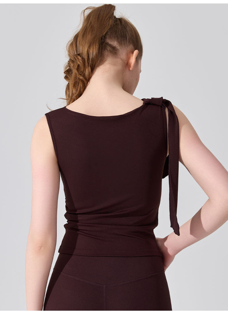 2025辣妹不規則斜肩綁帶T恤女夏帶胸墊肩部扭結無袖打底瑜珈背心