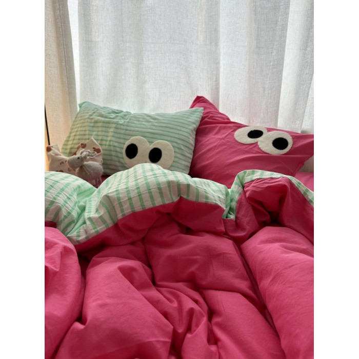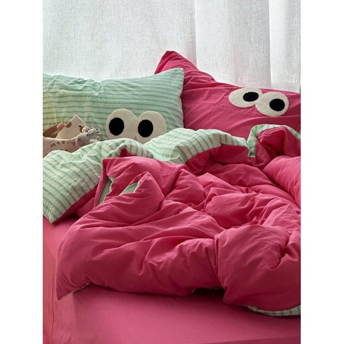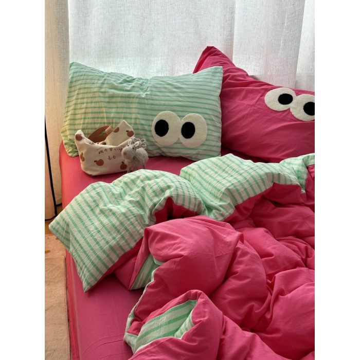 多巴胺配色少女玫紅拼條紋混搭風水洗棉床上四件套床單學生三件套