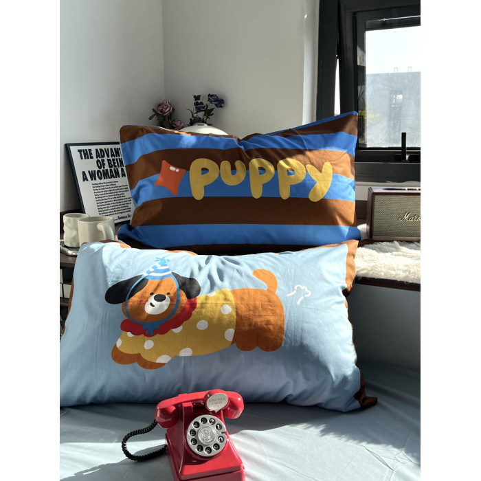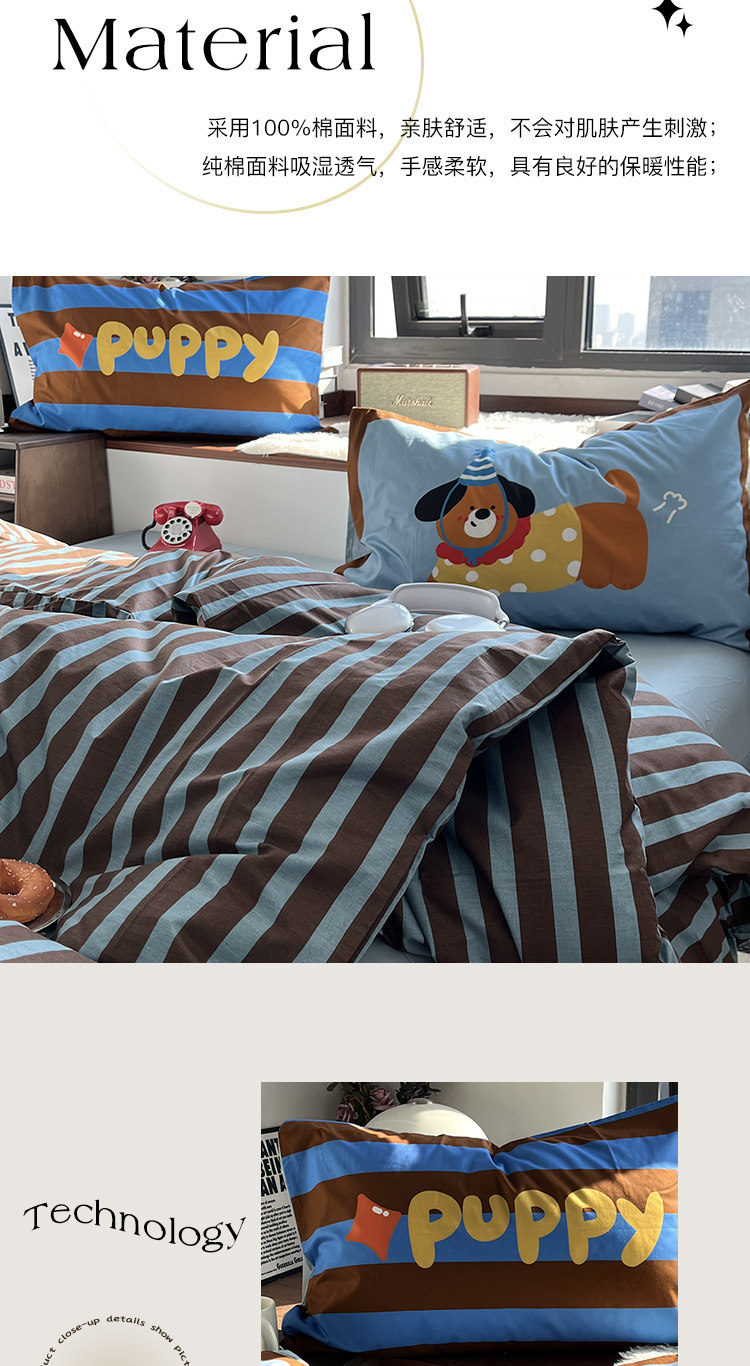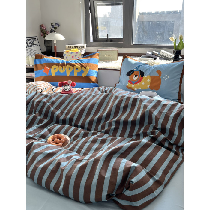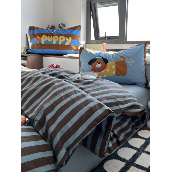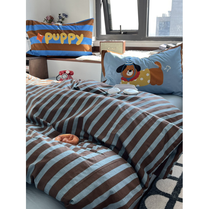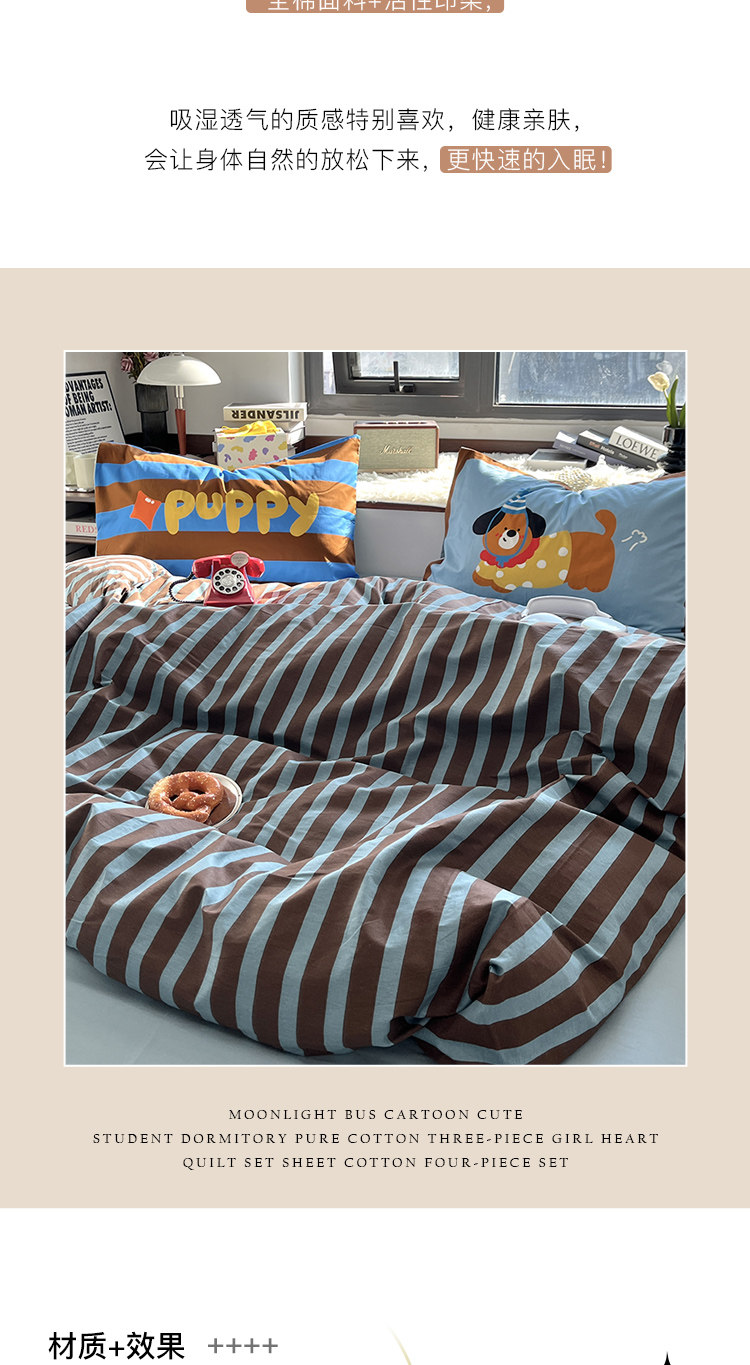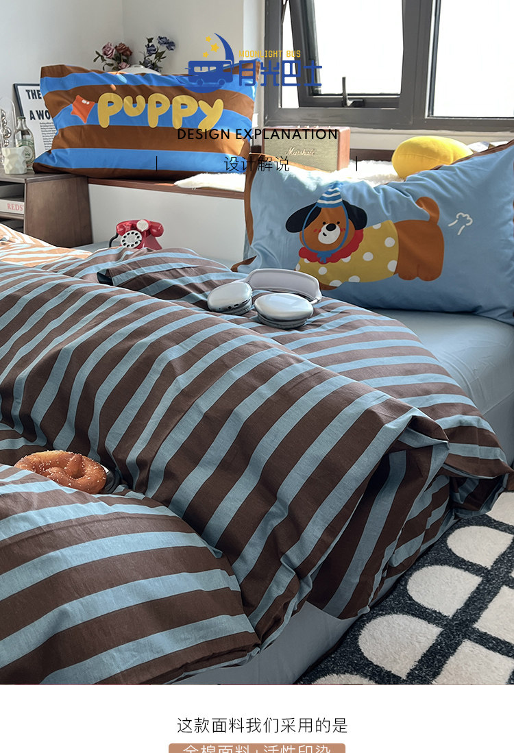 月光巴士簡約藍咖條紋小清新春夏床上四件套1.5米1.8床單純棉被套