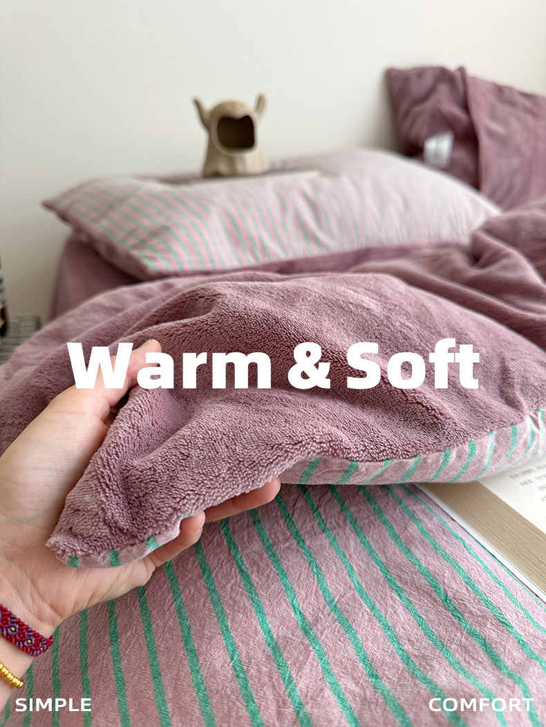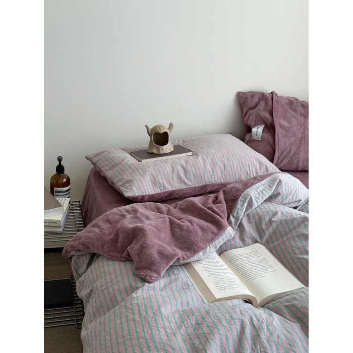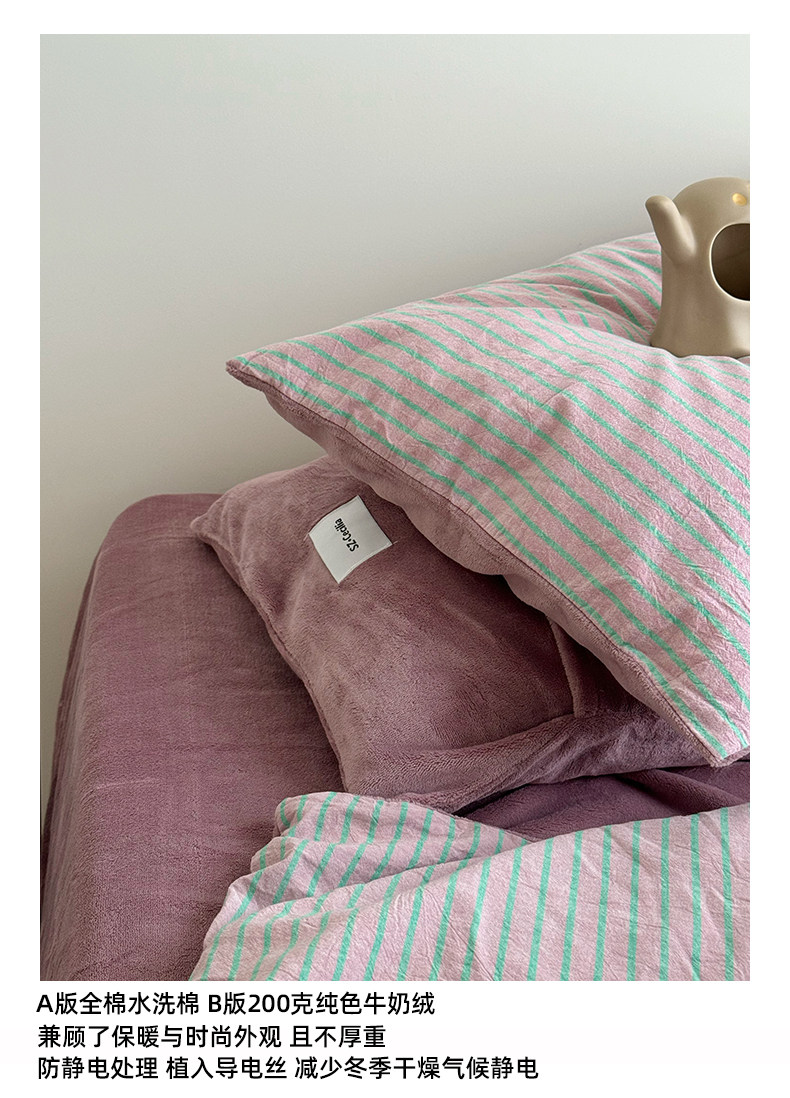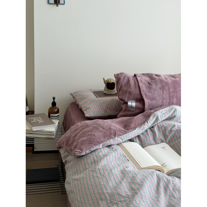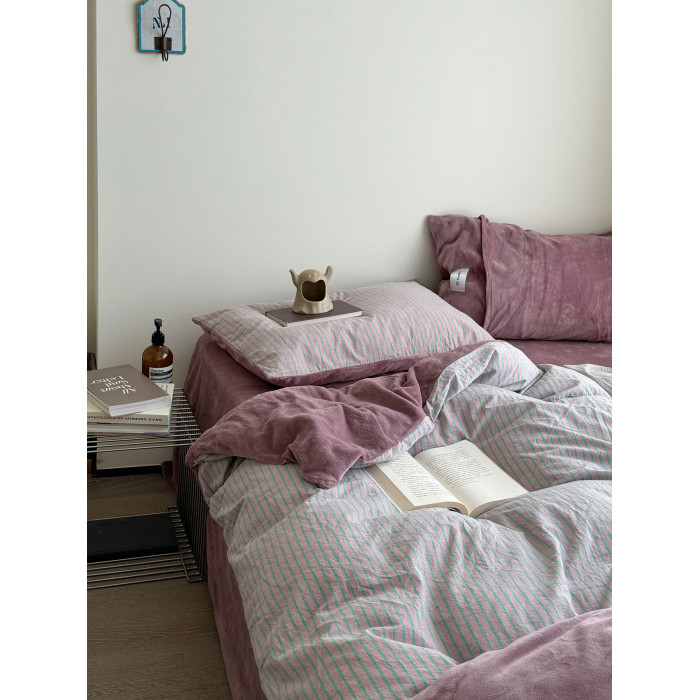 YAKEHOME【沉默織物】復古粉紫色條紋全棉加牛奶絨四件套純棉床單