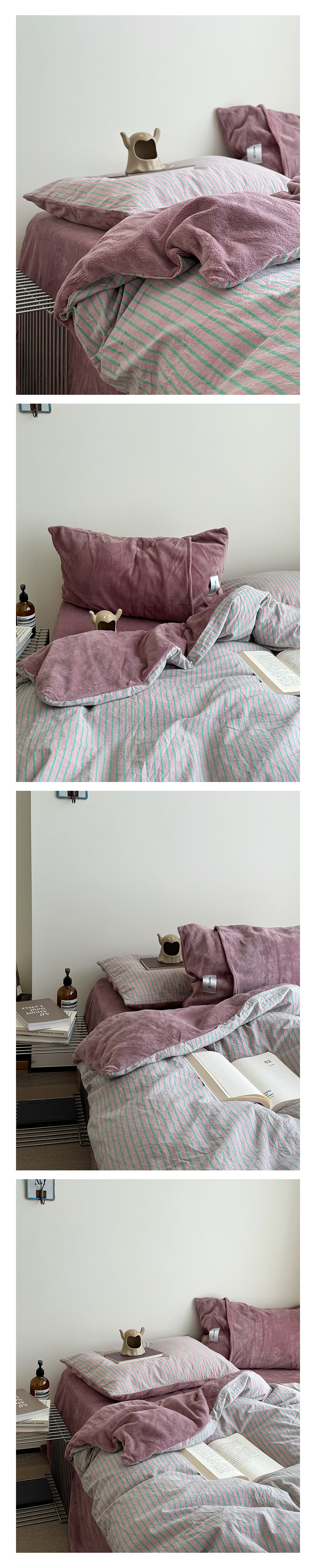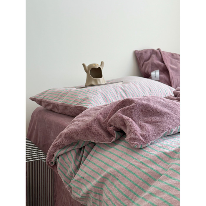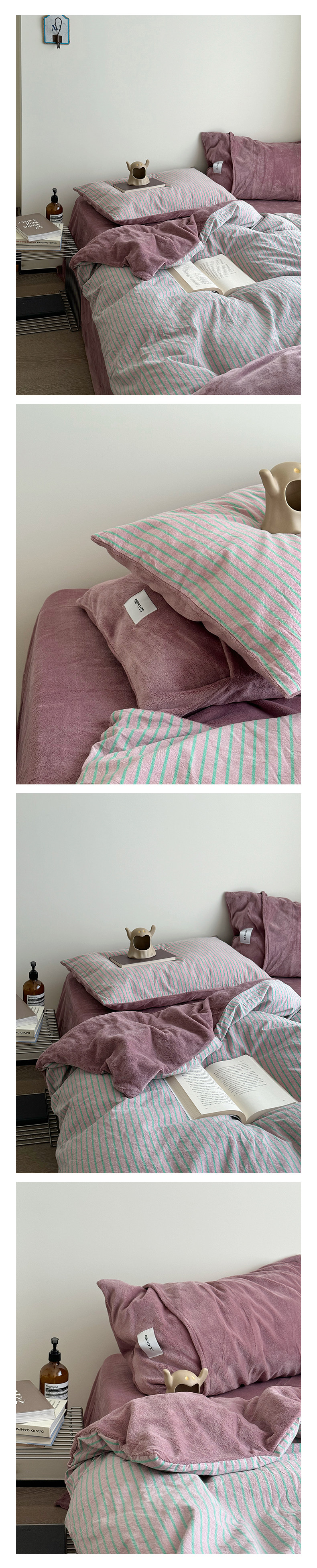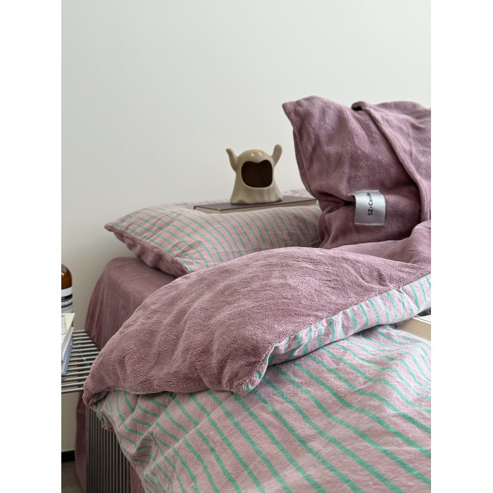 YAKEHOME【沉默織物】復古粉紫色條紋全棉加牛奶絨四件套純棉床單